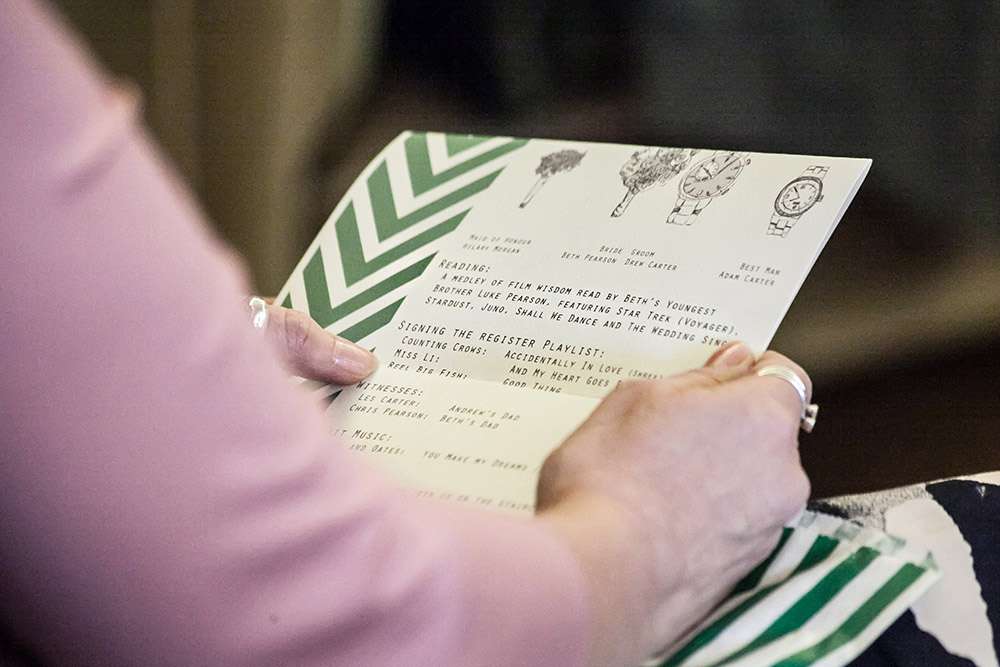 “We didn’t follow any traditions that we didn’t want to”, began the bride. “Things that were not important to us were chopped straight away. It meant that we were both looking forward to all of the day. Drew is not a fan of dancing in-front of lots of people, so we went for a more chilled atmosphere and added in a movie music quiz, like a round from a pub quiz. Drew secretly made a playlist of music featured in films, and in table teams Beth and the guests had to work out which film each song came from. It was a nice interlude between courses and gave us all a good giggle.”