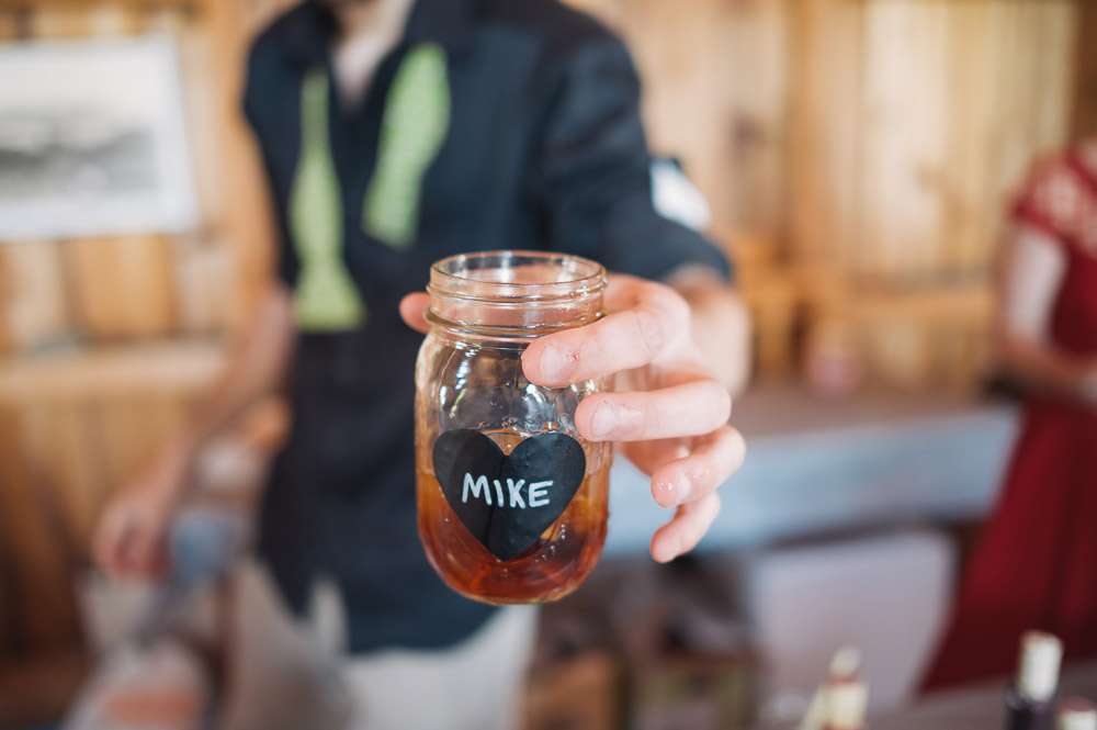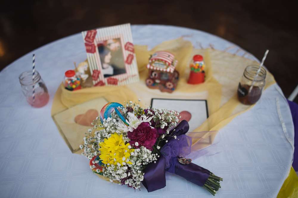 “We splurged on candy and prizes for the games and décor”, she continued. “We wanted people to have lots of fun and yummy stuff to take home and make the wedding a better carnival experience. Guests enjoyed playing carnival games during cocktail hour and munched of classic carnival snacks like popcorn, cotton candy and snow cones. Tables for the BBQ style lunch were covered in all different old fashioned candy for guests to take home and people sipped from mason jars that had their names on them.”