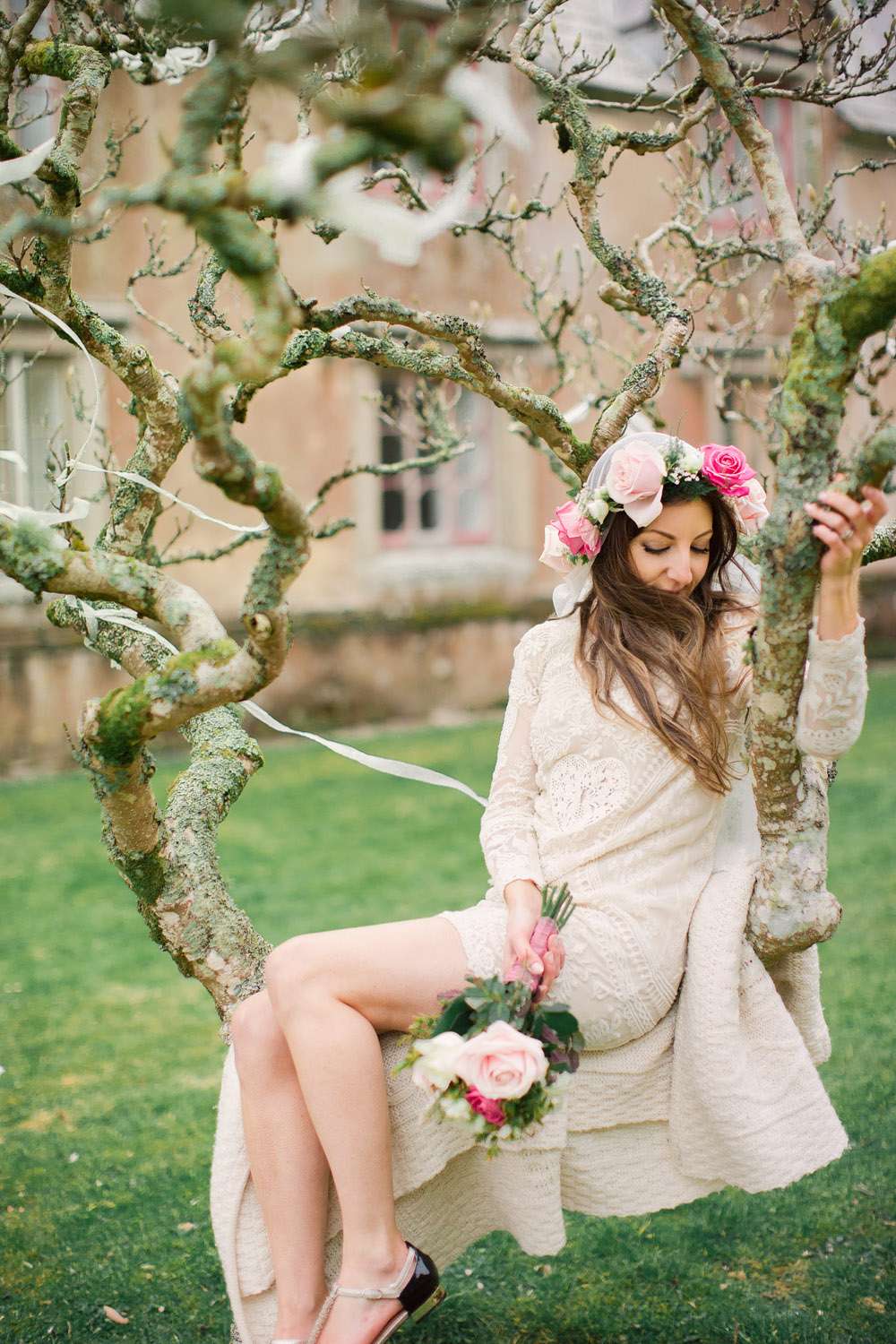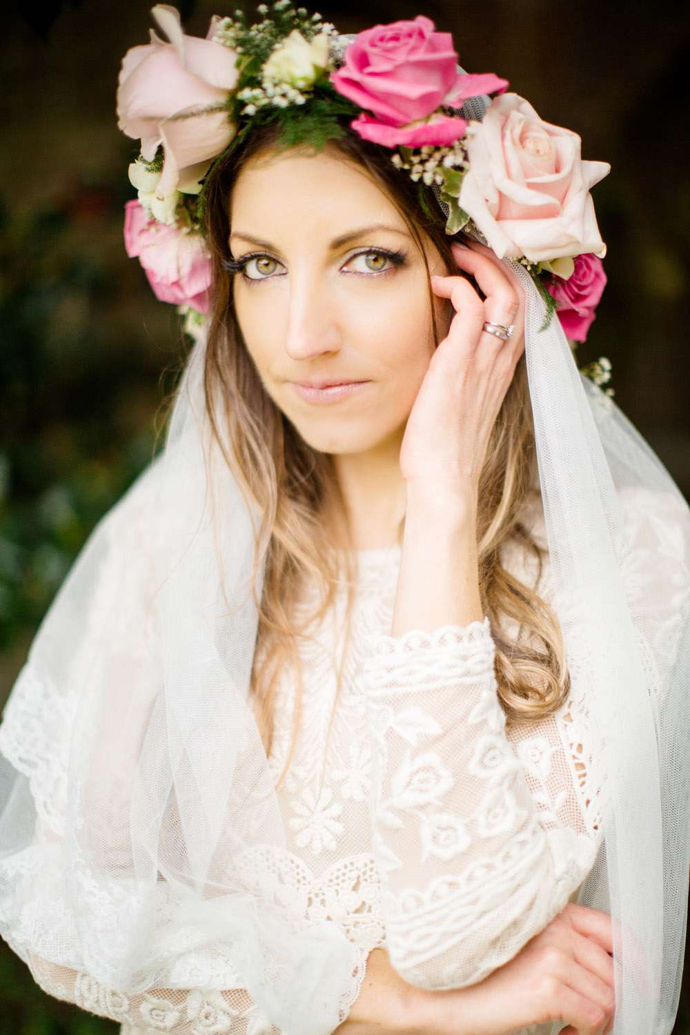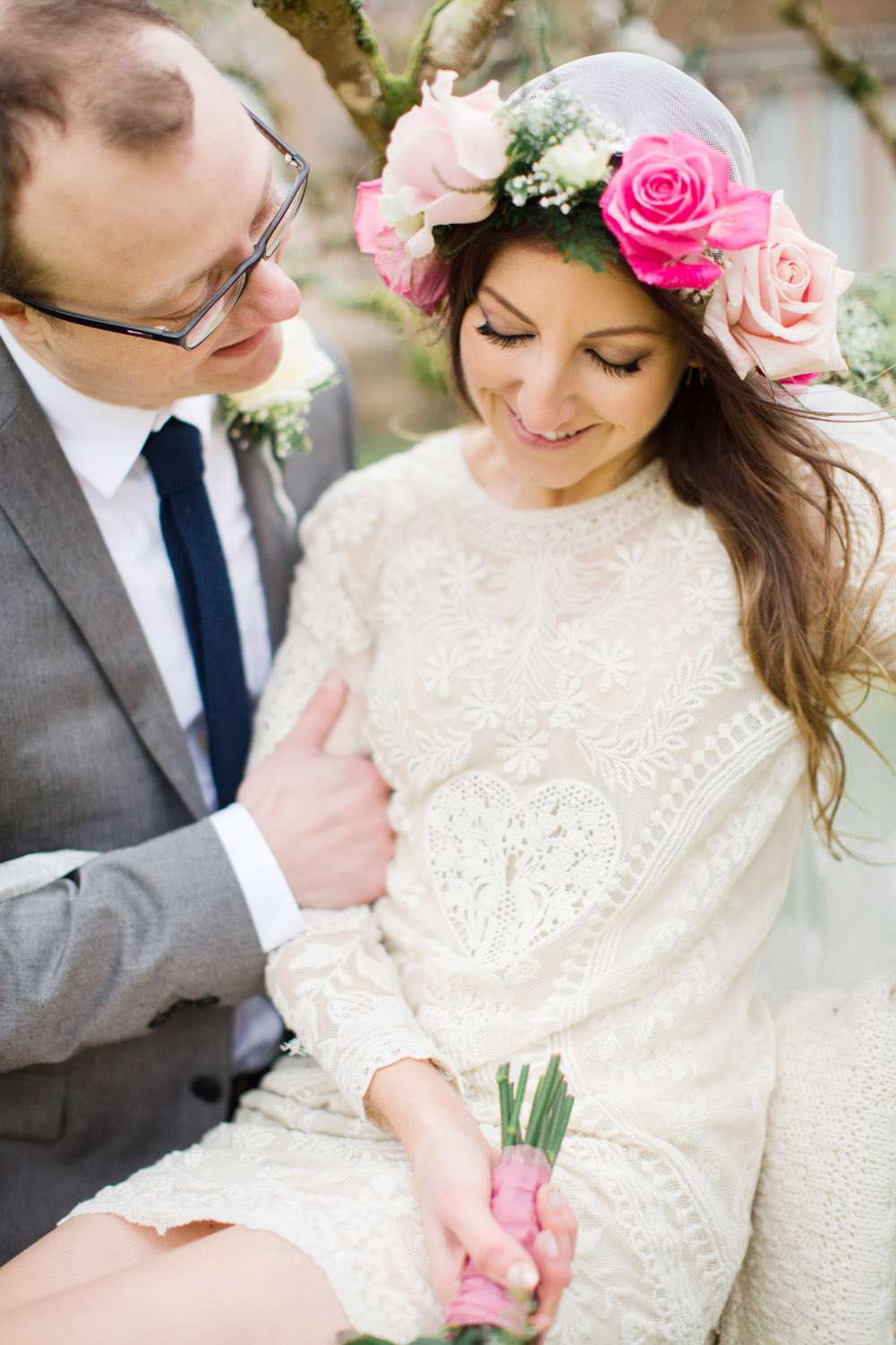 “I didn’t wear a traditional wedding dress and Matt didn’t wear a suit”, she continued. “I came across my beautifully embroidered Isabel Marant ivory mini dress in Selfridges. I wore this with some Chanel sandals. I’d always had in mind that I wanted to wear flowers in my hair. I think I am a bit of a hippy at heart. Our florist made the stunning head pieces for myself and our flower girl, as well as the pretty wrist corsages for the bridesmaids. At the last minute I felt I wanted to add in a bit of tradition and bought a lace trimmed veil which sat under the headpiece. I think in the end the whole look was a bit of a mix of eras; 1960s beachy Californian and also reminiscent of a 1920s Cecil Beaton photo, as one of my bridesmaids observed.”
