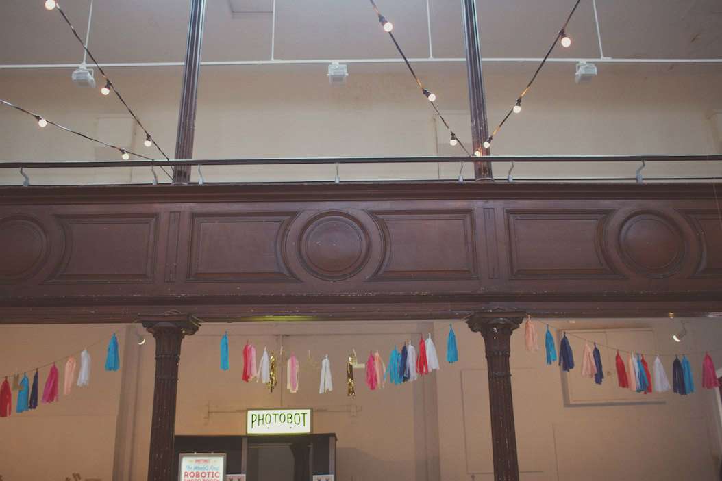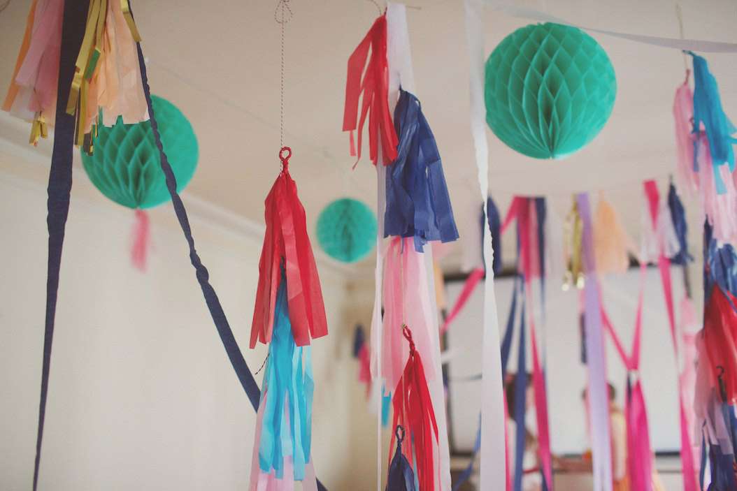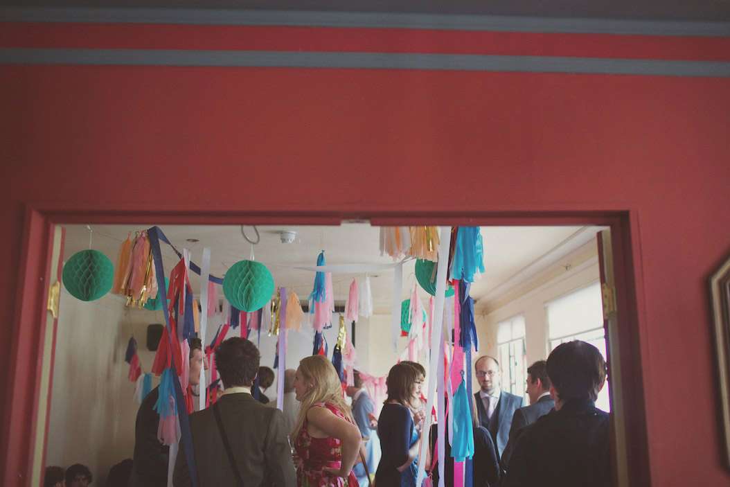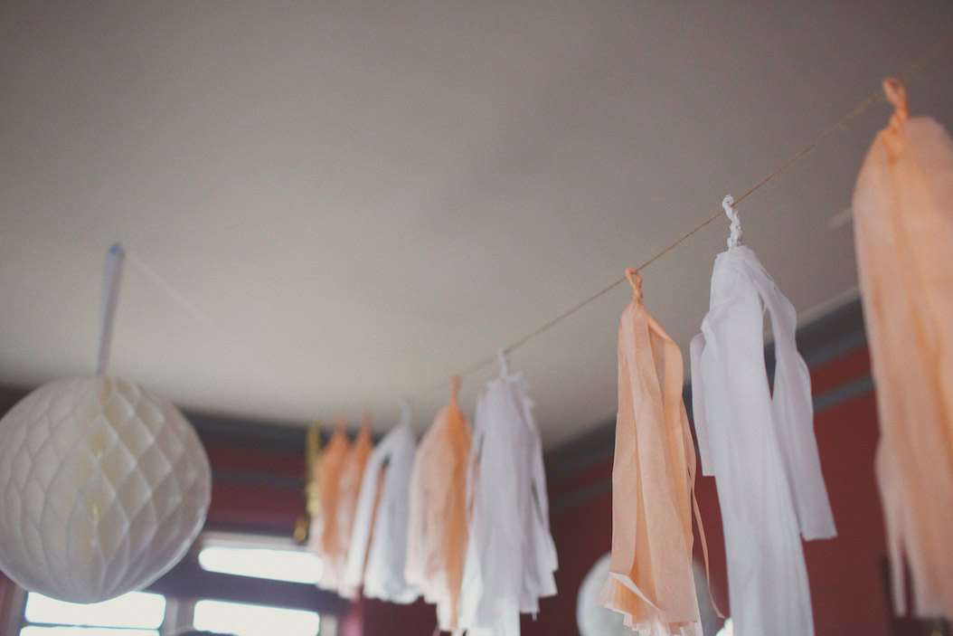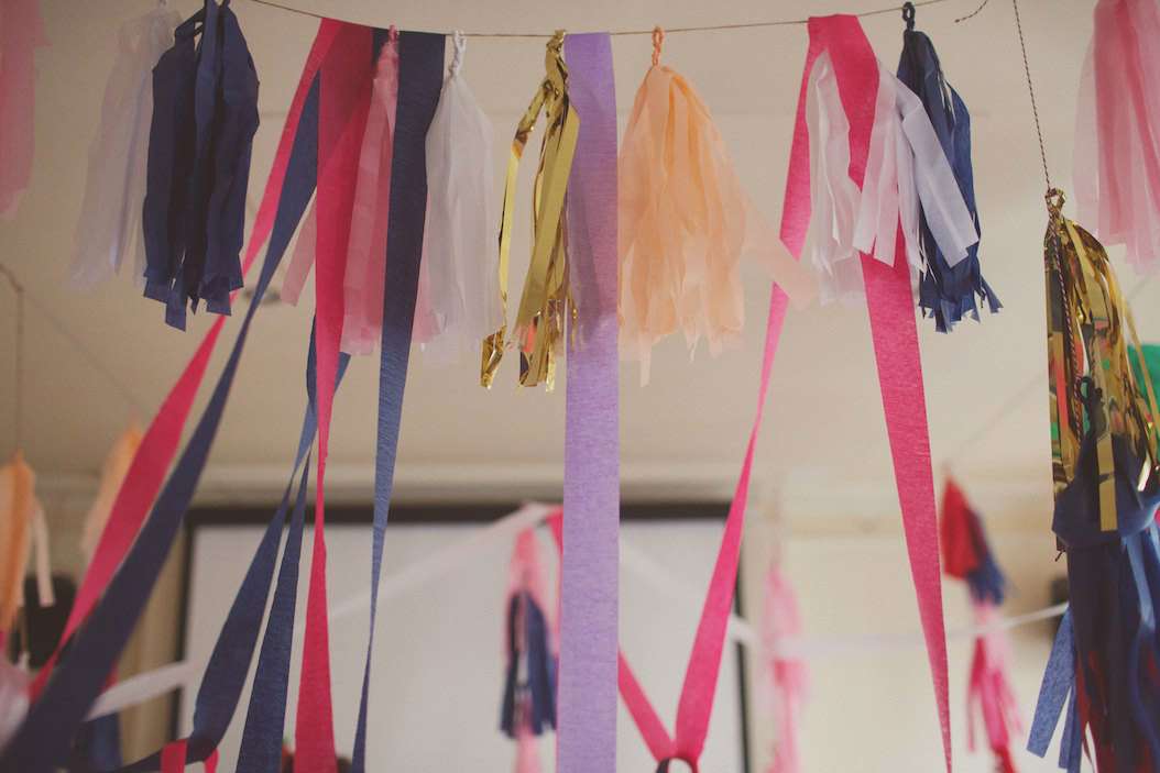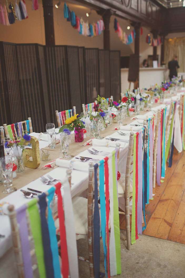 “We loved the idea of hanging ribbon on the back of chairs – something we’d seen on Pinterest. We assumed everyone used ribbon but when we priced it up it would have been hugely expensive. Instead, we bought rolls of crepe paper streamers that were much much cheaper. We cut the lengths and looped them round the top bar of the chairs, then fixed them with glue dots or double sided tape. It sounds like a really obvious material to use and method now, but when we first set our heart on them it took a bit of fathoming!”