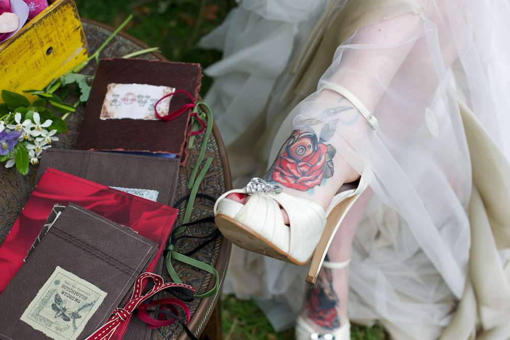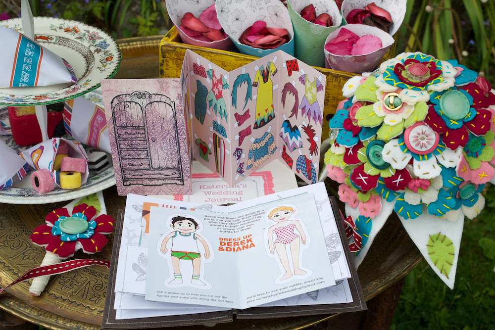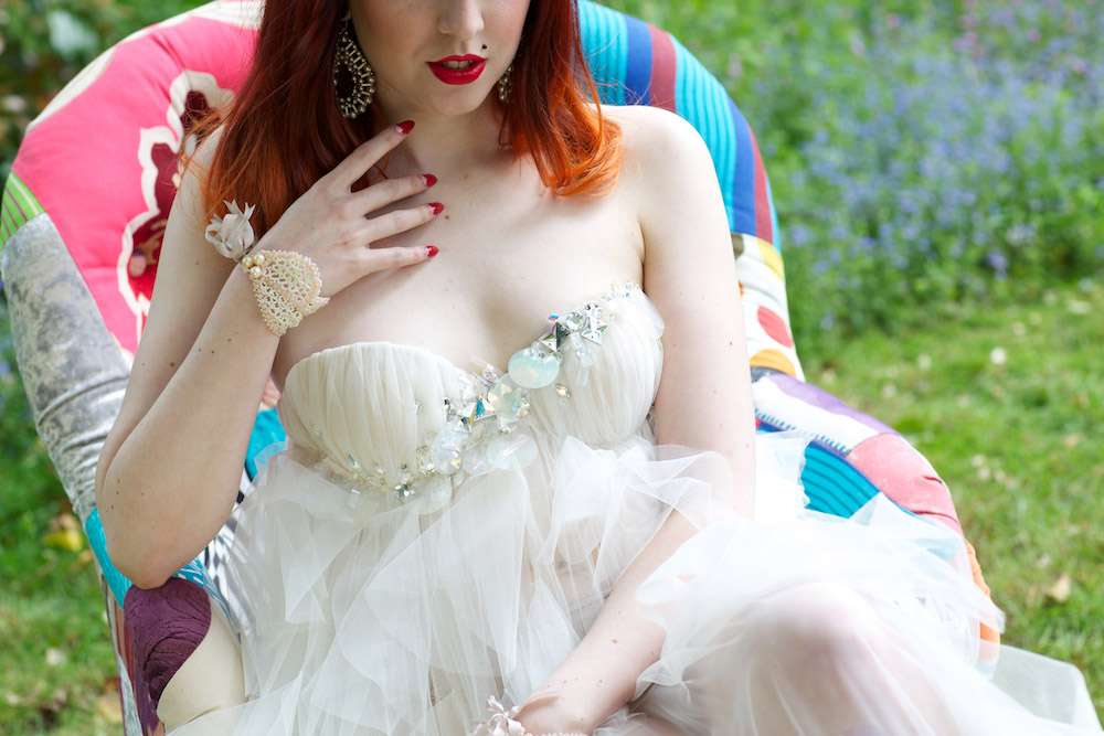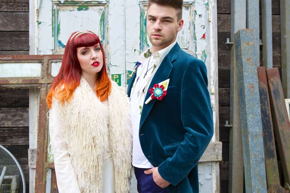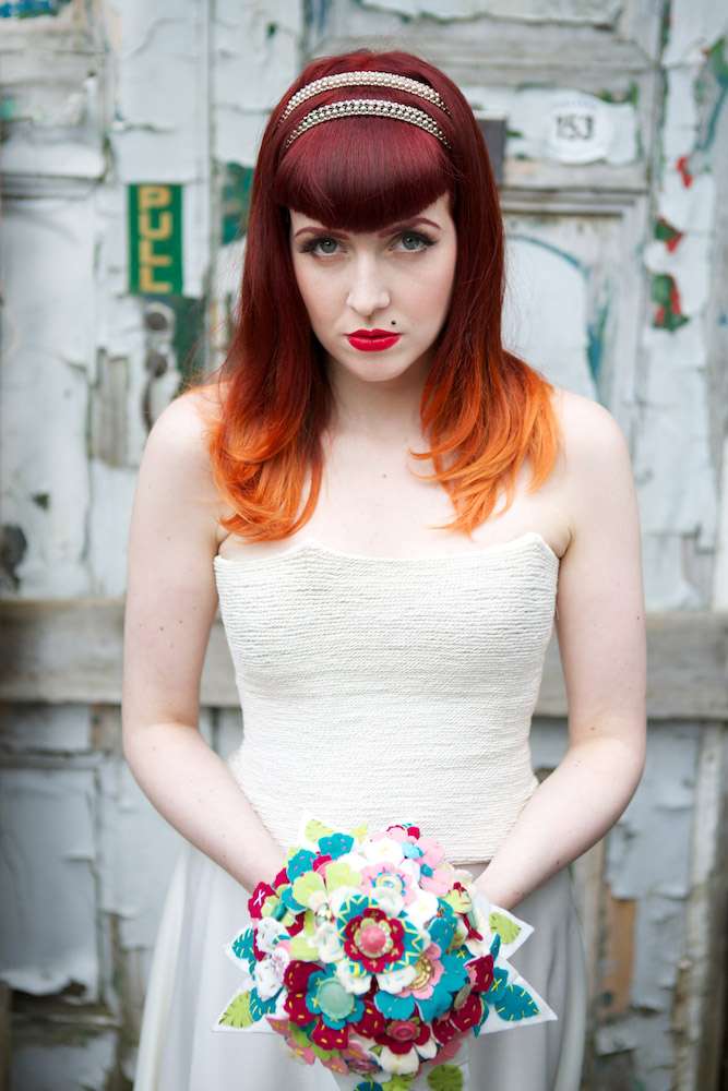 The chair by designer Kelly Swallow really was the staring point for this shoot. From there she had button bouquets made, stationery with an scrapbook vibe and dresses that push bridal boundaries. “I wanted to showcase my work and things I loved”, she concluded. “I’m really happy with how the shoot turned out. I wanted to show brides that by letting go of that idea of one limiting colour shade, they can select elements they love that still work together and add a contrast to their amazing choice of wedding gown.”