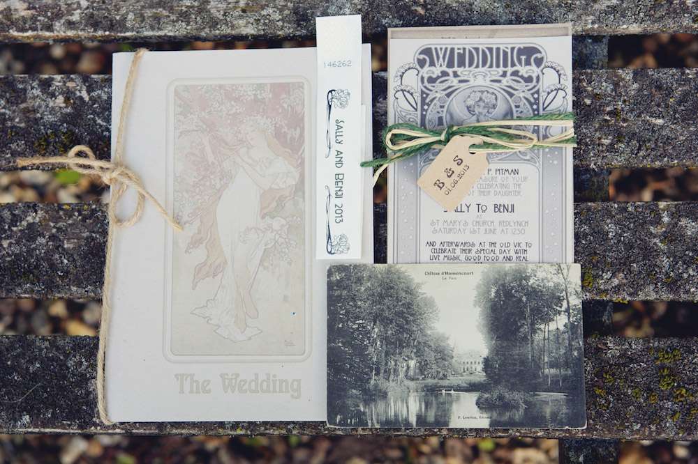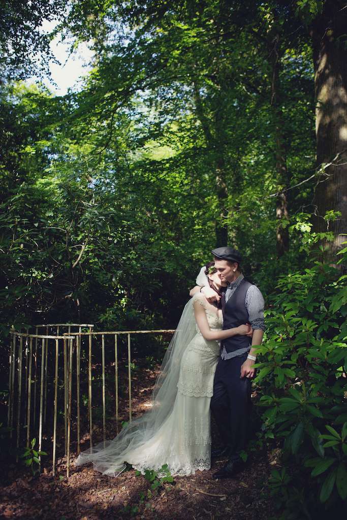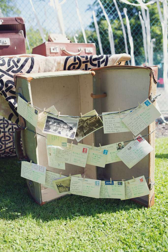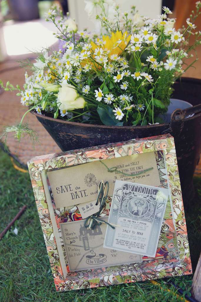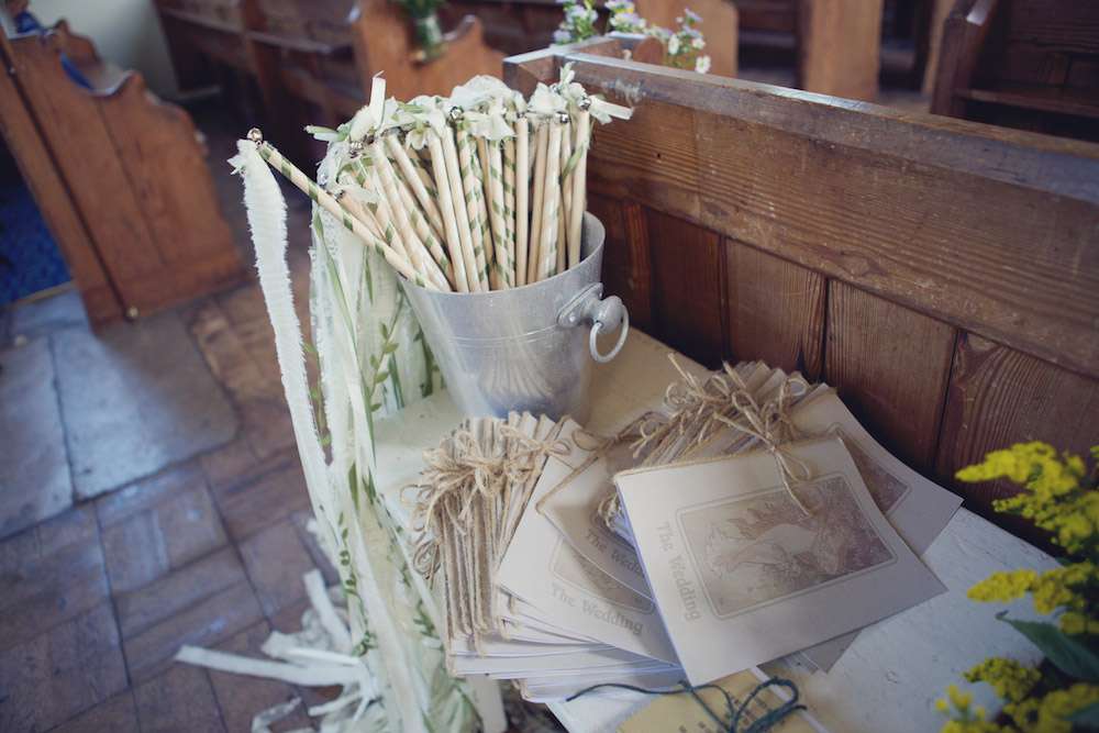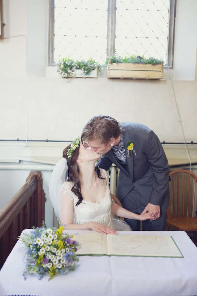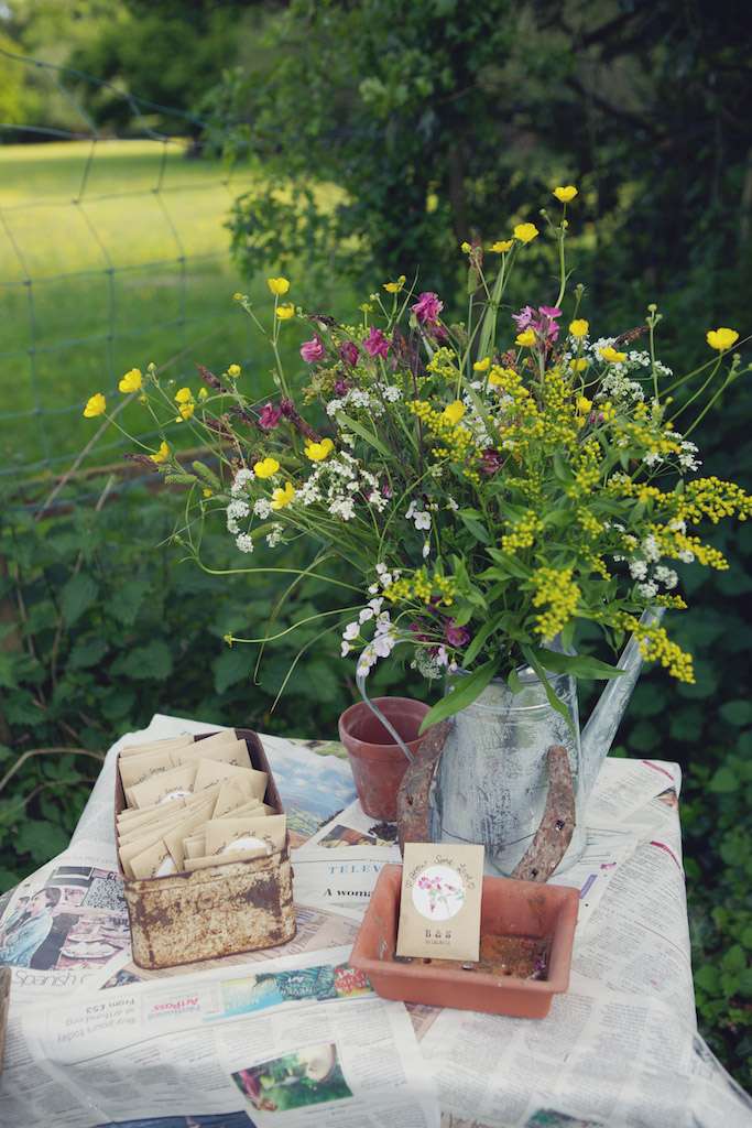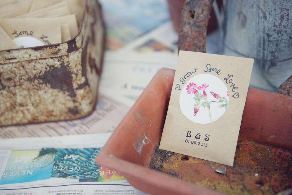 “We also went to a ‘pick your own’ and picked enough strawberries to do a massive batch of jam for favours, and some cherries too. I bought some trim, ribbons, and funky fabric from the laines in Brighton and dressed the jars up, then wrote some labels. I dressed up that table with a load of old suit cases and the RSVP postcards from everyone. Other favours I did were little packets of wildflower seeds in envelopes from Amazon, I also bought an old botany book from eBay and cut out circles of flower illustrations to stick on. We displayed them on an old school desk covered in newspaper and plant posts, tins and soil.”