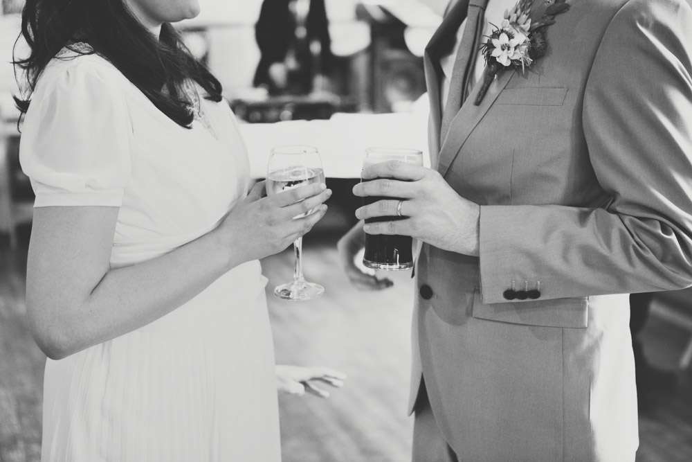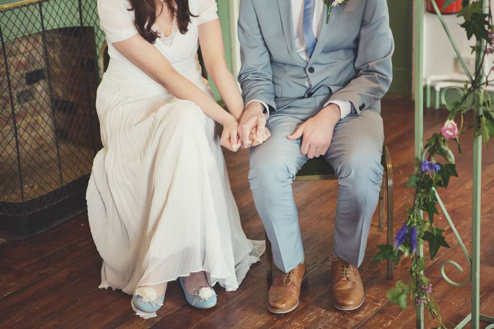 “We saved money on items like place names and the seating chart as we made these ourselves. For the seating chart, we stuck pictures of our favourite album covers onto fabric and covered it all in a large frame. We particularly loved having a Kate Bush and Scott Walker tables at our wedding! For the individual place names, I bought some really cheap luggage tags from Etsy and borrowed a beautiful stamp set from a friend. There were letter stamps and cute birds and birdcages It took a while to make everything but I think they would have cost a lot of money had we bought similar items ready-made.”