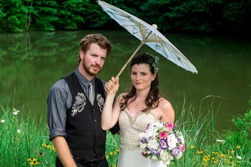 Lauren and Red’s Pennsylvania wedding was a real team effort. It planned by the bride, her mother and their neighbour Patience. The wedding was held on the couple’s own farm. “Patience taught us how to make homemade limoncello and smoked salmon and helped so much during the wedding making sure things ran smoothly”, Lauren explained. “My mother is a crazy collector of beautiful dishes, as well as ideas. She is also a food connoisseur so she helped add tons of vision and plan the menu. Patience’s daughter got married the weekend before so we were able to share a lot of supplies and ideas which worked out very well as well as work trade. My mother in-law Eva planned the rehearsal dinner which also happened to be my birthday. She created a picnic outdoor super with barbecue chicken for 45 two days before the wedding. She also helped decorate!”