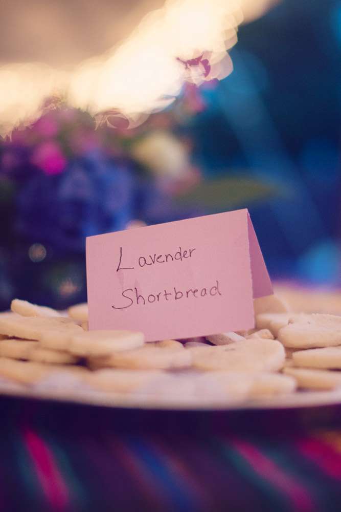 “I used extra handkerchief invitations which were seconds to create banners to hand on the bar and around the milk shed which was a focal point”, she continued. “I took lace doilies and used them as banners as well. I planted a lot of flowers and used props in the gardens for added interest. I used chalk board paint to create blackboards with the itinerary and menus. I used a lot of fabric to decorate behind the bar. I found a lot of old rusty tools, license plates, signs, hooks and lights to create a cool vibe in the bar. I used an old parasol filled with lights as a makeshift chandelier in the bar. I spray painted about 75 plan white parasols with different layers of color and pattern using lace material as a stencil as favors. I also had about 350 jars of homemade jam in sample size jars. I bought the sample sized jam jars from jars.com for $.25 each, and my friend and co-worker Tamara, who is quite a talented food lady made the different types of jam over the course of several weeks. We had violet, rose petal, blueberry spice, and redcurrant.”