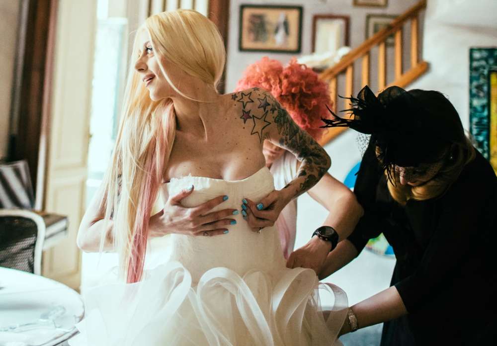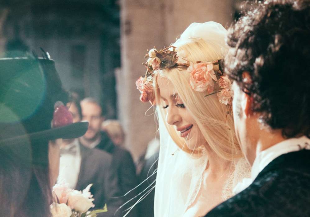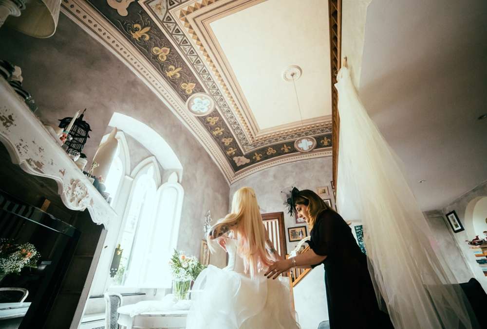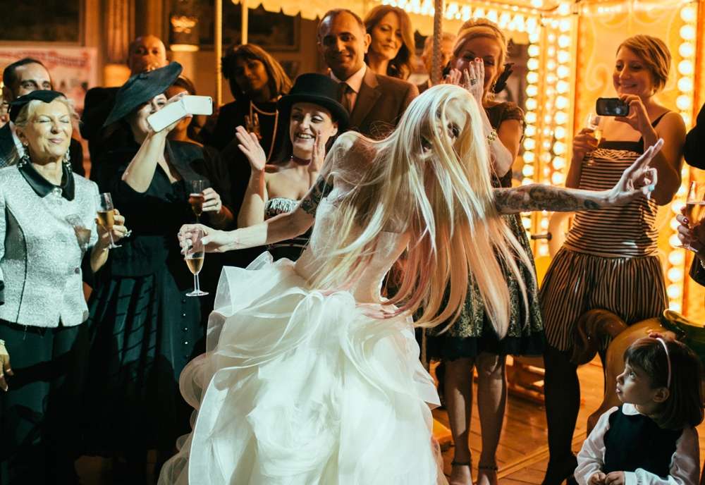 Francilla wore a stunning Vera Wang wedding gown and Aruna Seth shoes. She made her headpiece herself. “Over all we wanted to bring fun, creativity and insanity in a historical place to our wedding,” she concluded. “Our cake was crazy too. I didn’t want a normal wedding cake, I wanted a cake bomb! It was MASSIVE and when it was wheeled in we all danced to Sex Bomb! I think this made us very Rock n Roll! We feel different to other people and we live our lives the way we want. We swore to each other to remain this way forever. Our wedding is just the beginning.”