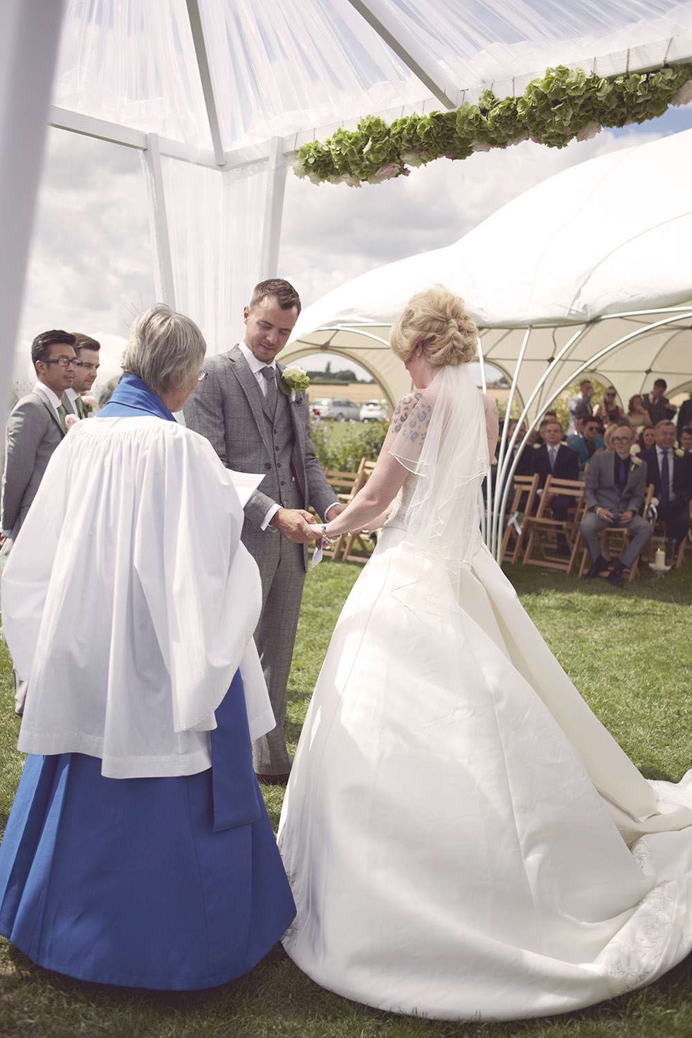After their small legal ceremony at Bletchley Registry Office, Hannah and Craig hosted their wedding in Craig’s parent’s back garden. They had a blessing followed by a marquee reception. The bride wore two dresses. The first, which she also wore again for dancing at the end of the night, was a bodice and skirt from BHLDN. Her second, more traditional gown was from Trudy Lee.