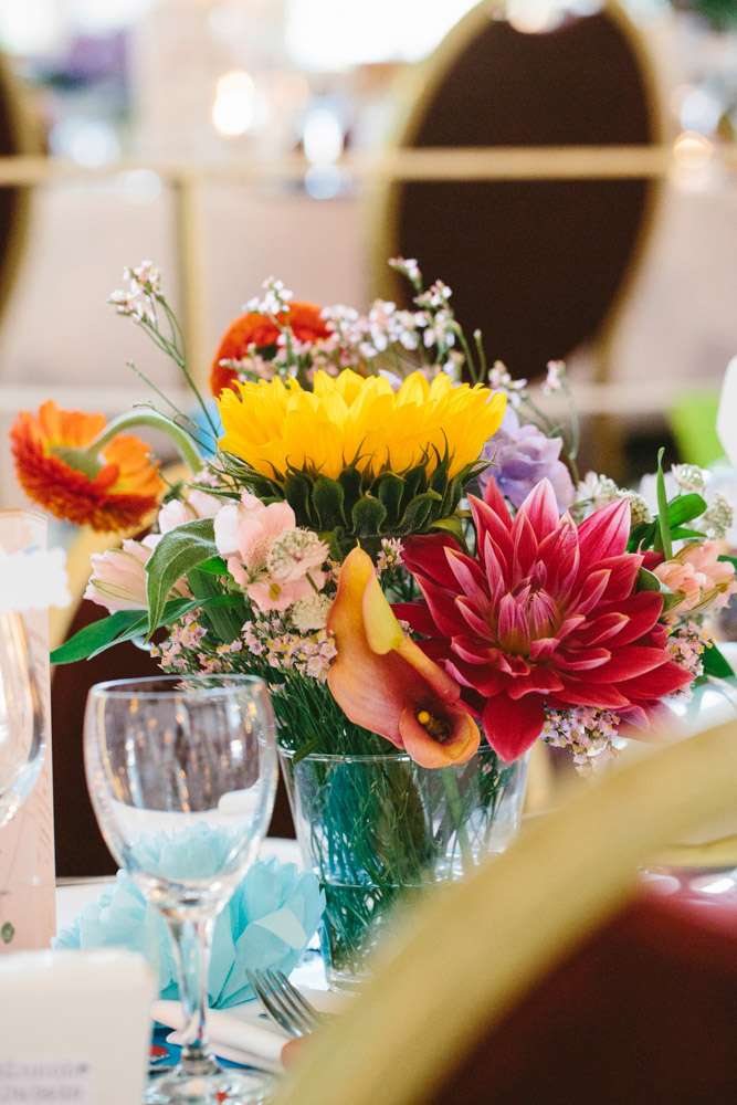 “Our place cards were made from this vintage fashion doll tutorial that I found online and our paper flowers were all based on this YouTube video“, she continued. “The glitter stars and hearts were cut out of plastic tablecloth which sounds easy but took forever and wasn’t very fun – they looked great though! I ordered handmade shabby chic frames from etsy in rainbow colours which held our table numbers. We bought vinyls to use as place-mats from eBay.”