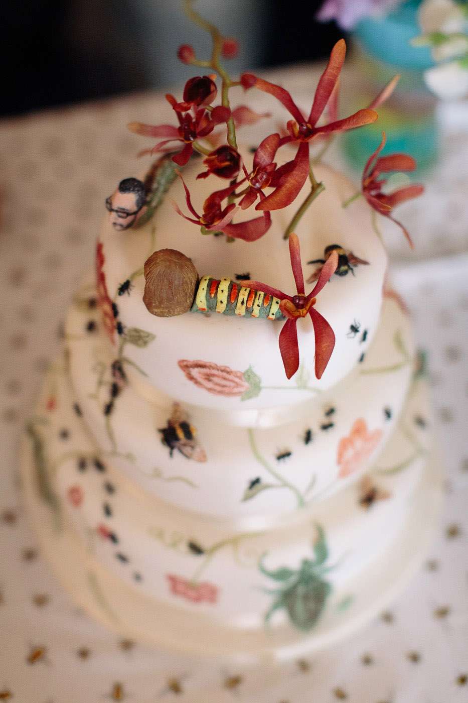 “I took the dress as inspiration for the cake which I painted with the same floral design. I made realistic bees, ants, wasps, leaf insects and caterpillars from black sugar paste and fimo models of our heads to go on caterpillars.”