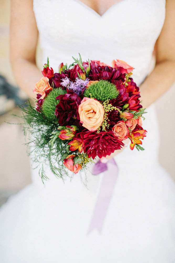 “Our biggest expenses were booze, lights, and music, without them, you have nothing, and with them, you have all you need! I tended to de-emphasize décor (it was easy because the venue is so beautiful and cool, both inside and out). The only real décor we had was flowers and we DIYed them. My friend Cameron is a talented florist and she did DIY flowers by going to the flower mart and pulling a team together of our family and friends to help assemble the day before the wedding. They looked beautiful and were perfectly in theme. I don’t think anyone knew they were Dollar Tree vases. We also almost forewent dessert entirely and at the last minute just ordered a couple hundred mini cupcakes, which were delicious and inexpensive.”