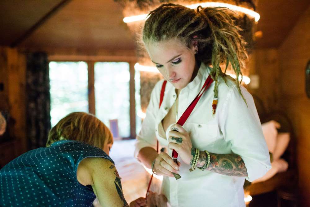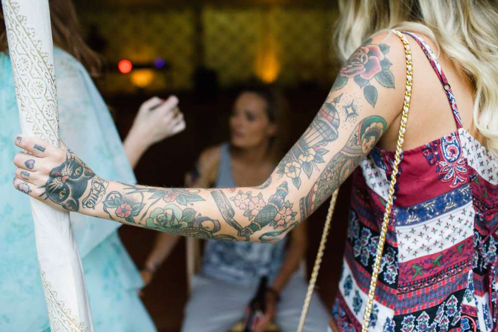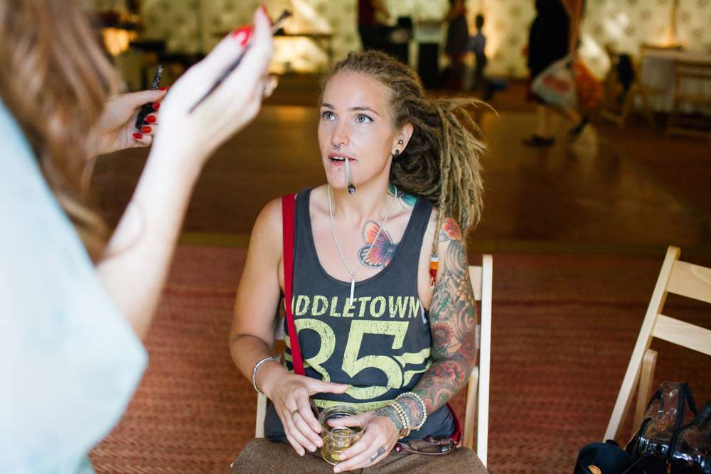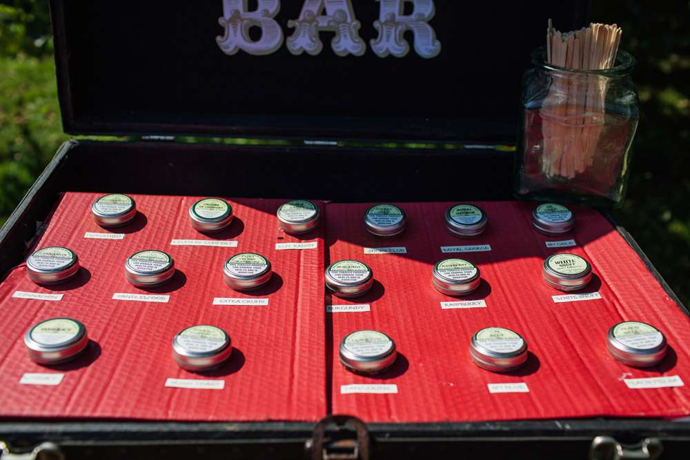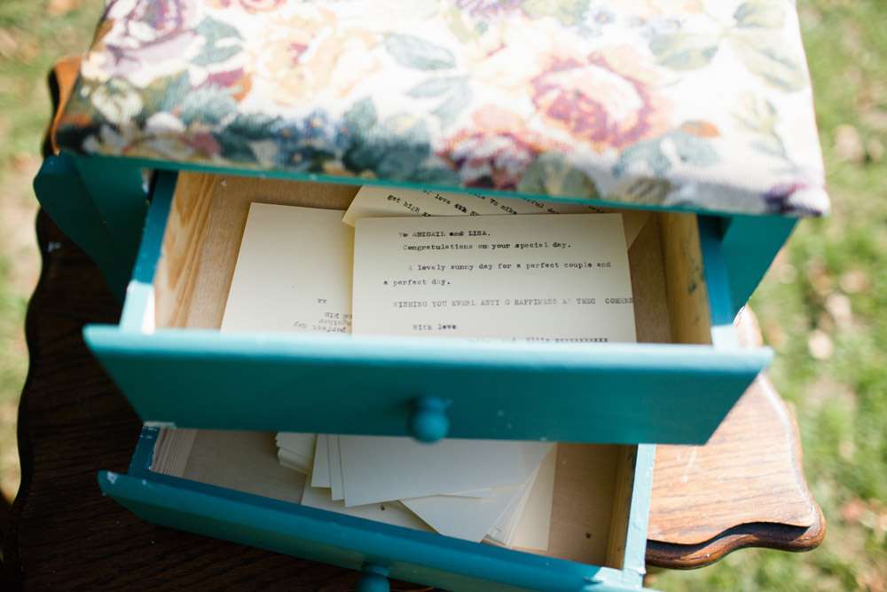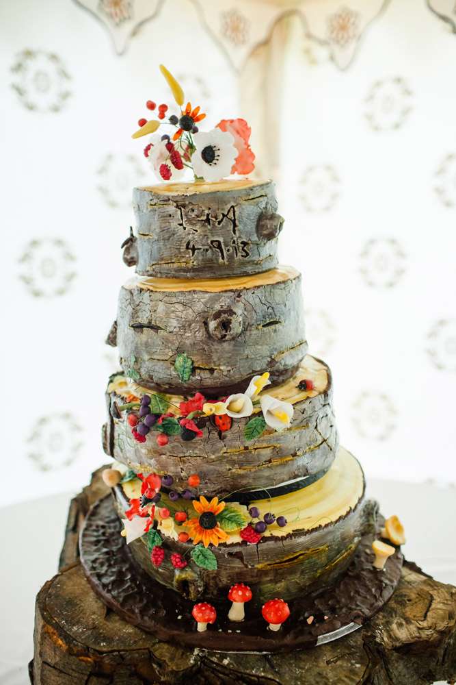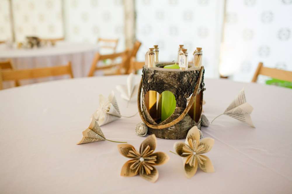 The theme continued with their tree stump cake (made by a friend), their hand picked flowers and the DIY hand stitched invitations. “All the reception décor inside the marquee was made from old books, these included heart bunting and flowers”, explained Abigail. “The tables had log style birch candle holders, paper flowers and personalised homemade matches. Outside the marquee, on the field, we had a homemade sweet stall and a seafood stall also made by us and my super mum. My mum also made a Moroccan-looking area out of two gazebos, which was a chilled out shisha pipe area. We wanted a Moroccan corner as I proposed to Lisa while we were there. We even had a snuff bar which went down a storm!”