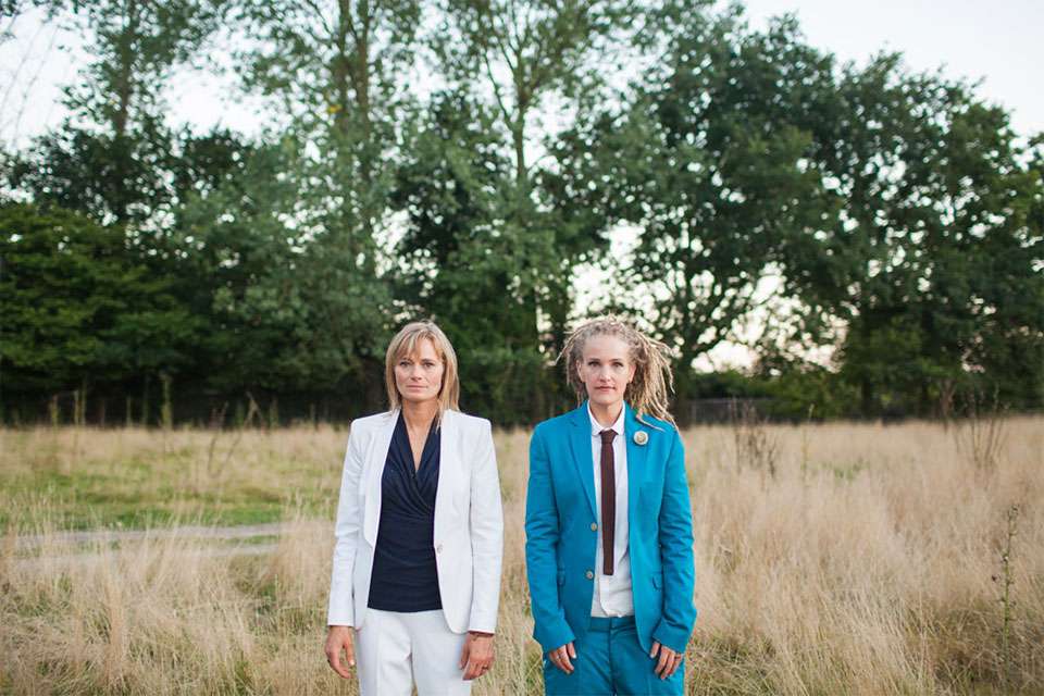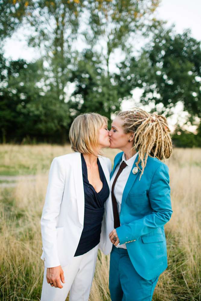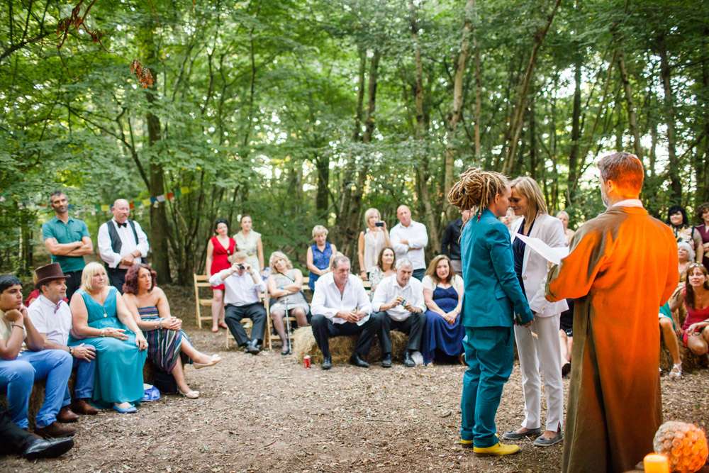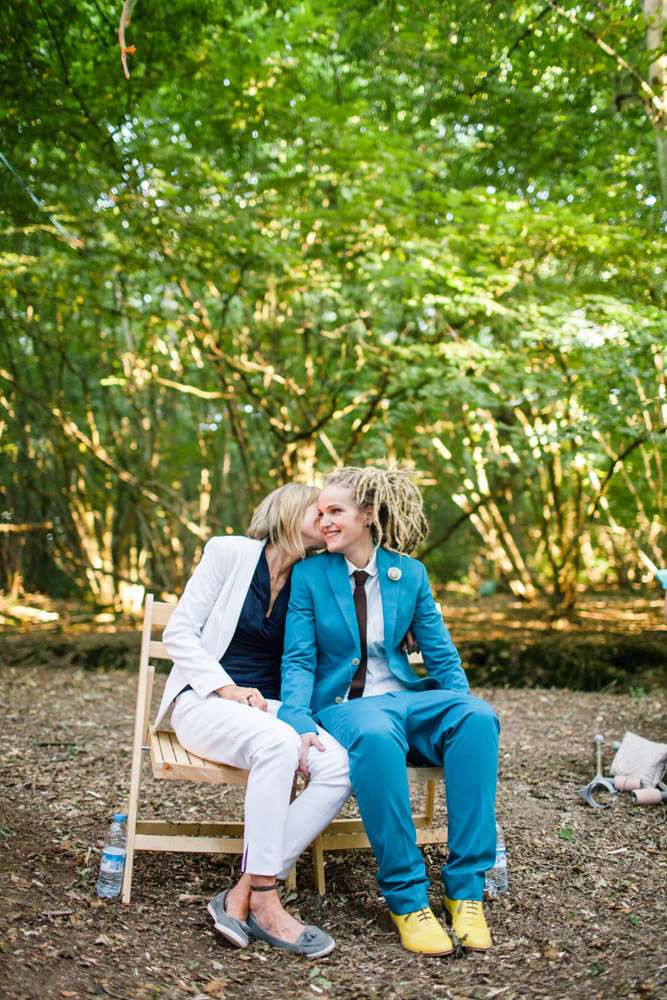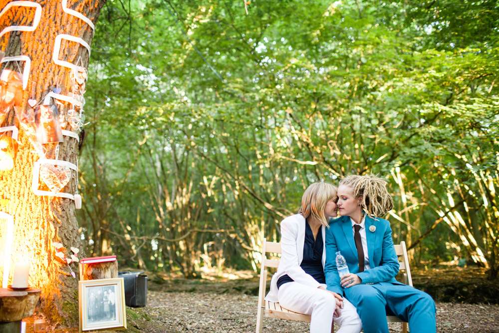 Abigail and Lisa’s wedding was eco, natural and laid back. Held at Wise Wedding Venue in Kent they did the majority of the décor themselves, or at the very least put their own personal spin on everything. Both girls opted for non-traditional wedding day outfits, and wore two suits each throughout the celebrations. To fit with the natural and eco wedding idea they even had wooden wedding rings.