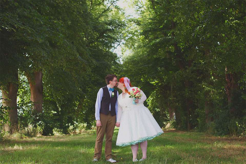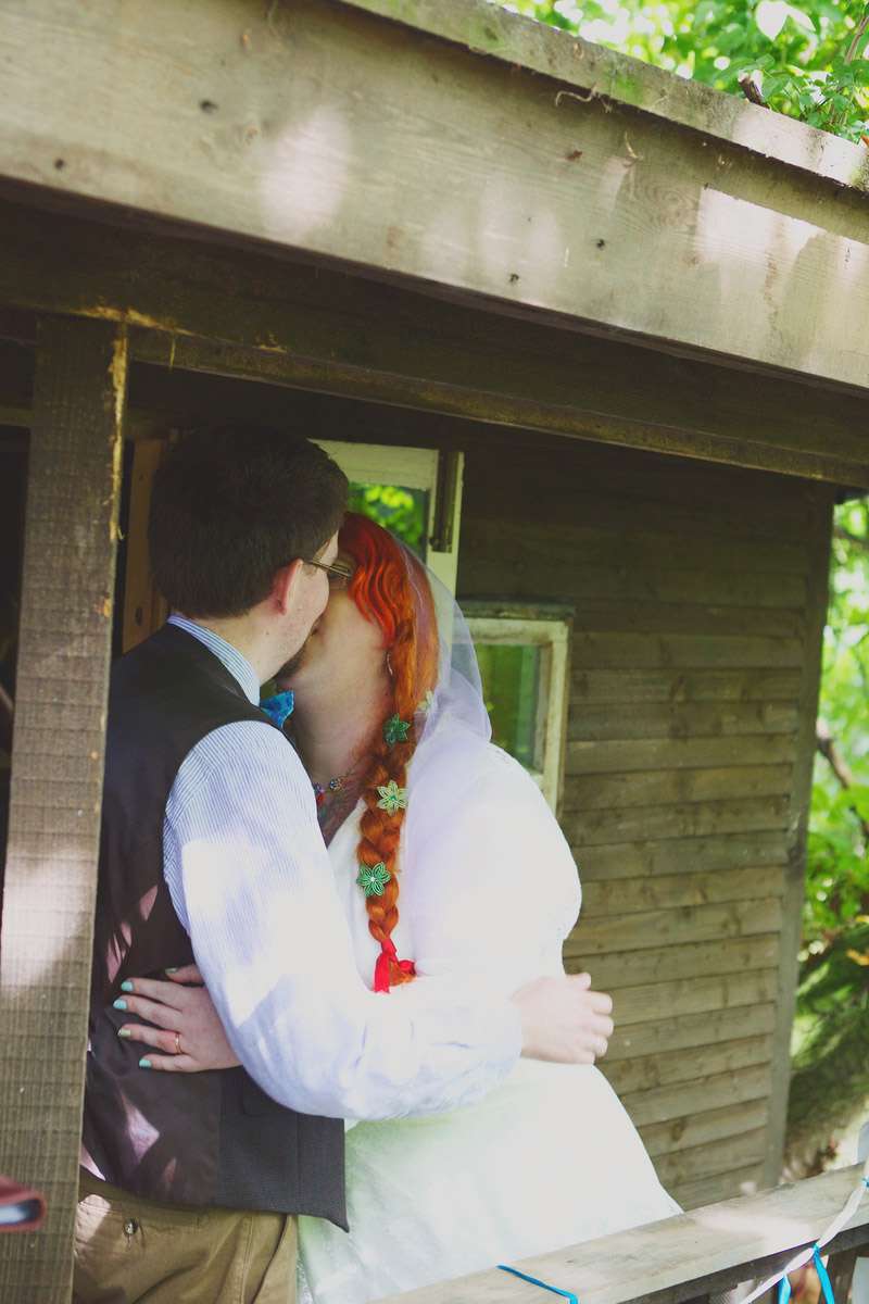 They met online and with a mutual love of all things nerdy (their first date was eating cheese toasties and watching Dark Crystal) they connected instantly. They were married in August at Sole Street House in Kent. “Our theme evolved into a relaxed, geeky garden party”, wrote Kirsty. “Vintage touches and having the full day to relax into the venue meant that it felt very natural and laid-back. We picked a colour theme of teal and asked all of our guests to wear something to match. As time went on, it became green and blue in all of the shades but it meant that we could relax about a ‘theme’ and still have everything come together.”