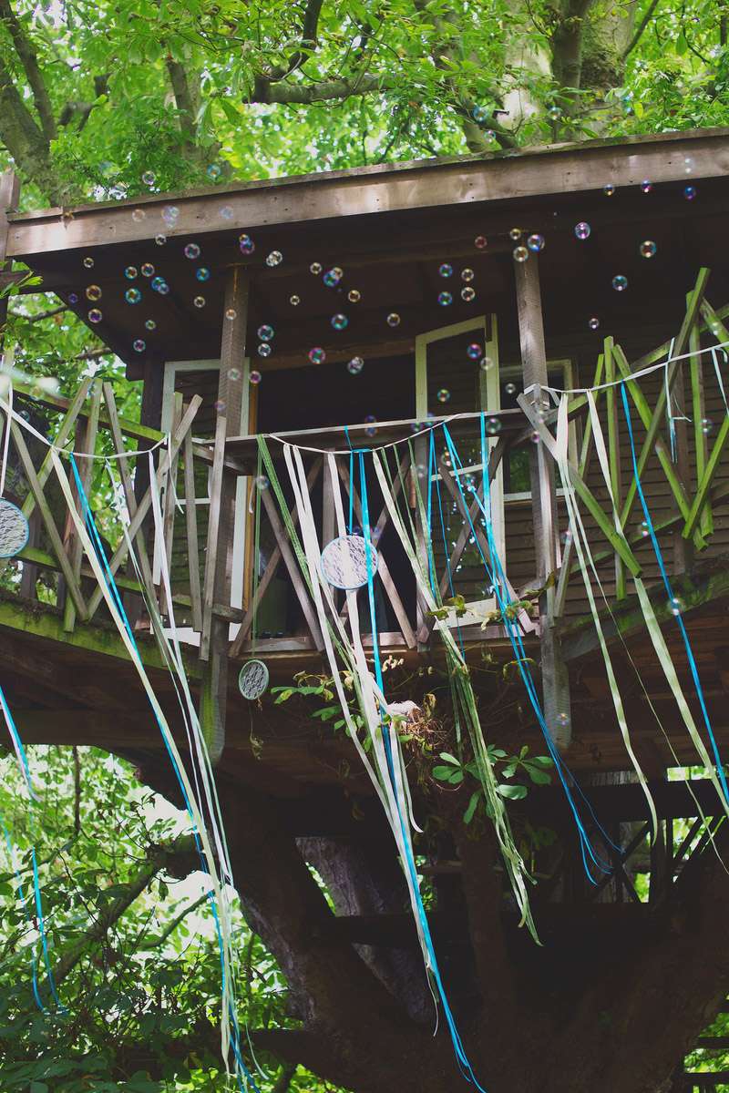Pretty much every single decor item was handmade by either the couple or their friends and family. Kirsty explains, “We DIY’d a lot of the wedding touches. We had activity booklets printed, filled with mingle bingo and crossword puzzles to add into the epic favour bags. We used a lot of online suppliers to make custom pieces like stamped pennies, custom napkins, and rolls of Love Hearts with our names on them. We made the ribbon and embroidery hoop decoration for the tree house and all of the pompoms. James’ mum made the bunting from old curtains that I had snaffled away in a cupboard and also used my ex-Maths Teacher skills to make paper spirals and hearts which twirled in the trees.”