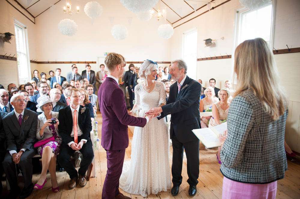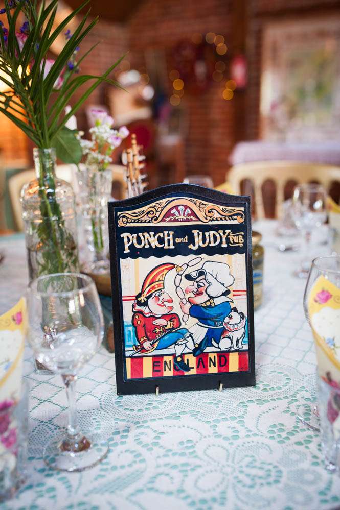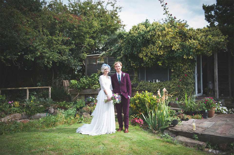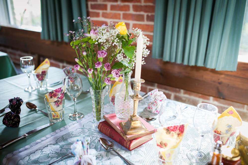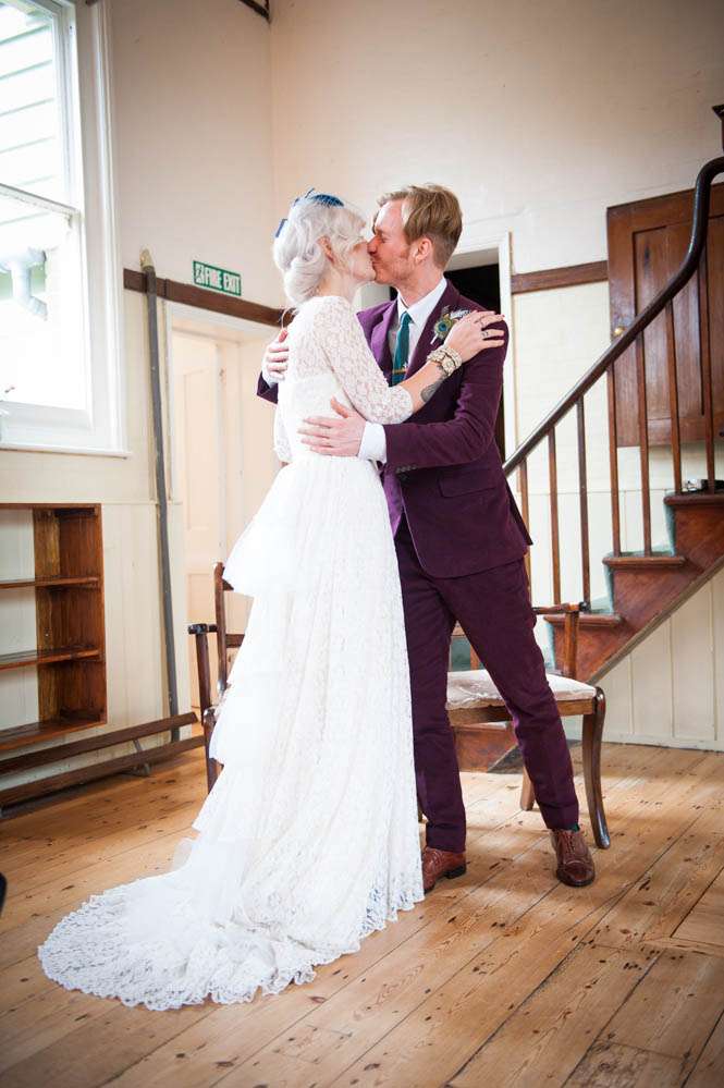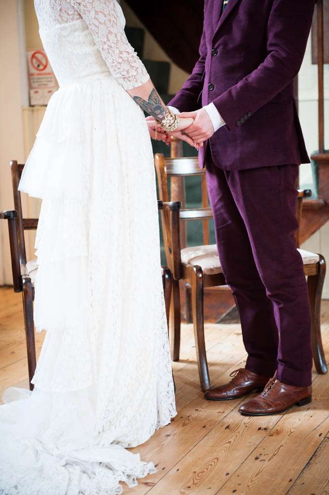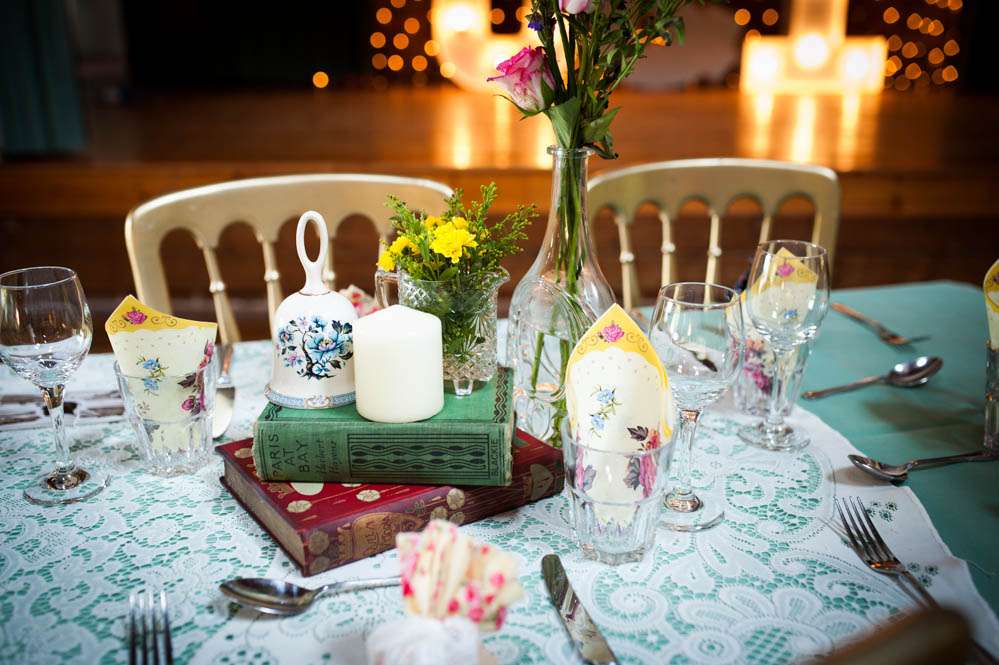 The reception was decorated with things they love in their everyday lives. Their stationery was designed by Jacqui’s graphic designer dad, their flowers were from a local flower market and their cake was a giant pork pie! “There wasn’t an actual theme as such,” she continued” it was more an extension of our home décor. We just filled the hall with things that we love from our house and all the vintage treasure we had found from boot sales and antique fairs over the summer.”