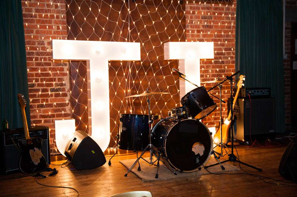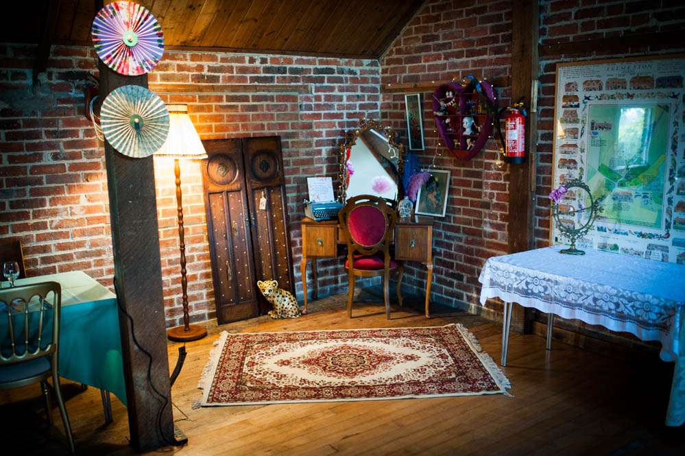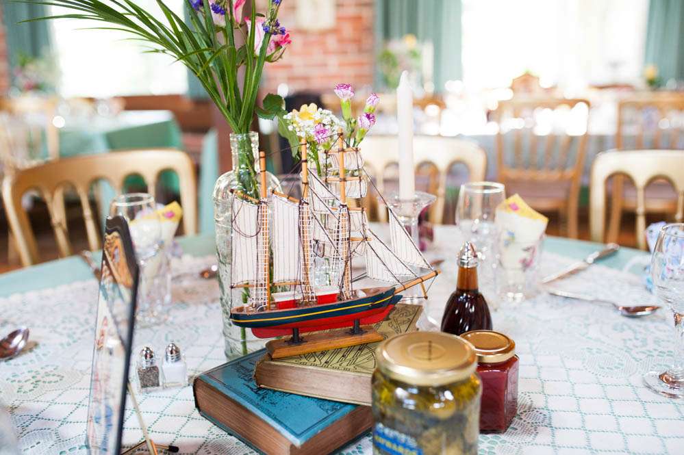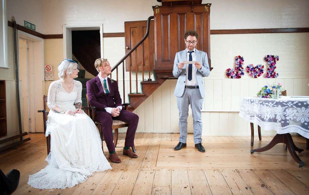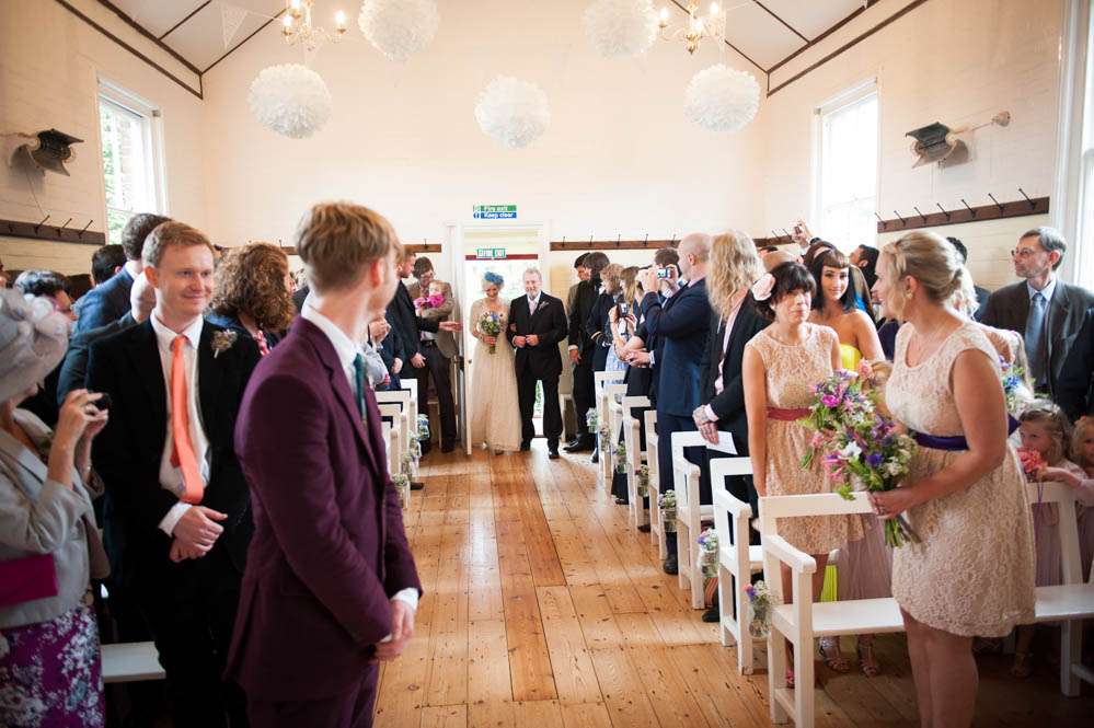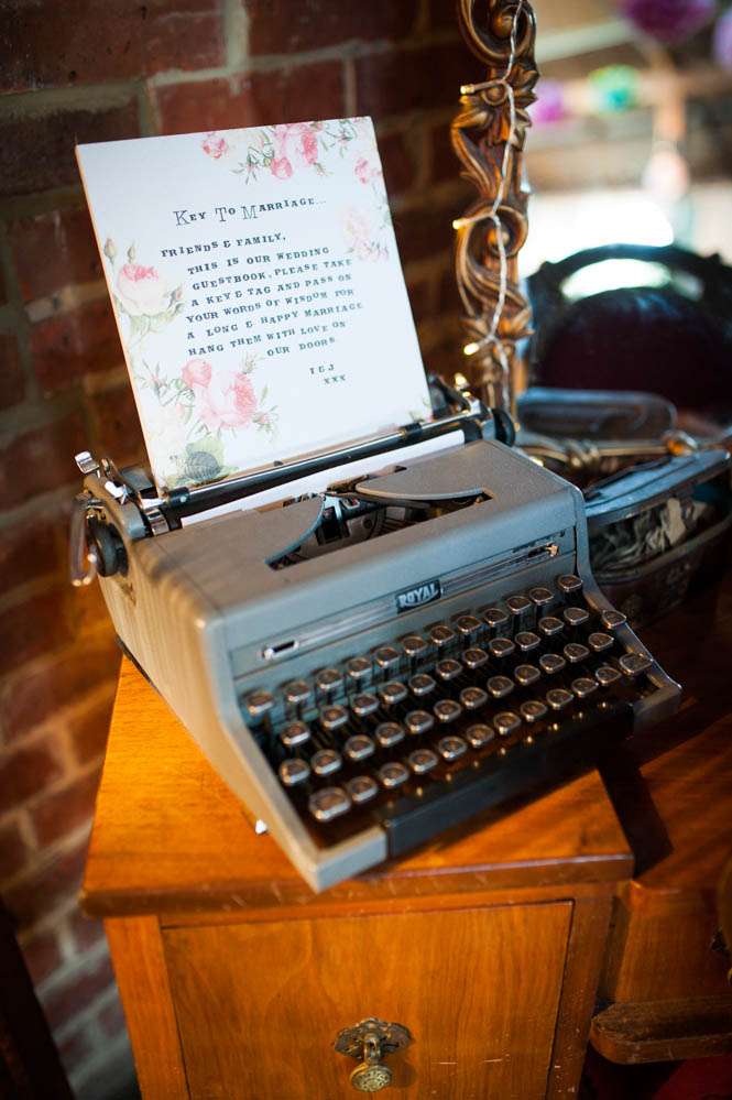 The reception was decorated with things they love in their everyday lives. Their stationery was designed by Jacqui’s graphic designer dad, their flowers were from a local flower market and their cake was a giant pork pie! “There wasn’t an actual theme as such,” she continued” it was more an extension of our home décor. We just filled the hall with things that we love from our house and all the vintage treasure we had found from boot sales and antique fairs over the summer.”