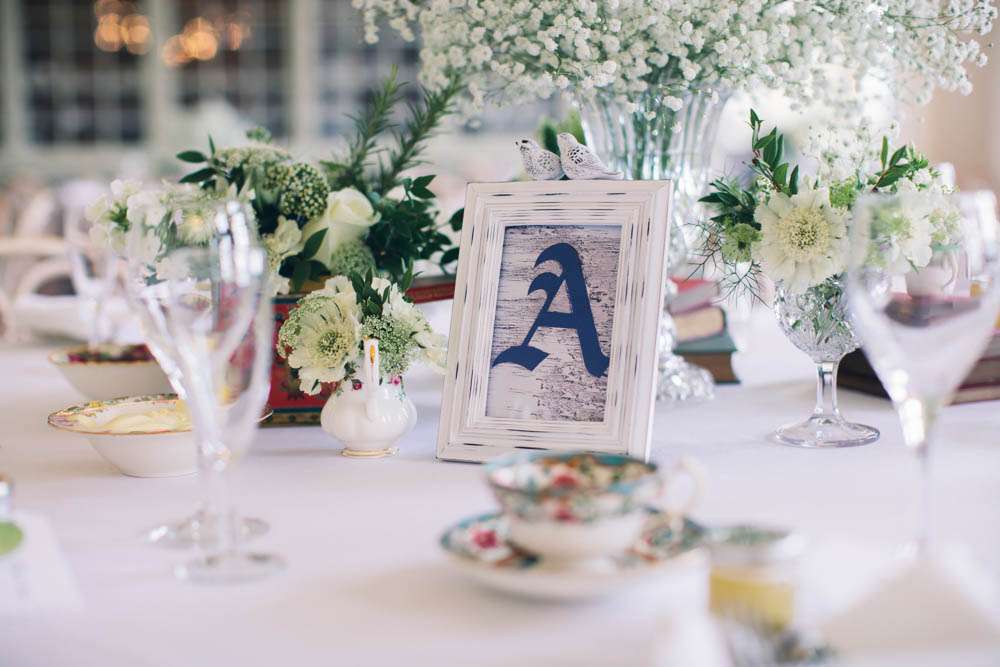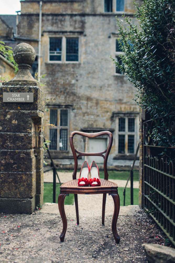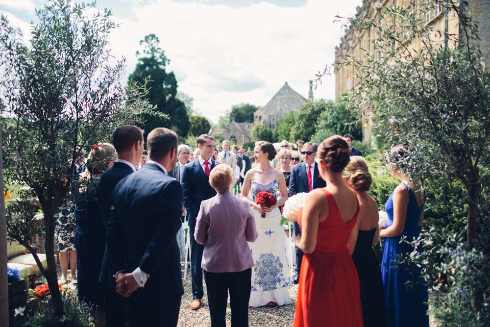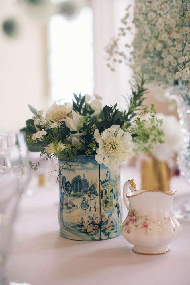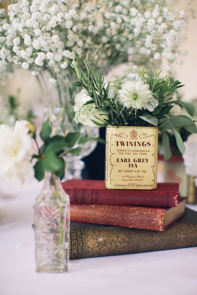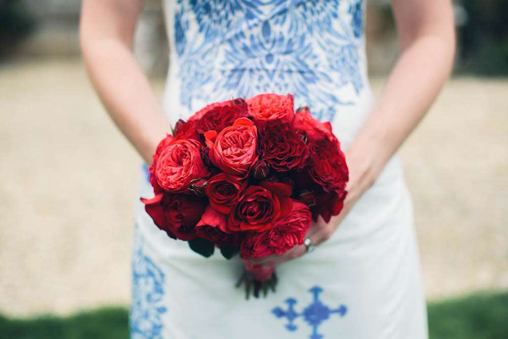 “There was no single theme for the wedding, but rather a sense that we wanted people to be wowed all over again as they moved from space to space”, began the bride. “The ceremony was all red, white and blue – very British. We had big hydrangeas and red roses in crates and flowerpots, and the bridal party and groomsmen all decked out in the same. For the afternoon tea in the ballroom, we took Brympton‘s 2,000-piece tea set as a starting point and created a very eclectic and vintage-y look. Then, for the evening reception in the orangery, we went for a gentleman’s club feel – lots of jewel colours, plush furnishings and bits and bobs raided from my parent’s house.”