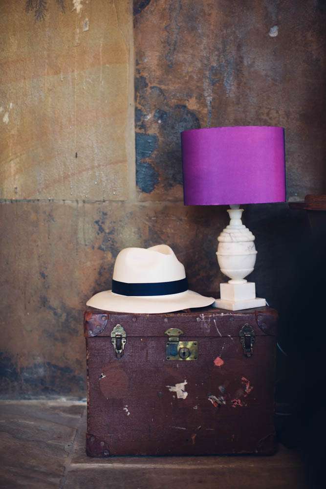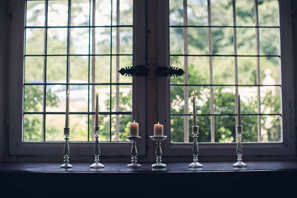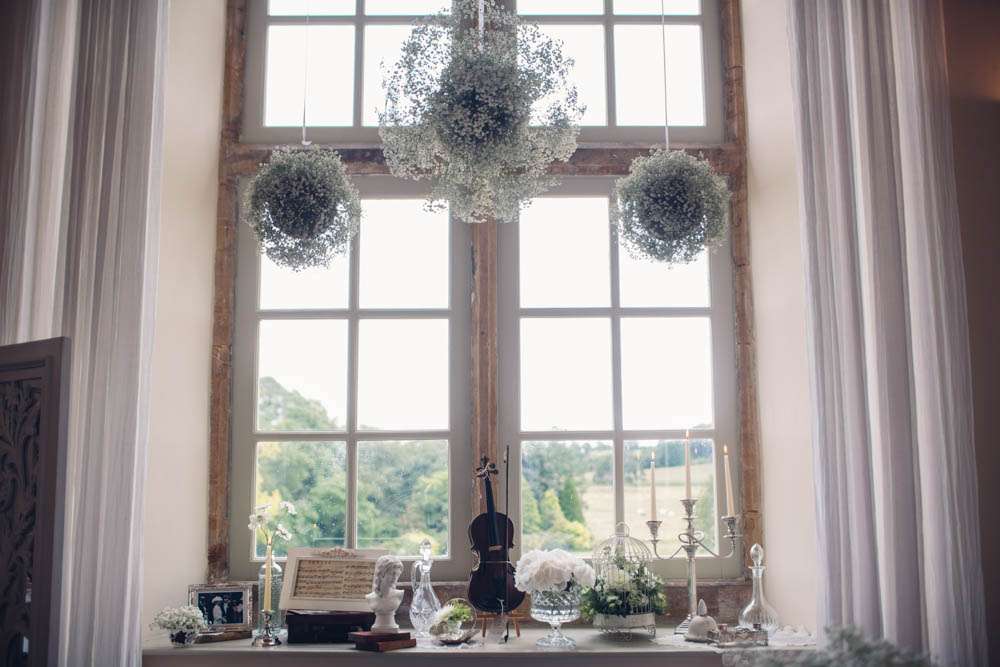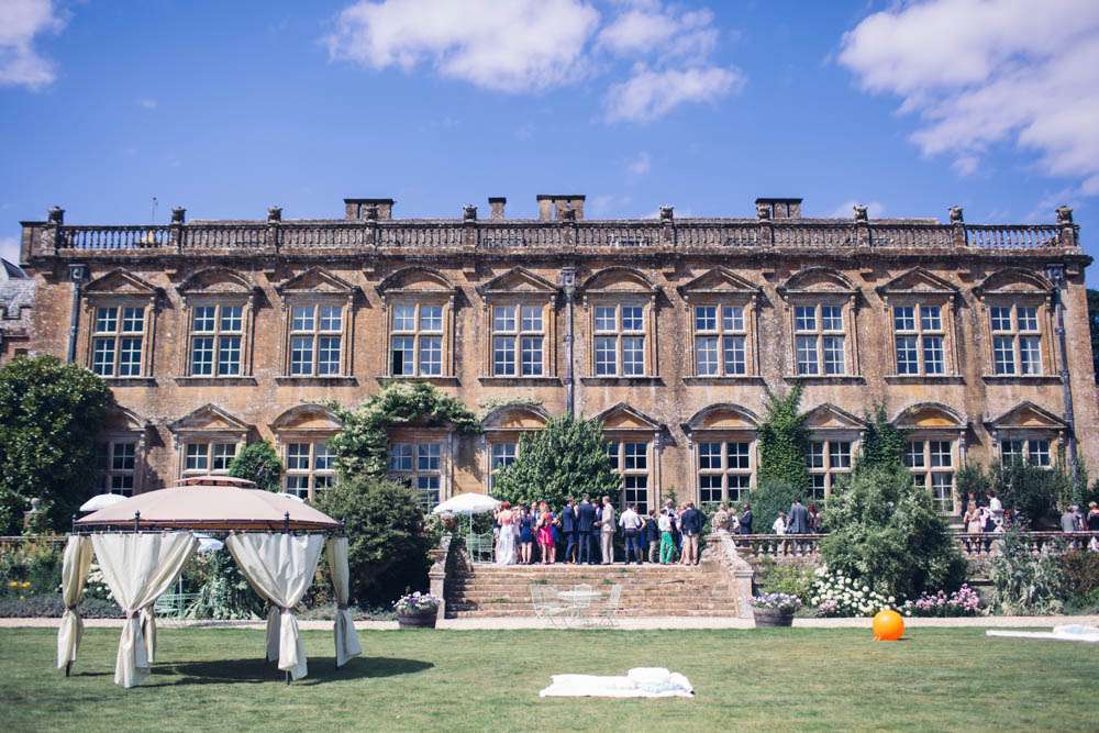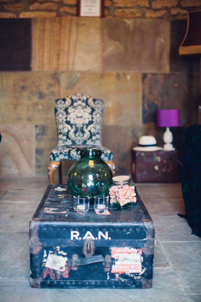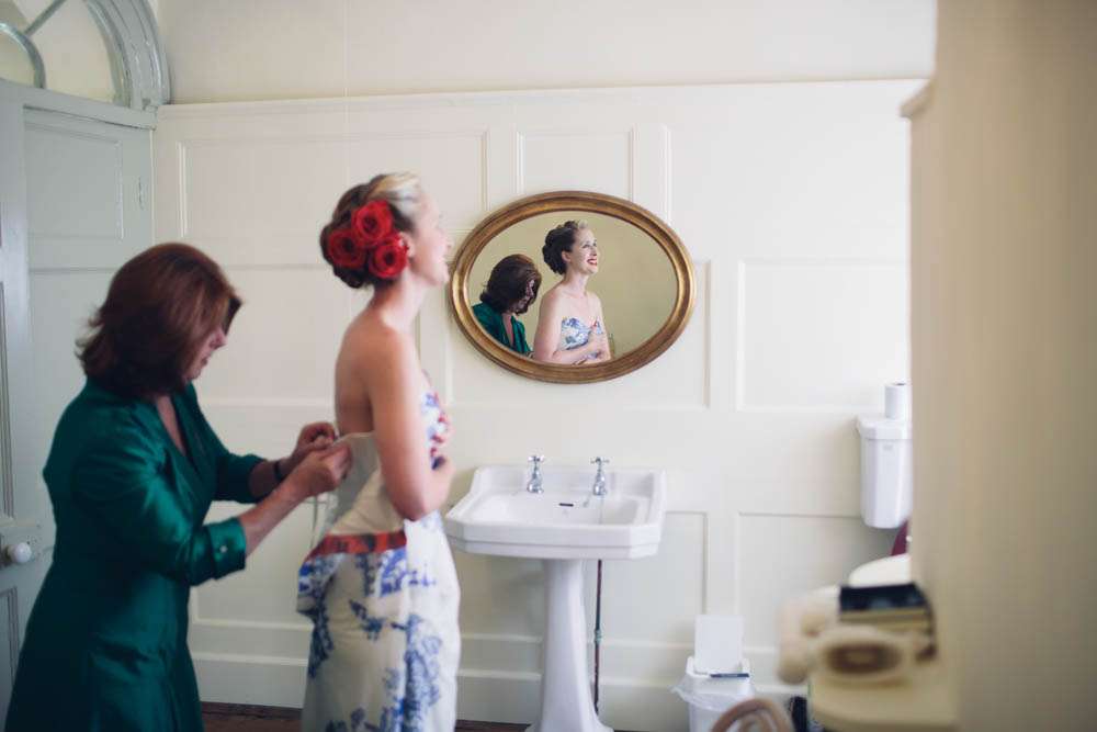 “There was no single theme for the wedding, but rather a sense that we wanted people to be wowed all over again as they moved from space to space”, began the bride. “The ceremony was all red, white and blue – very British. We had big hydrangeas and red roses in crates and flowerpots, and the bridal party and groomsmen all decked out in the same. For the afternoon tea in the ballroom, we took Brympton‘s 2,000-piece tea set as a starting point and created a very eclectic and vintage-y look. Then, for the evening reception in the orangery, we went for a gentleman’s club feel – lots of jewel colours, plush furnishings and bits and bobs raided from my parent’s house.”