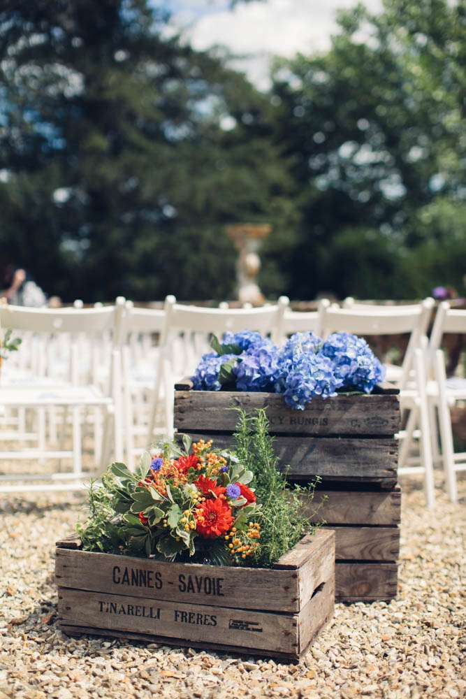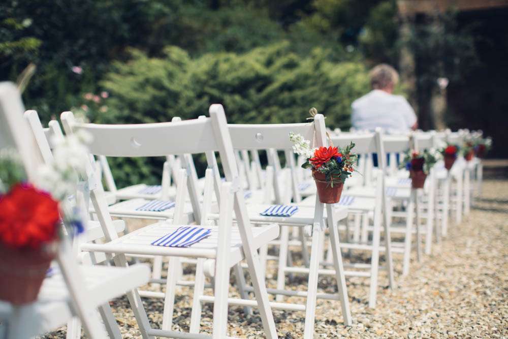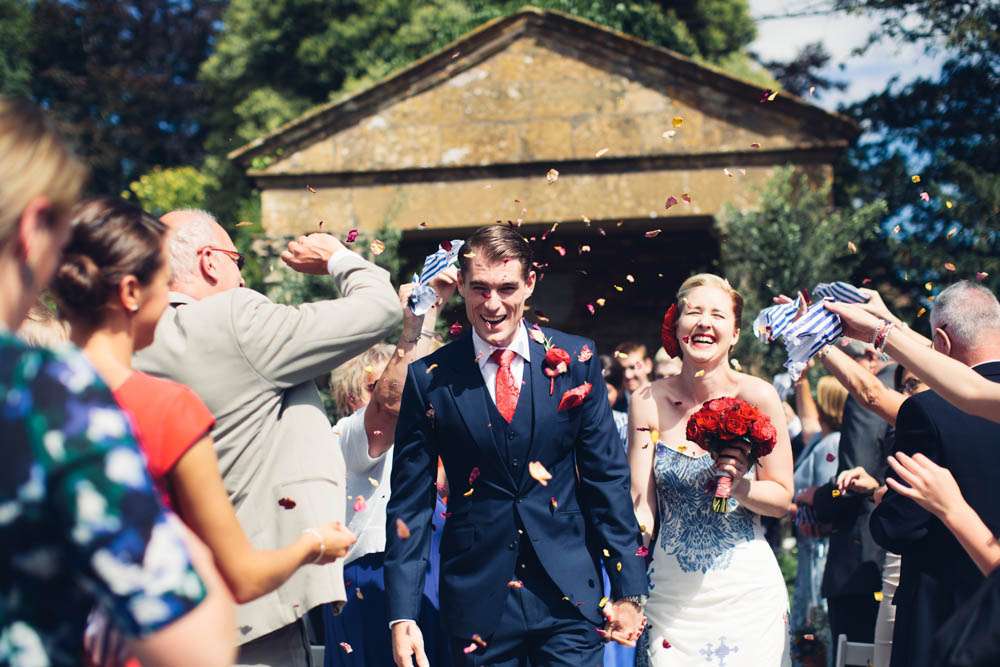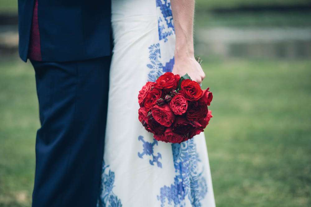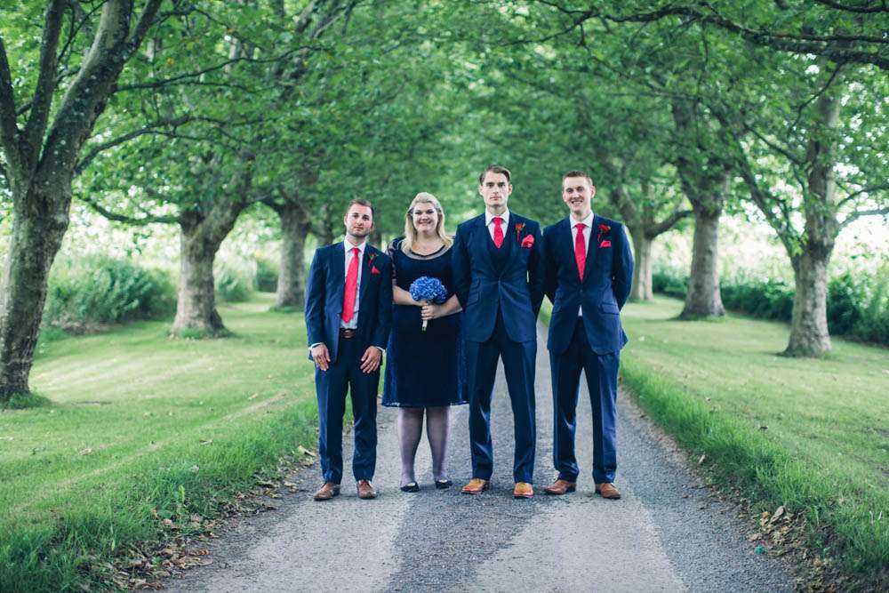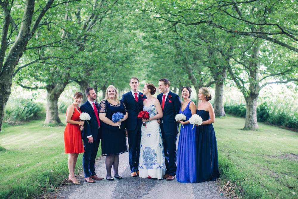 Cameron and Lizzy chose a red, white and blue colour palette for their August wedding. Starting with the bride’s stunning bespoke gown and the groom’s three-piece suit, it then filtering though to the hydrangeas and rose arrangements, and finally the attendant’s clothes.