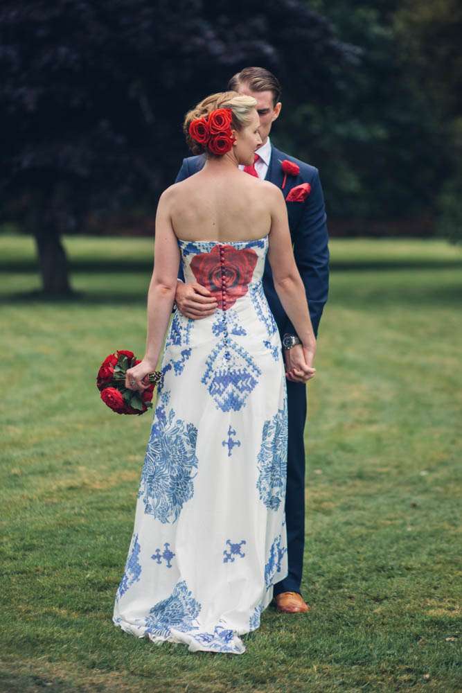 Lizzy’s incredible dress was custom made for her and actually made from scarves from Liberty! She explained, “My dress was made from scarves. Going into ‘wedding year’, all I knew about my future dress was that it wouldn’t be white (or completely white). After a couple of unsuccessful forays into evening gowns and a run in with at least one lacklustre dressmaker, my mum was sat in the hairdresser six months before the wedding lamenting my lack of dress, and through her lovely hairdresser we found Emma Louise.”