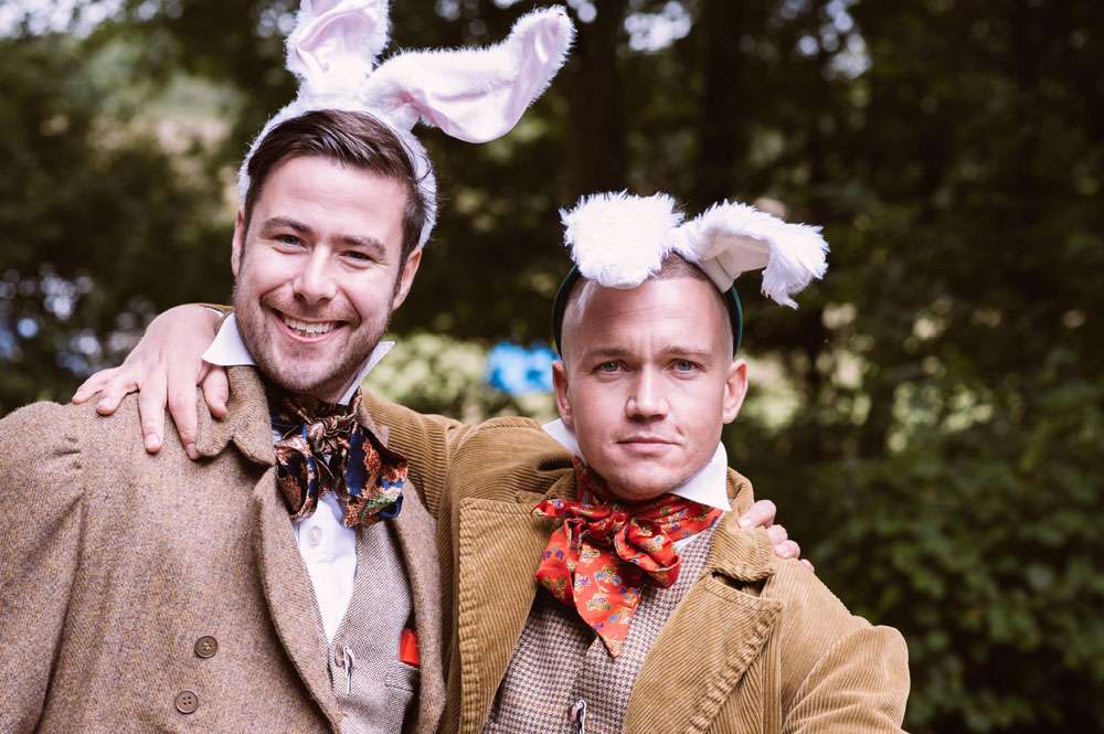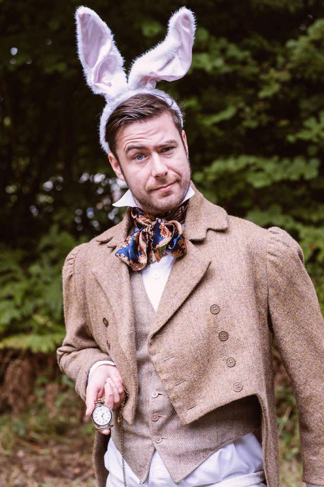 “This was our second (unofficial) wedding two weeks later. It was proper fancy dress as we love to dress up. I was the white rabbit, Laura was Alice, and all the people to do with the service were allocated characters. Laura had nine bridesmaids (and made the hats for all of them), a flower girl and a little drummer boy. I had Tweedle Dum and Tweedle Dee as my best men, whilst Laura’s best men were the Walrus and Carpenter. Of course, some people went completely off piste and we ended up with all sorts turning up, including Santa himself.”