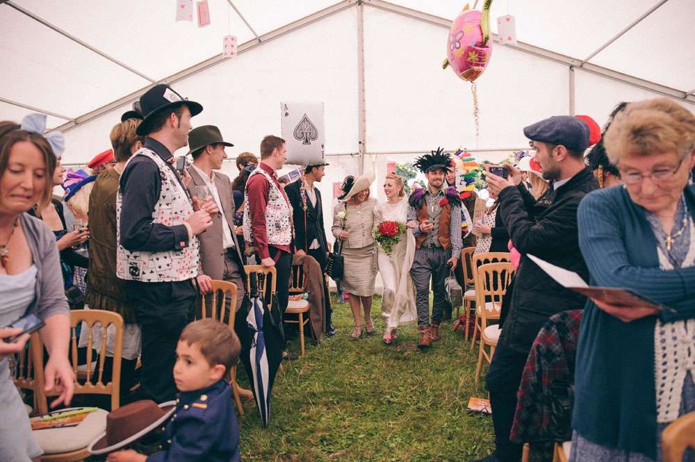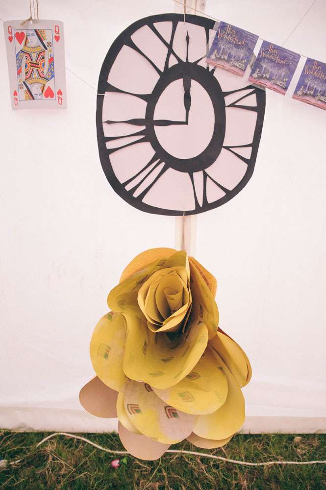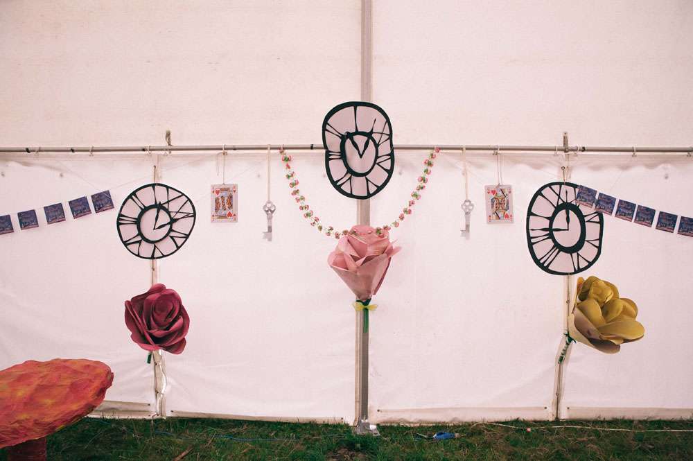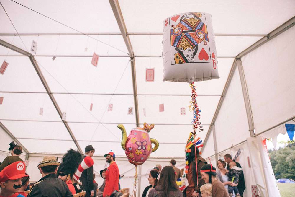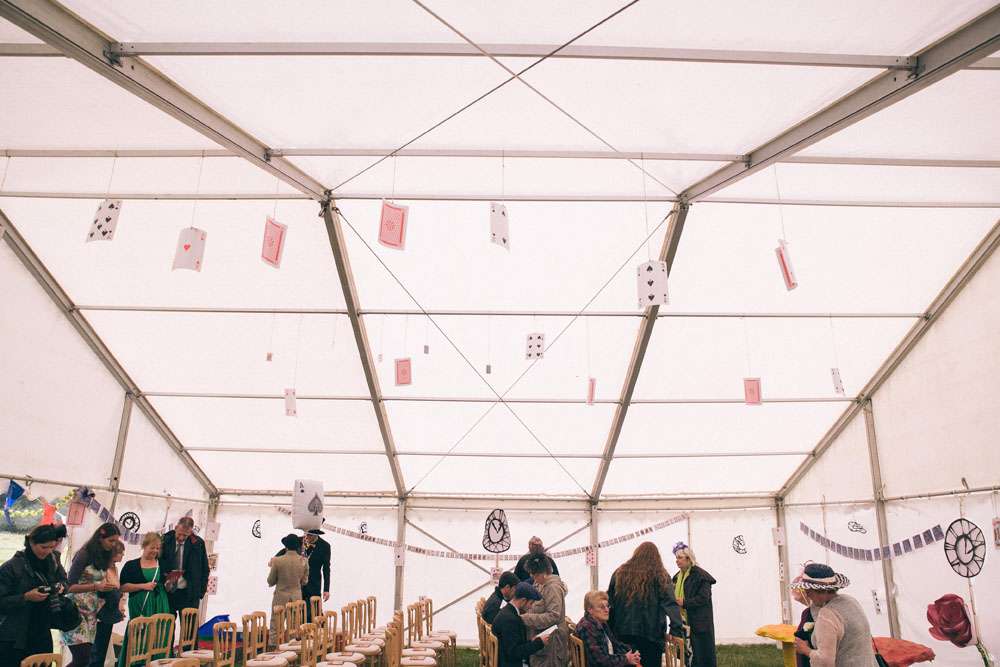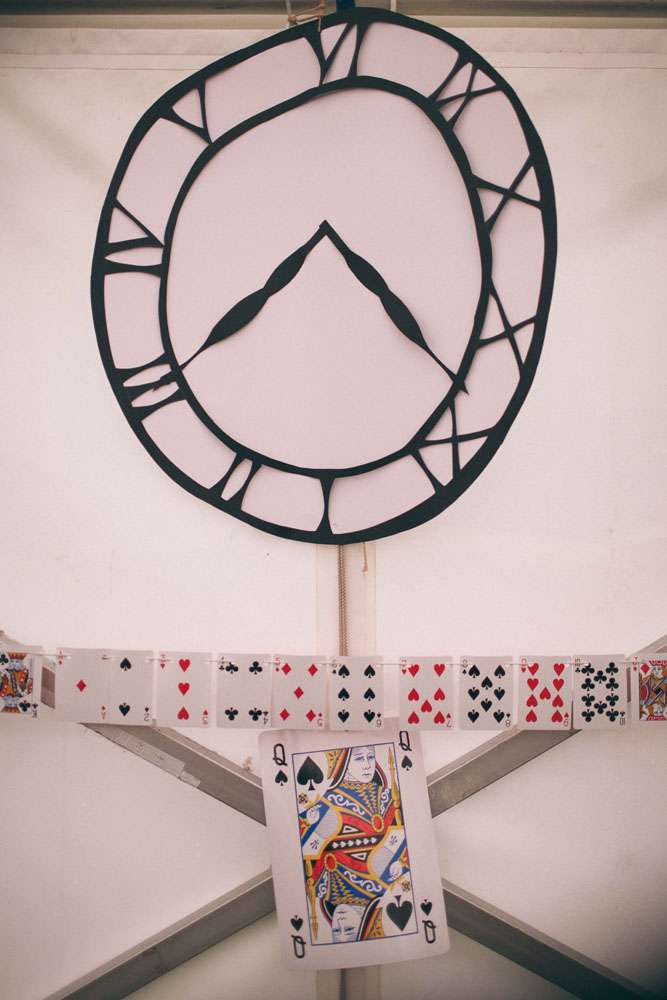 The wedding took place in September in a marquee on a field at Hodore Farm, East Sussex. It was decorated from top to bottom with balloon teapots and playing cards, oversized playing cards, papier-mâché mushrooms, giant paper flowers, giant paper clocks, blow-up flamingoes, blow-up bananas, giant bean bags and a black and white tiled dance floor!