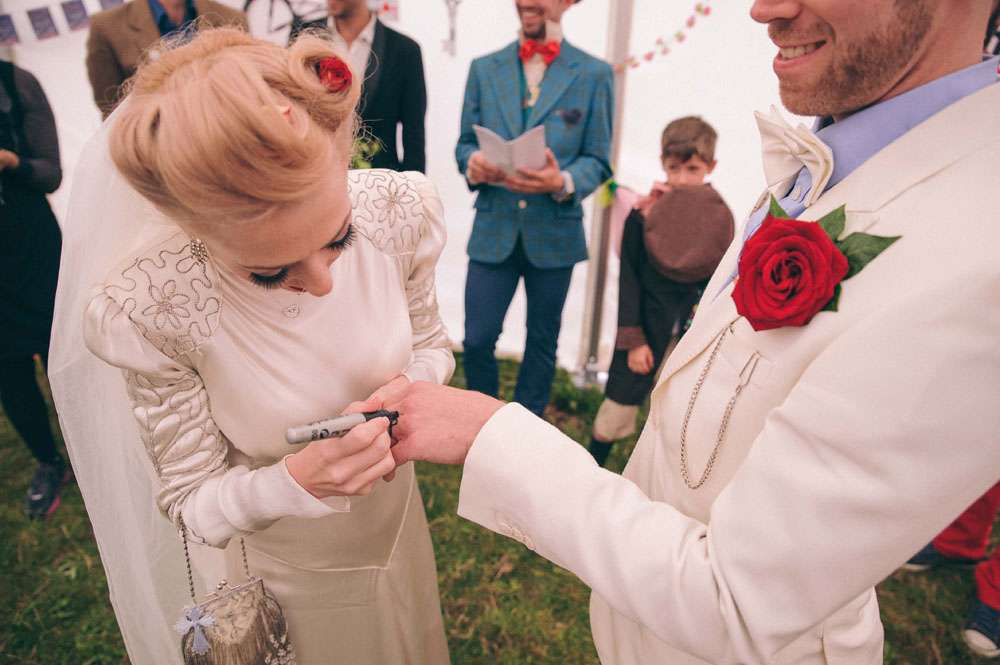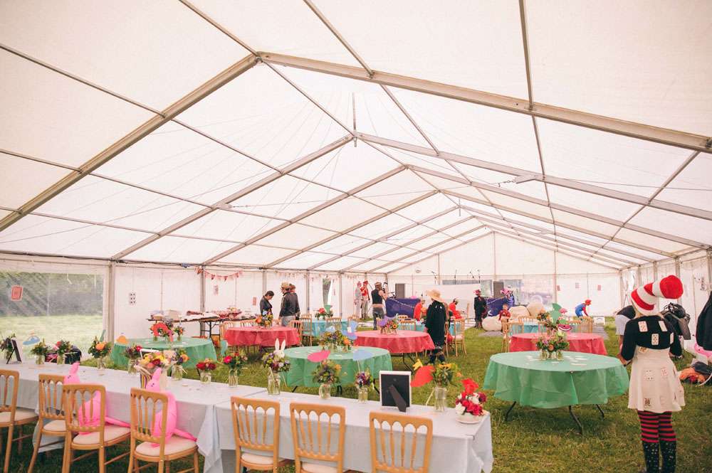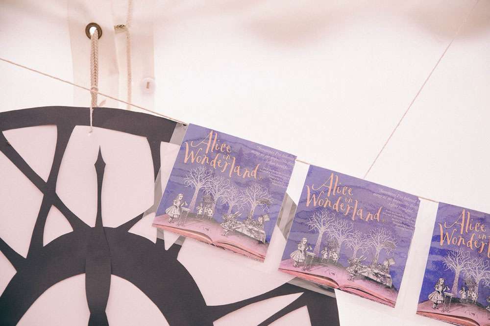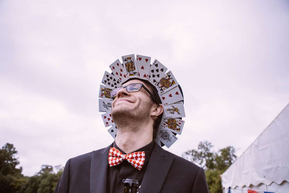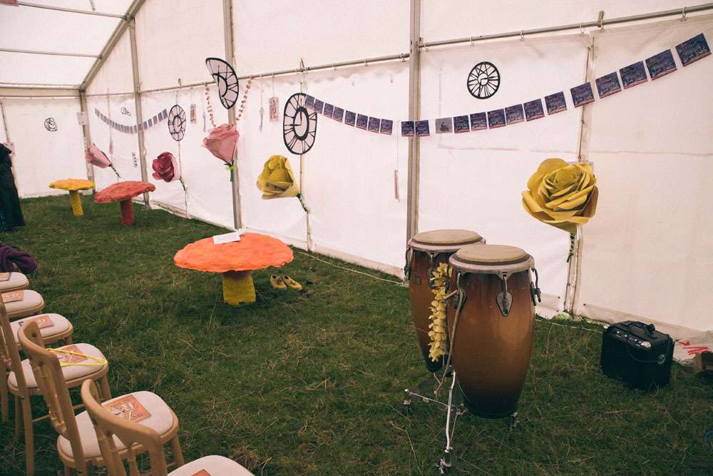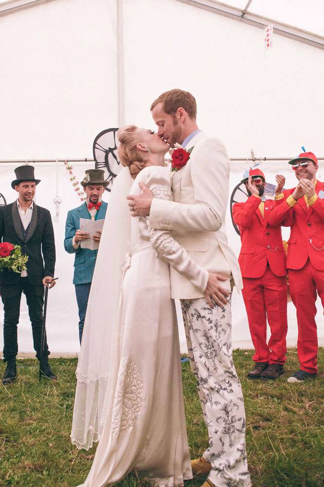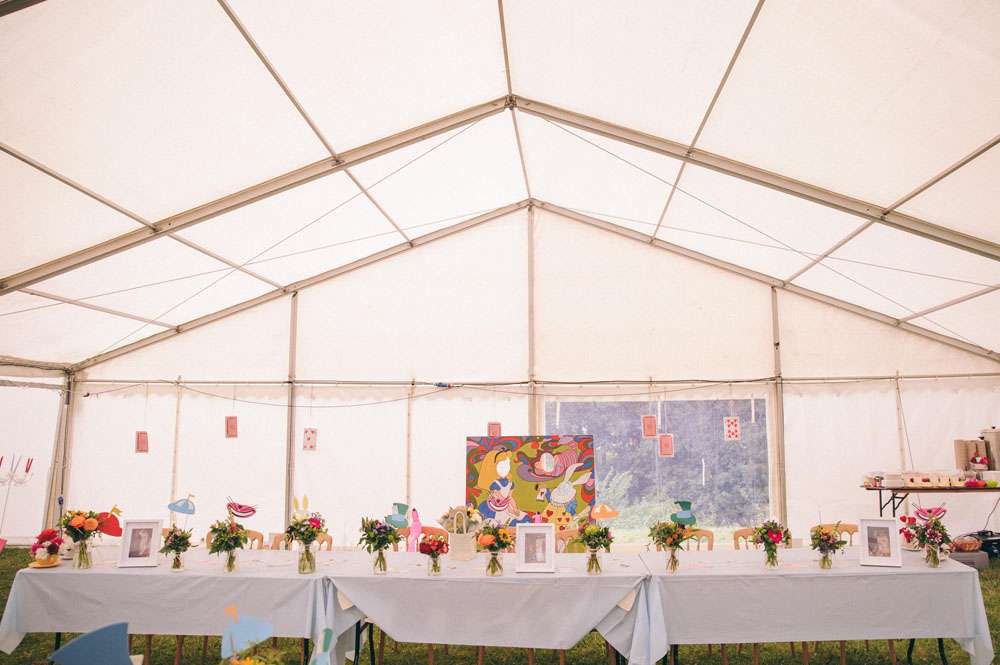 The wedding took place in September in a marquee on a field at Hodore Farm, East Sussex. It was decorated from top to bottom with balloon teapots and playing cards, oversized playing cards, papier-mâché mushrooms, giant paper flowers, giant paper clocks, blow-up flamingoes, blow-up bananas, giant bean bags and a black and white tiled dance floor!
