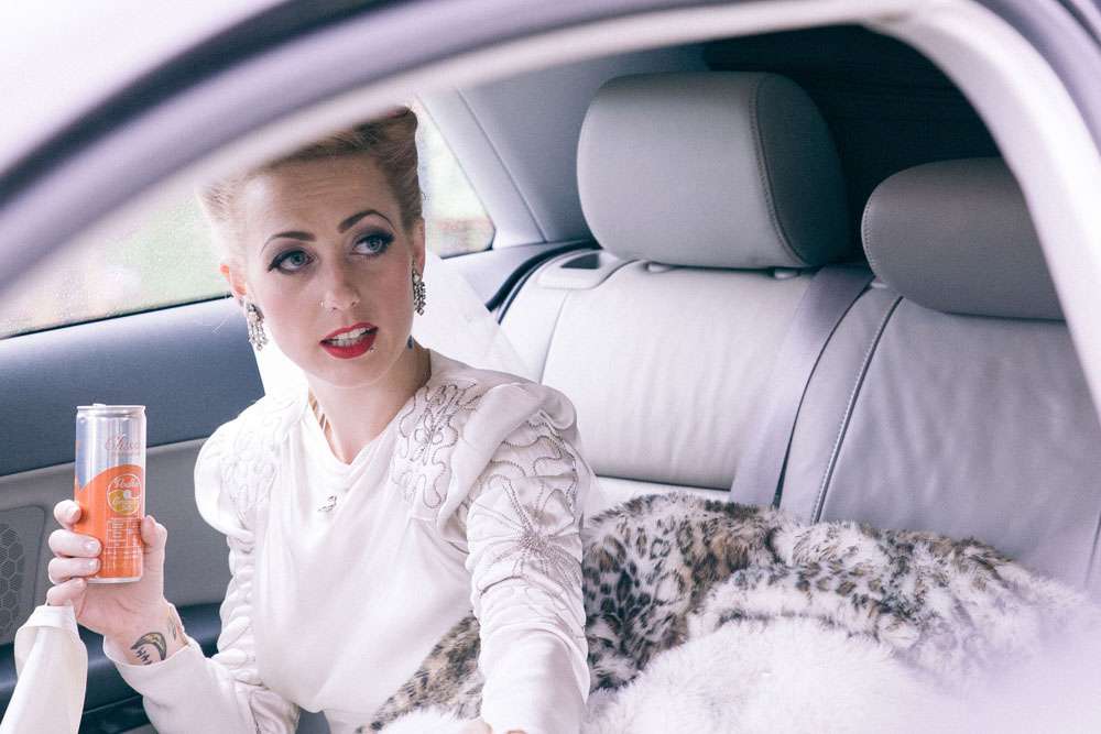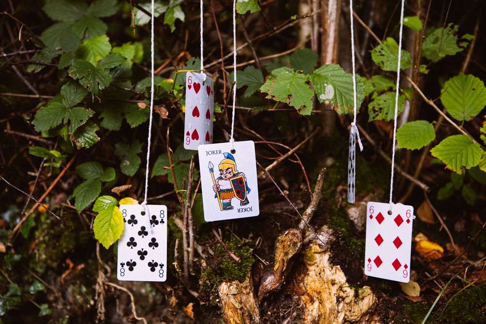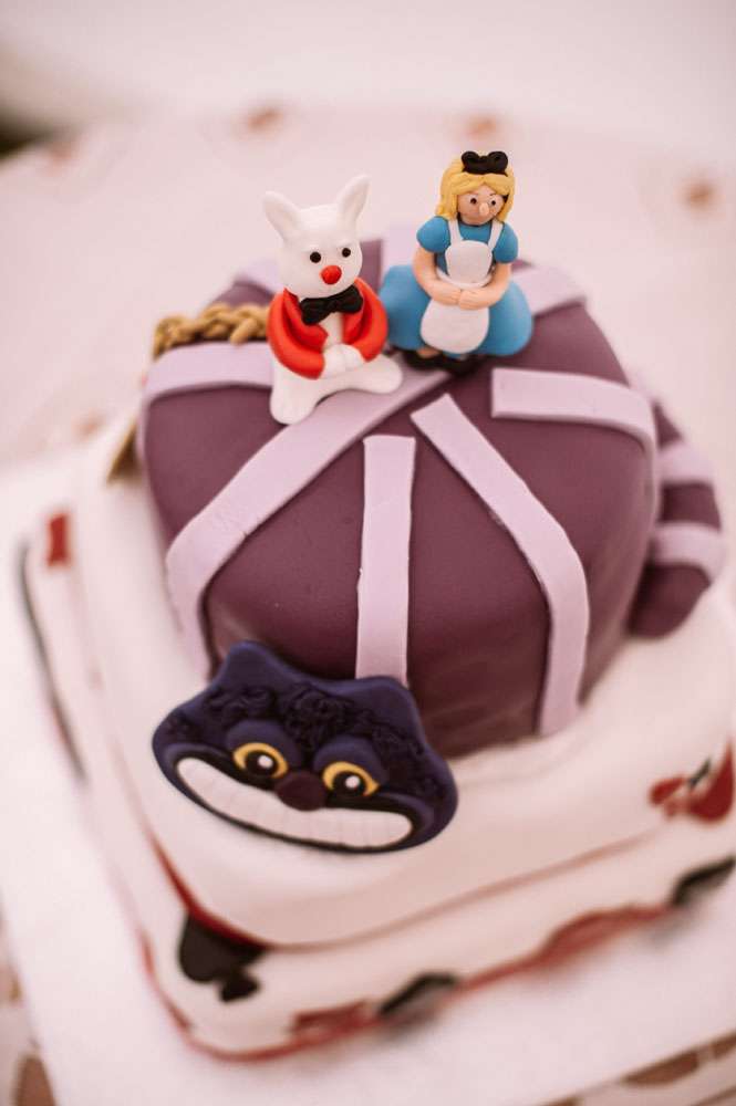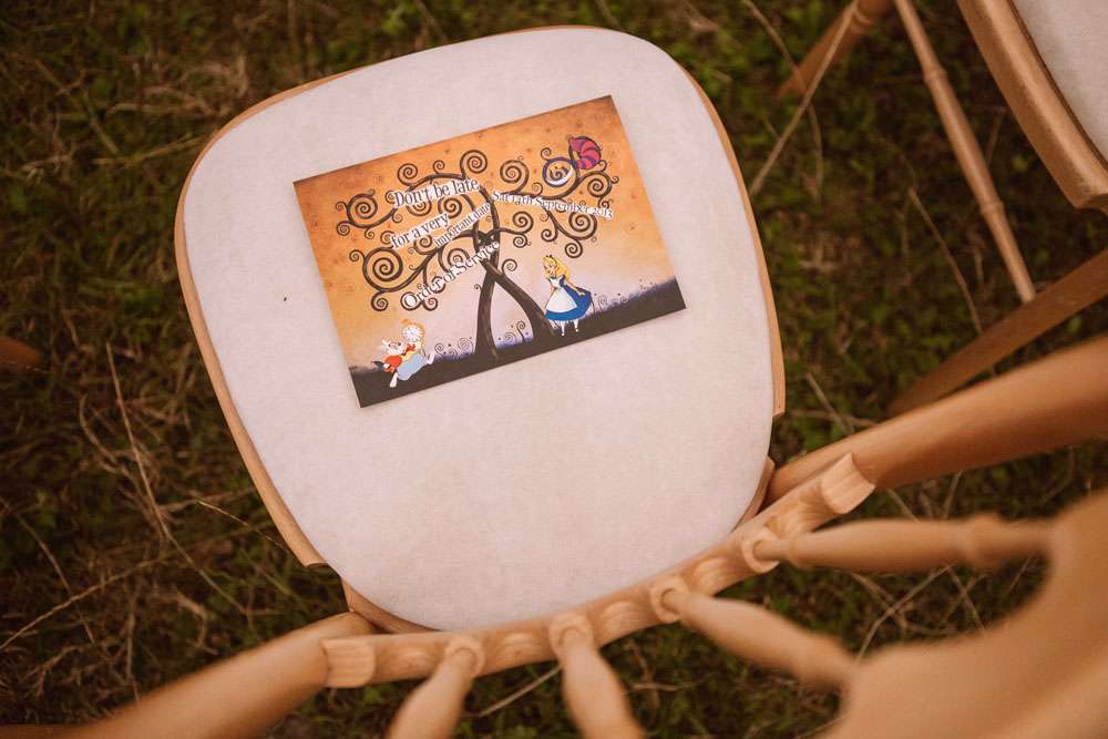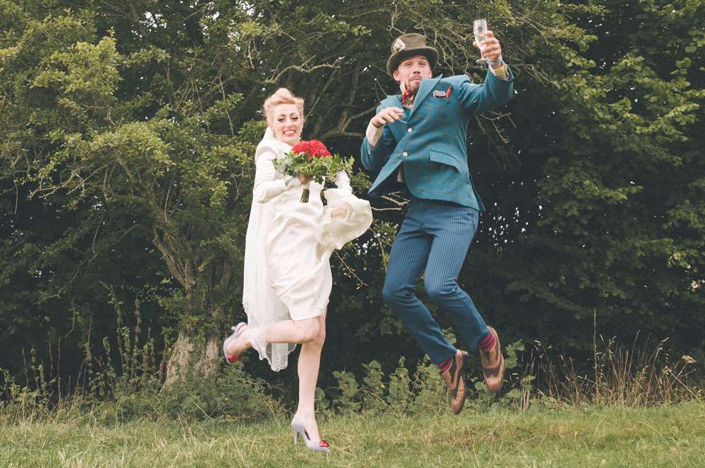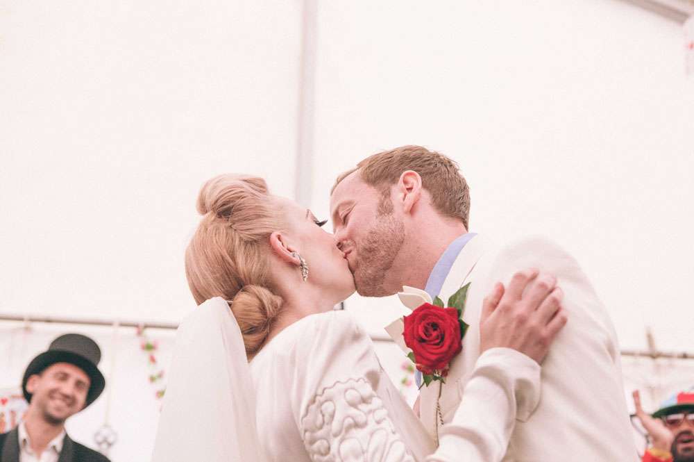 The wedding took place in September in a marquee on a field at Hodore Farm, East Sussex. It was decorated from top to bottom with balloon teapots and playing cards, oversized playing cards, papier-mâché mushrooms, giant paper flowers, giant paper clocks, blow-up flamingoes, blow-up bananas, giant bean bags and a black and white tiled dance floor!
