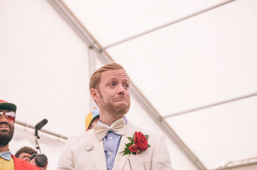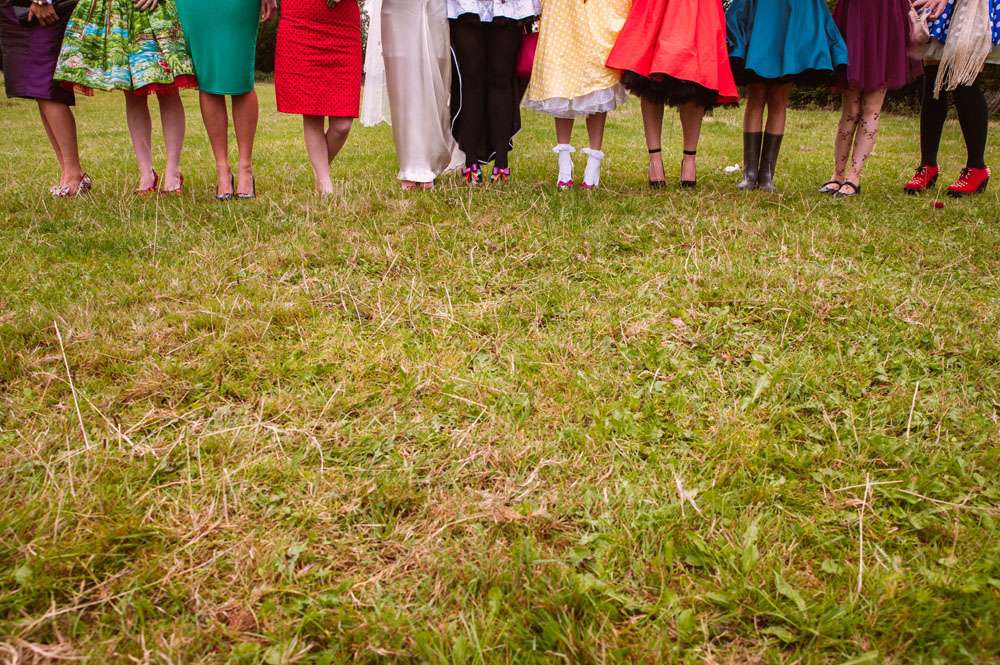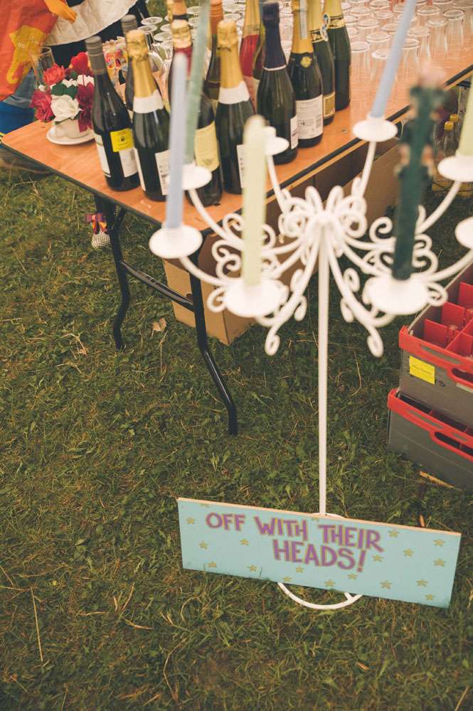 “Almost all our budget went on the marquees. They cost a lot, even discounted! However, they are awesome and did basically make it. They also provided the toilet, generator and on site lighting. We couldn’t have done it without them. We were also able to use the 9 acre field for free! The food and drink was also done on a real budget. Our friends and family helped out massively with everything. The main catering was done by five different friends on very small budgets – ranging from £150-£250. It’s amazing how far that goes! The bulk of it was jerk chicken, burgers, wood fire pizzas, bulked out with a range of salads, veggies and a vat of hummus. Then, the wedding cake was made by Laura’s best mate and all the bridesmaid’s brought cupcakes. We also had cream teas after the ceremony, which was an affordable but lovely snack.”