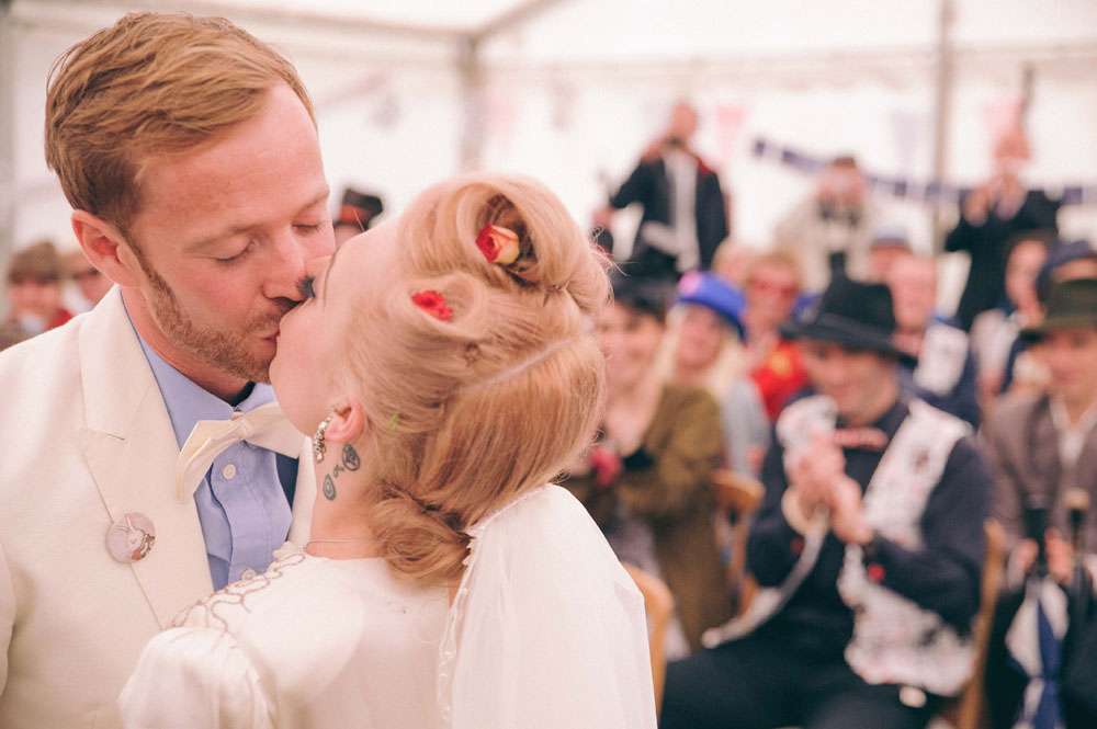 “The wedding lasted three days, and was a proper festival, with 200 people, a campfire in the woods surrounded by bell tents and fairy lights, a live karaoke band, DJs, live jams, a home made wood fire pizza oven, bubble and fire performances! The majority of guests camped on site. Amongst all the revelling, we actually forgot to cut the cake, so decided to headbutt it into oblivion instead!”