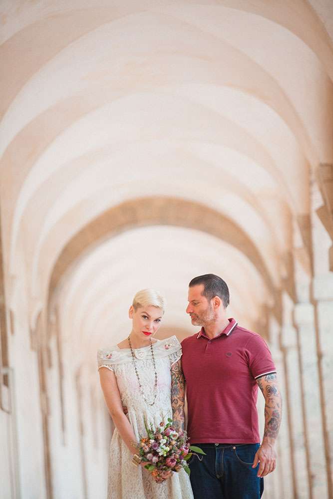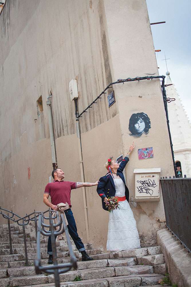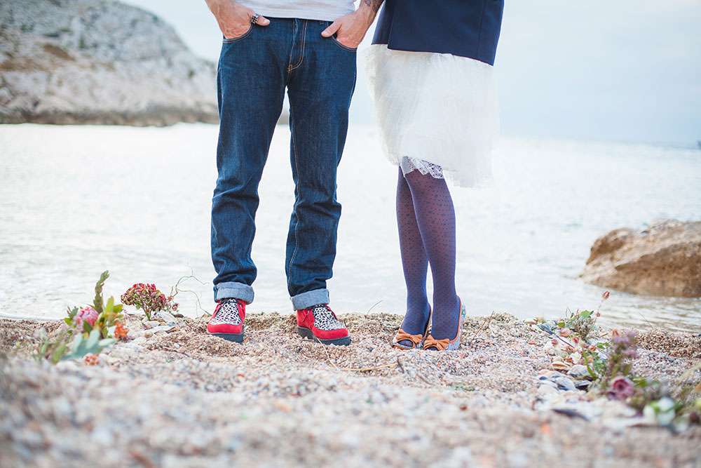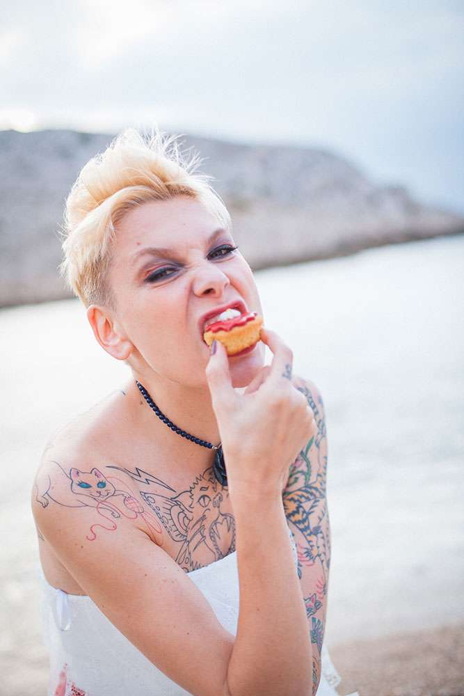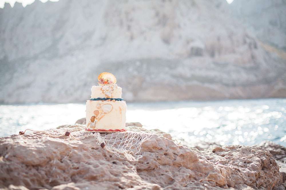 Although Laetitia and Franck aren’t planning to get married, they wanted to do something special for their four year anniversary and so decided to stage a shoot with cake and dessert designer Lauren Delpech of French Made, London. Being born and raised in Marseille, where Laetitia and Franck live, Lauren decided it would be the perfect place for the session. They chose the region of Le Panier because of its winding, hilly streets and Les Goudes Calanques as the stunning beach backdrop.