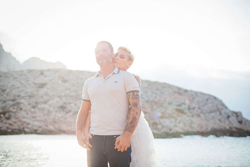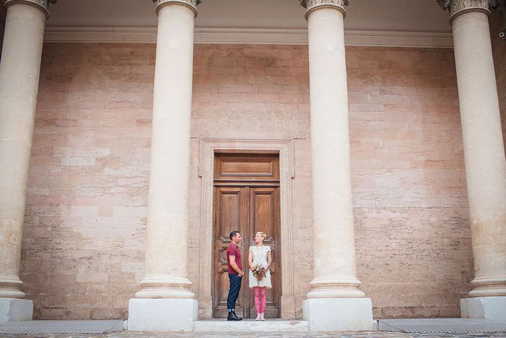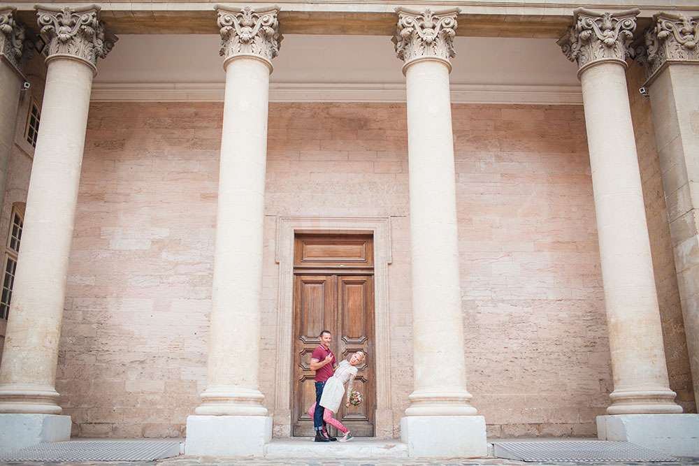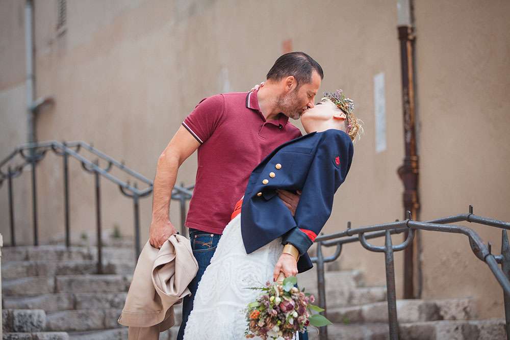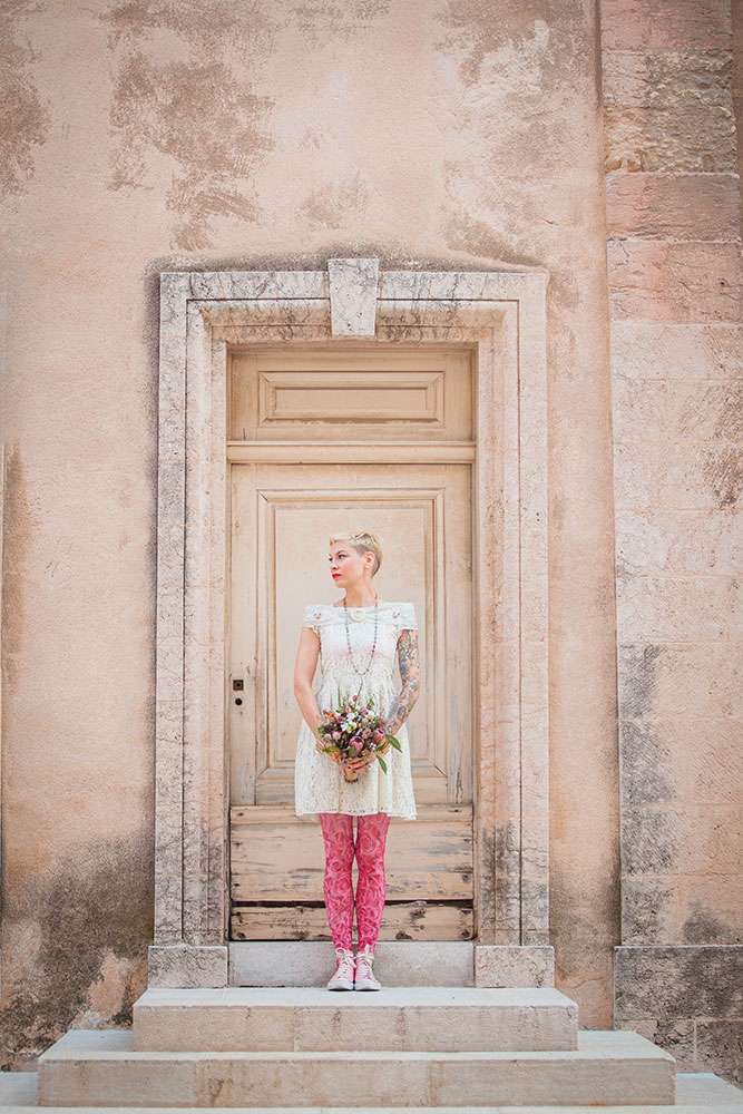 Although Laetitia and Franck aren’t planning to get married, they wanted to do something special for their four year anniversary and so decided to stage a shoot with cake and dessert designer Lauren Delpech of French Made, London. Being born and raised in Marseille, where Laetitia and Franck live, Lauren decided it would be the perfect place for the session. They chose the region of Le Panier because of its winding, hilly streets and Les Goudes Calanques as the stunning beach backdrop.