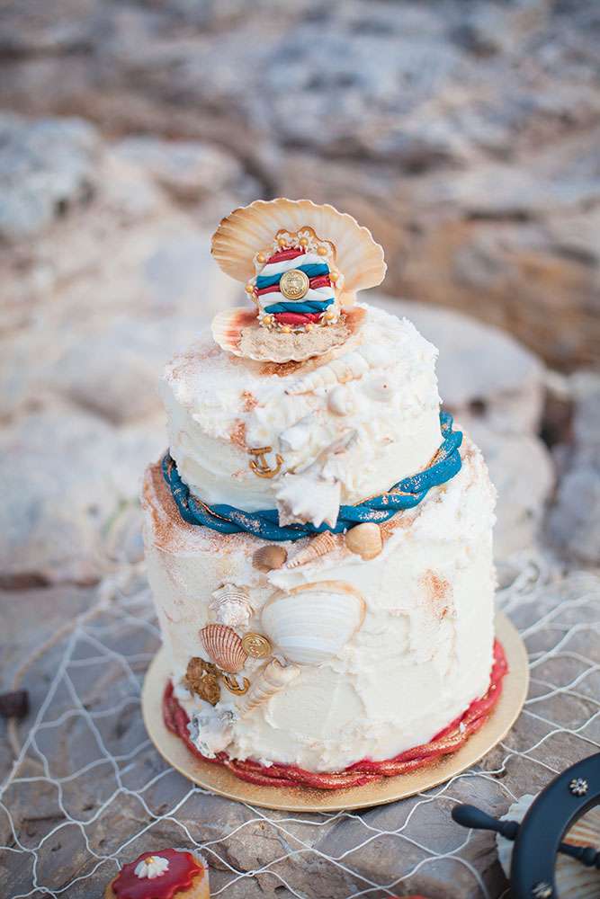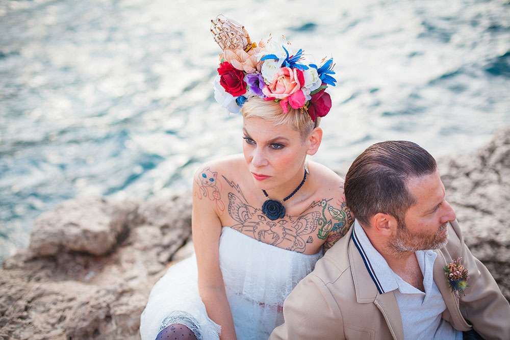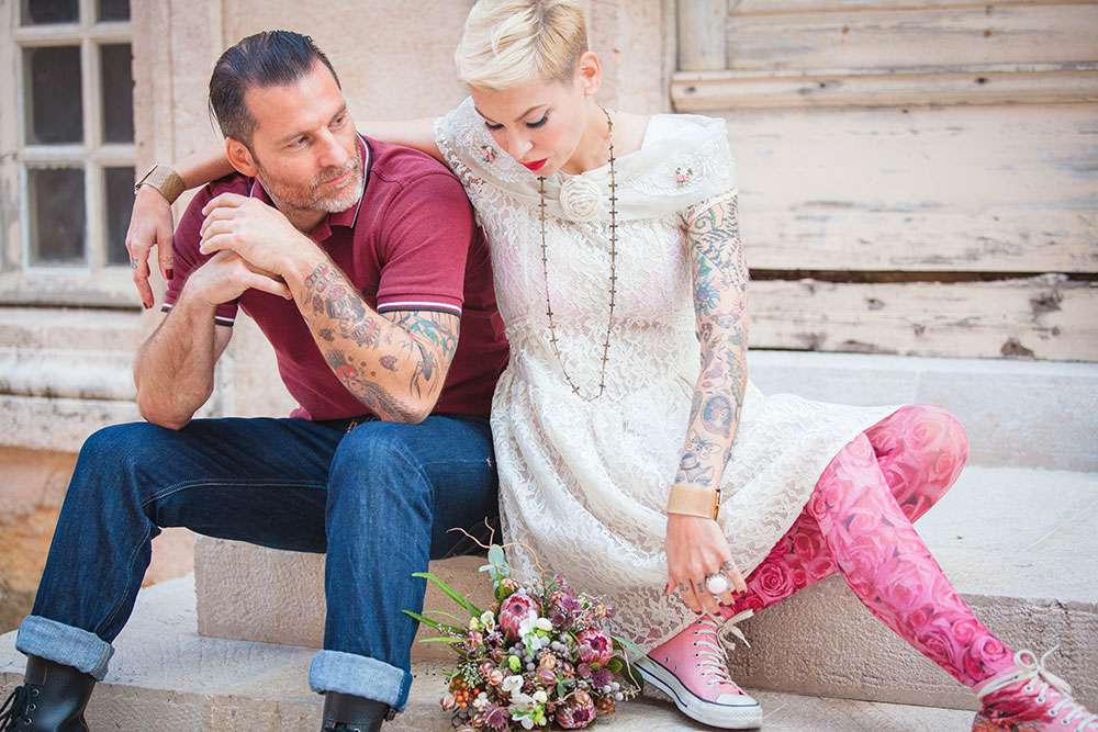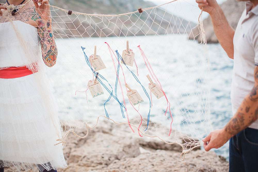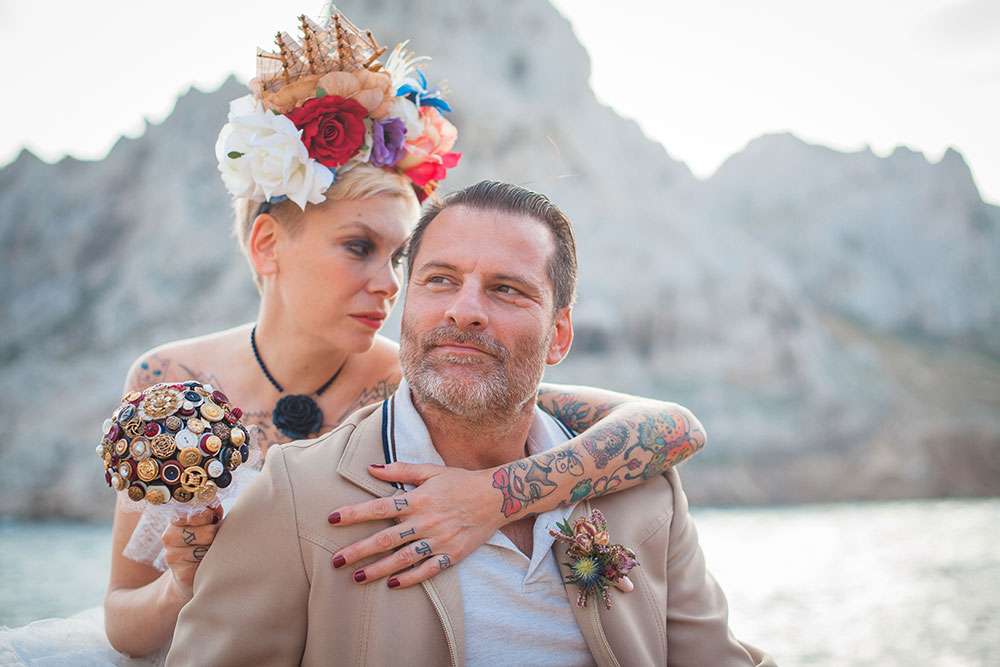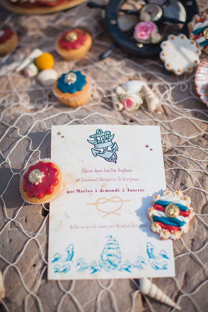 “A seaside themed photo shoot there may sound totally cliché, but with my team of fab suppliers, we worked with nautical symbols such as anchors, wheels, boats, sea shells”, wrote Lauren, “Laetitia and Franck are into tattooed and live an alternative life, so we included these influences too”.
