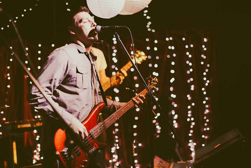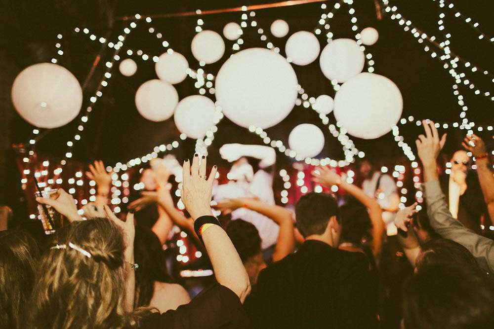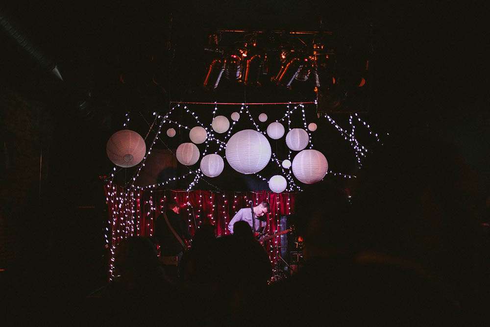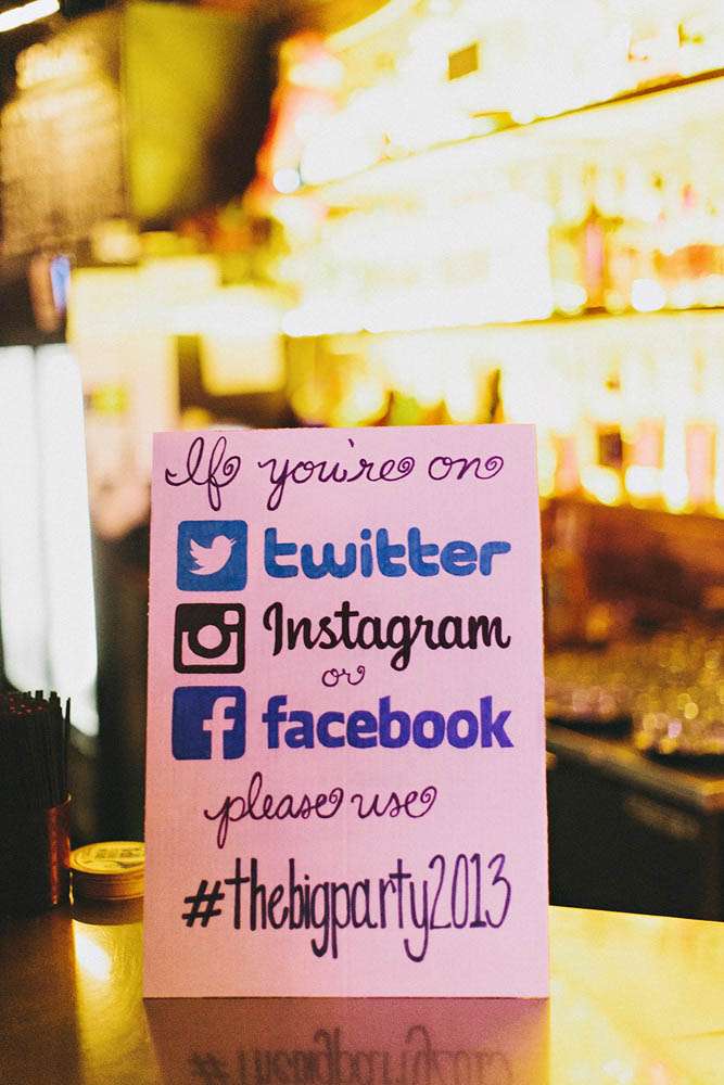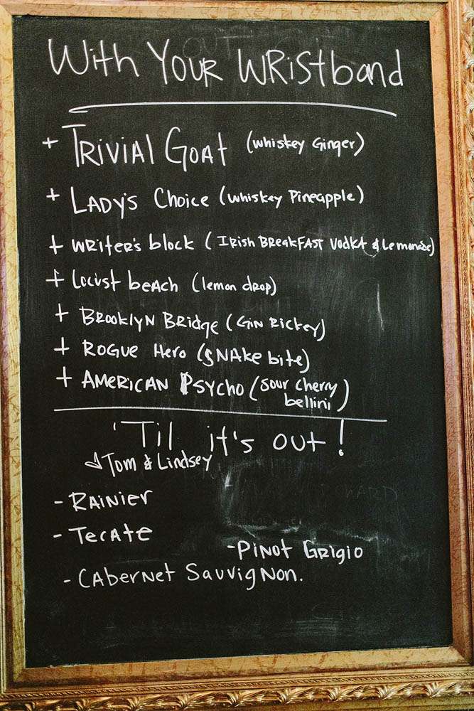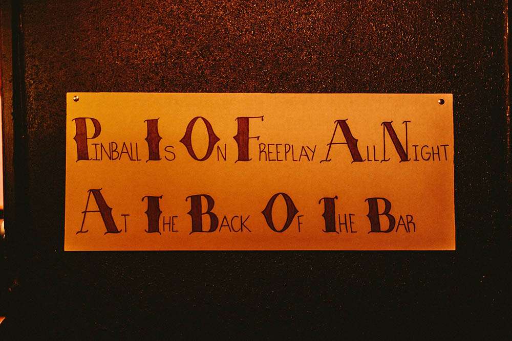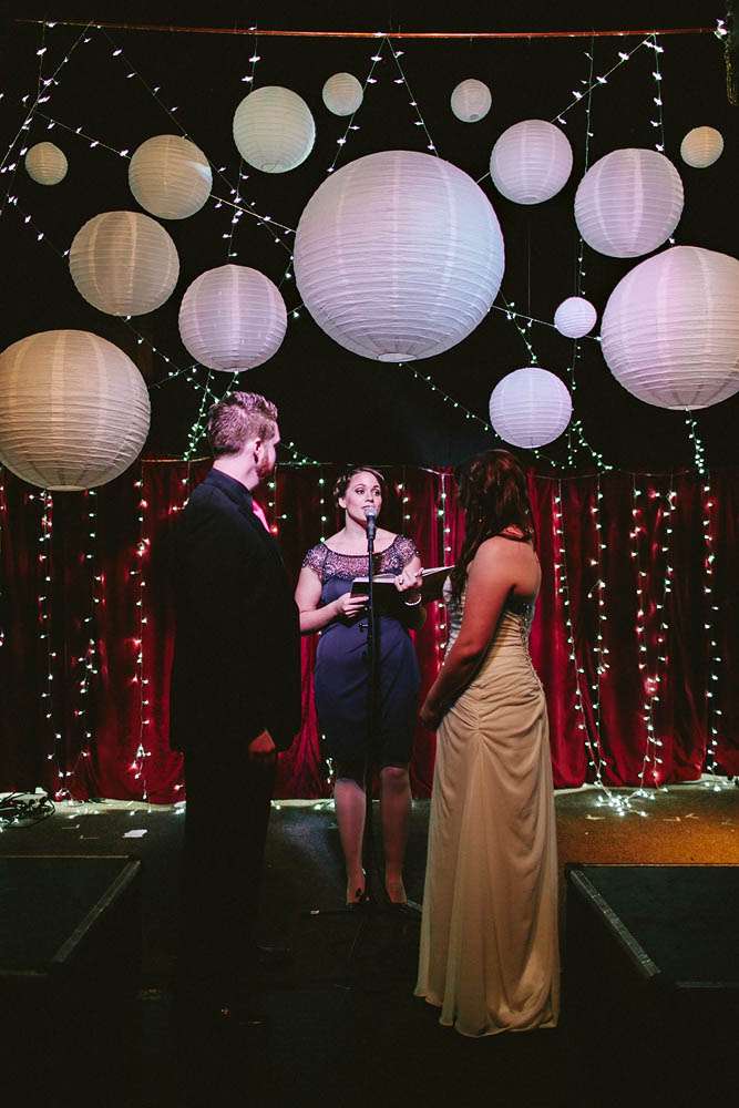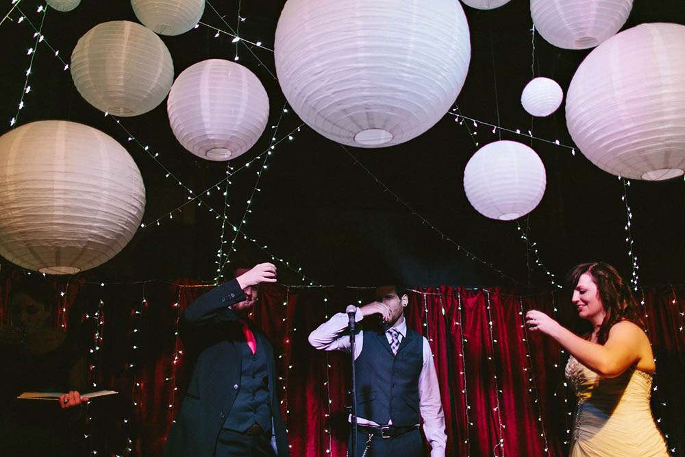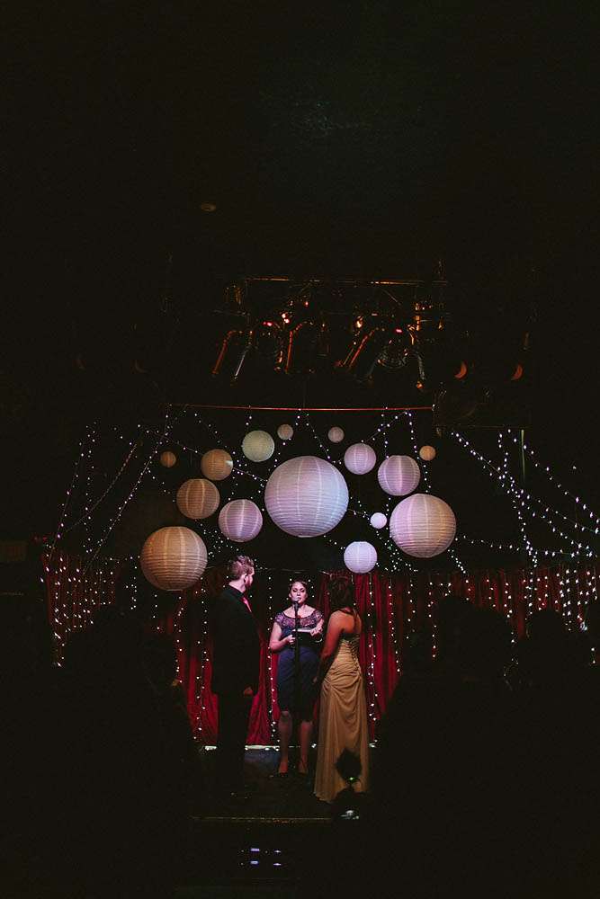 Having a wedding in a bar, the venue didn’t need a lot of decorating but the bride’s sister made three different signs. The first had info about how to hashtag any photos taken and posted, the second was about how to download a photosharing app from wedding.com, and the final one to let the guests know that pinball was on free play all night during the party. The rest of the decorations were just paper lanterns that the bride bought in various sizes which were arranged over the stage with 40 feet of white curtain lights and 60 feet of string lights.