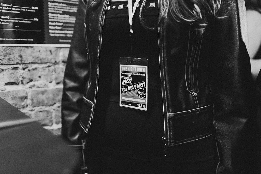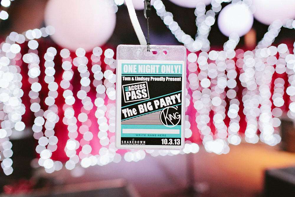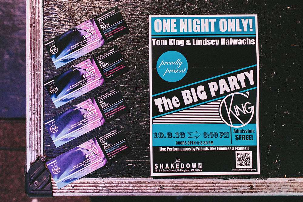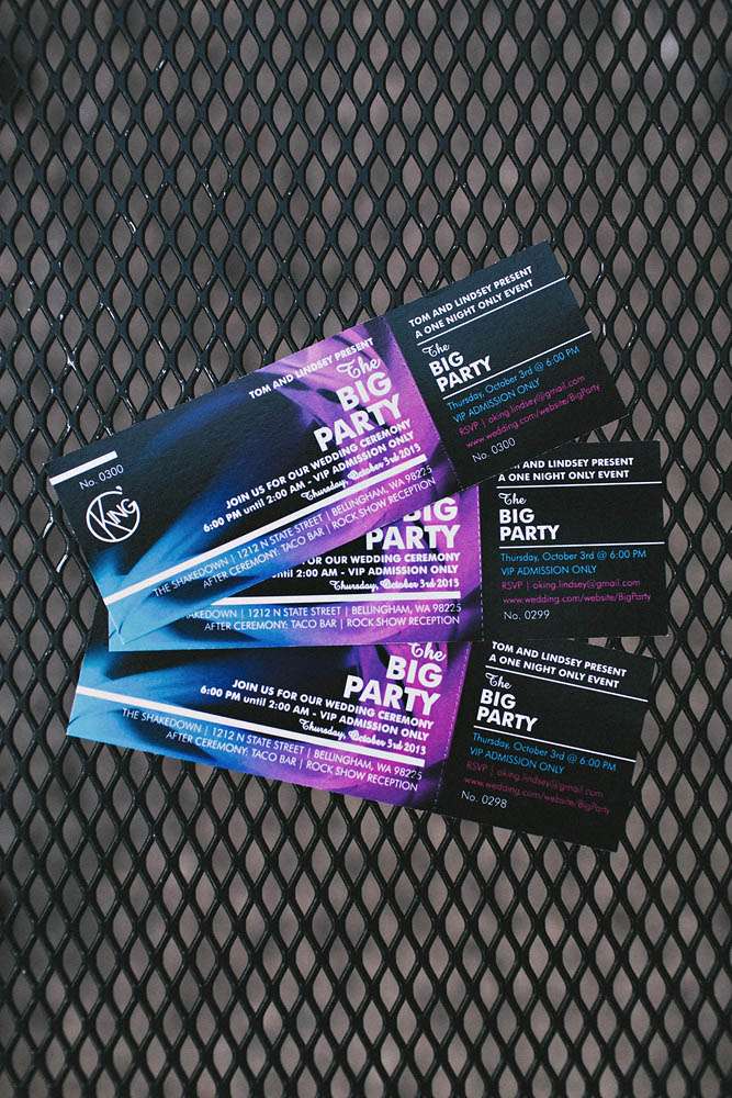 “Next, rather than send out a formal invitation, I built an entire website (QR Code included) and then designed show posters in Photoshop that would become our wedding invitations. I attached the QR Code at the bottom for our tech-savvy friends and then designed concert tickets to go with the flyers that would include details about the ceremony itself, which took place two and a half hours before the Big Party. To keep with the theme, I made backstage passes and event wristbands as well.”