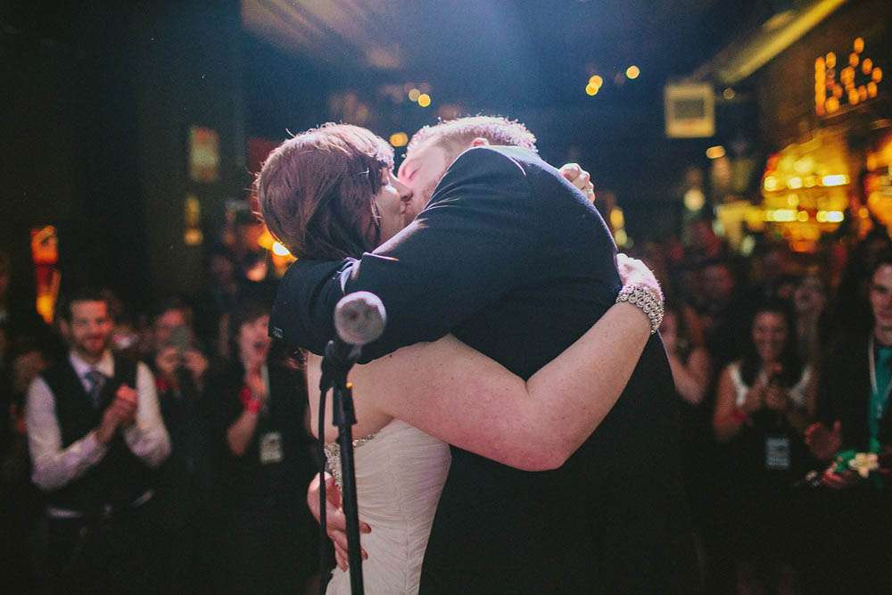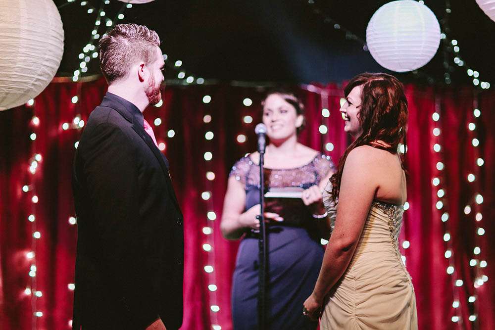 “Our inspiration for our wedding was our relationship itself”, began the bride. “We have always had a ton of friends, gone to shows together, and eaten amazing, bad-for-you food. I’d say probably the first thing we decided to do differently was have our wedding at a bar. We met in college, on what’s known as Thirsty Thursday in the university world which is why we chose to get married at a bar on a Thursday. When we approached The Shakedown, I think they were surprised that we wanted to have our wedding there, but they were very cool and very excited to make it happen.”