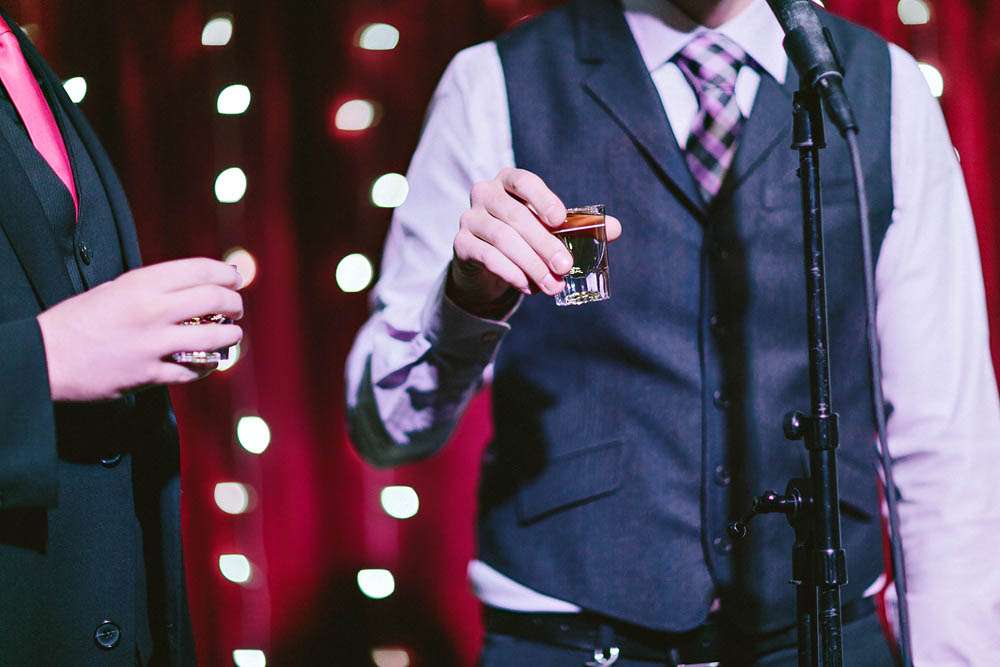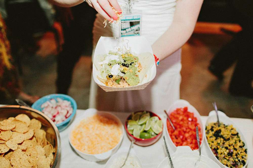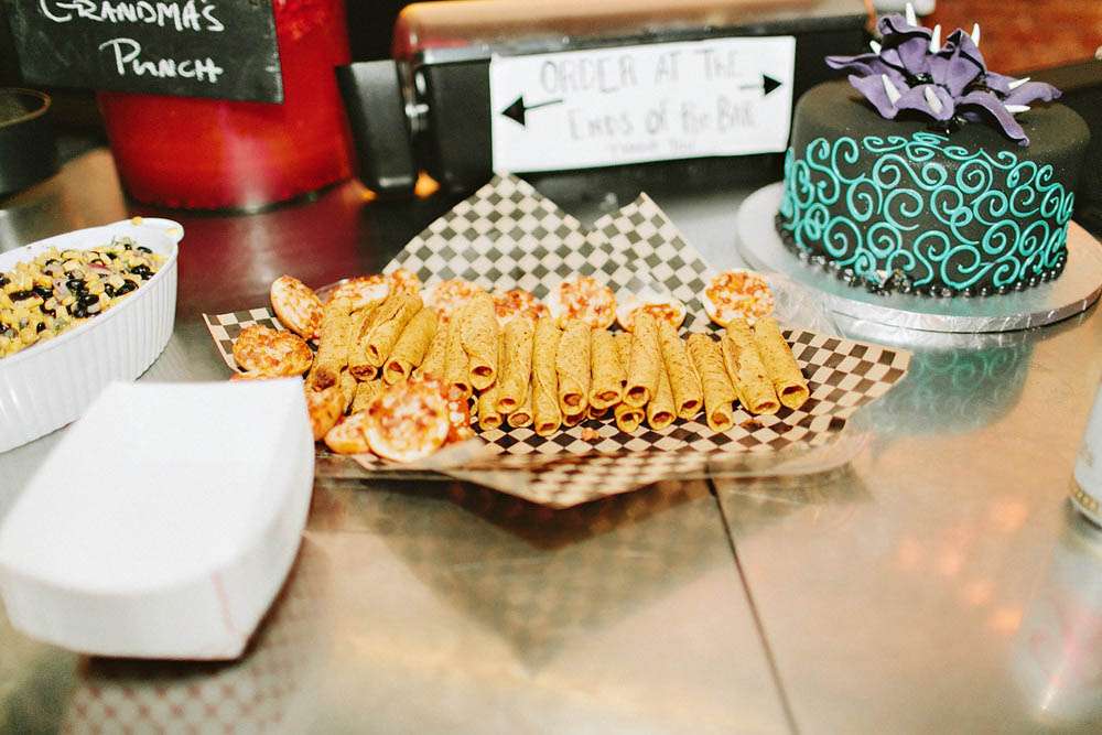 “One of the last things is that we really focused on having was food and drinks that people would love so we had traditional bar food or college food – a taco buffet for dinner and onion rings, bagel bites, mini burritos, and other delicious fried confections for the reception. We also had a gigantic drum of ‘grandma’s punch’, which was my grandmother’s recipe for brunch punch that we added a large amount of liquor to. Of all of these things, perhaps the most unique is that, rather than having a reading or prayer or musical performance during the ceremony, we had our friend Ian Graham make a spirited toast and then all of our guests took a shot of whiskey with us.”