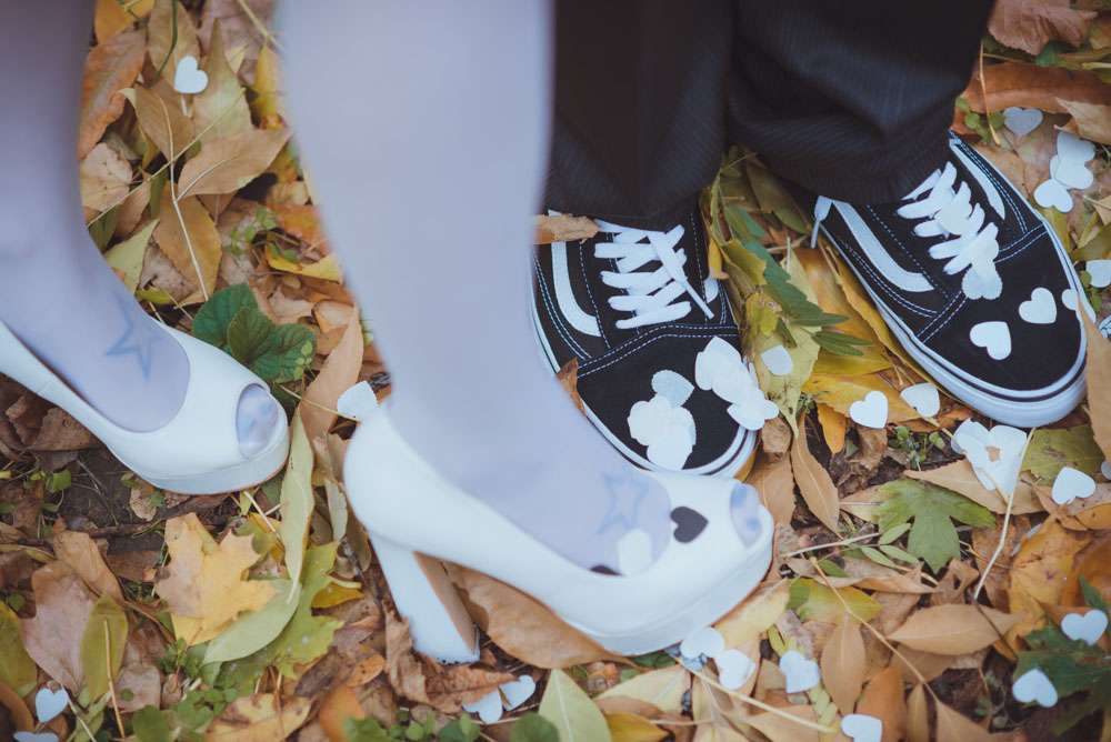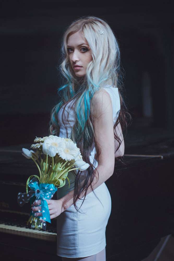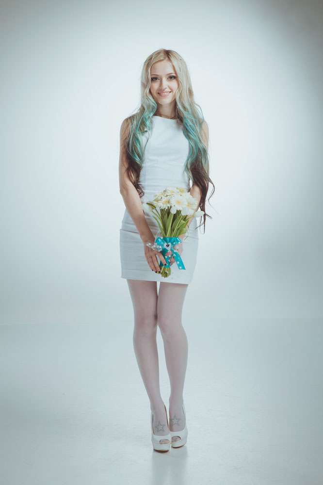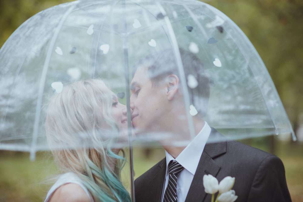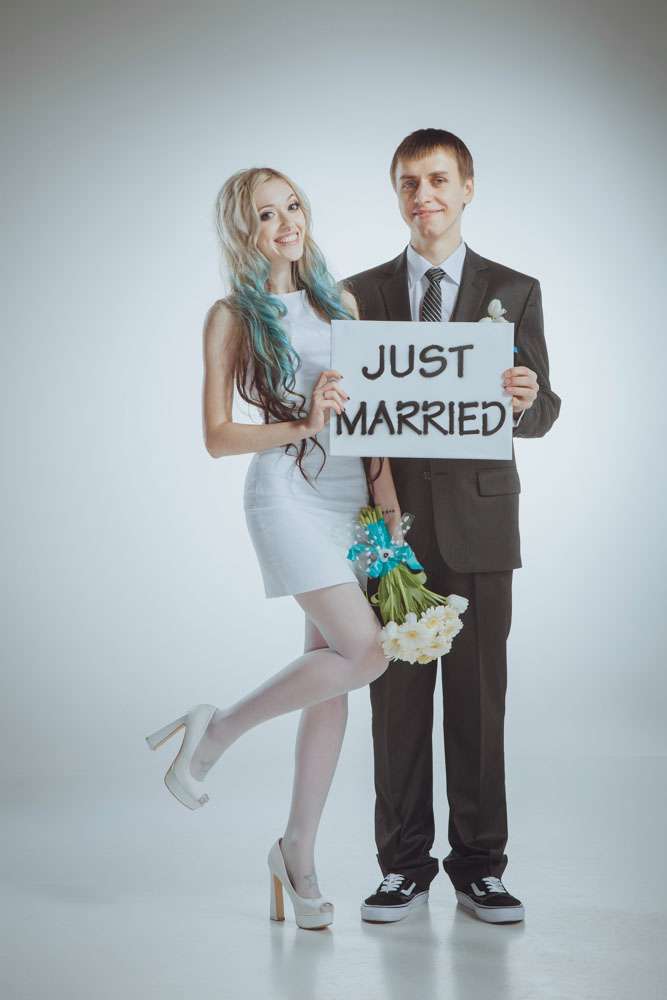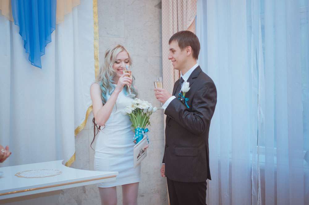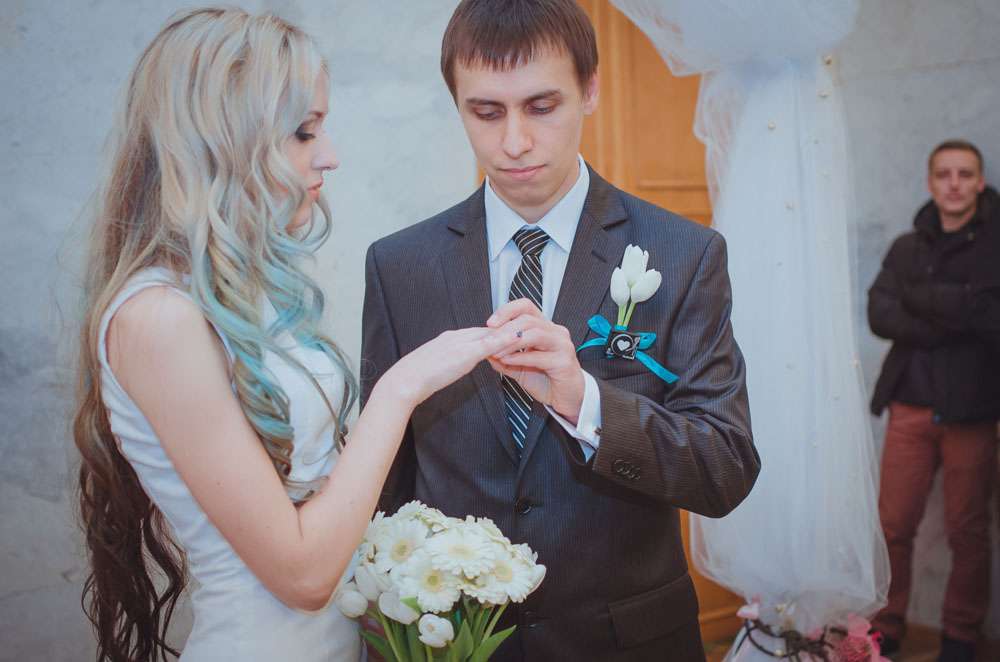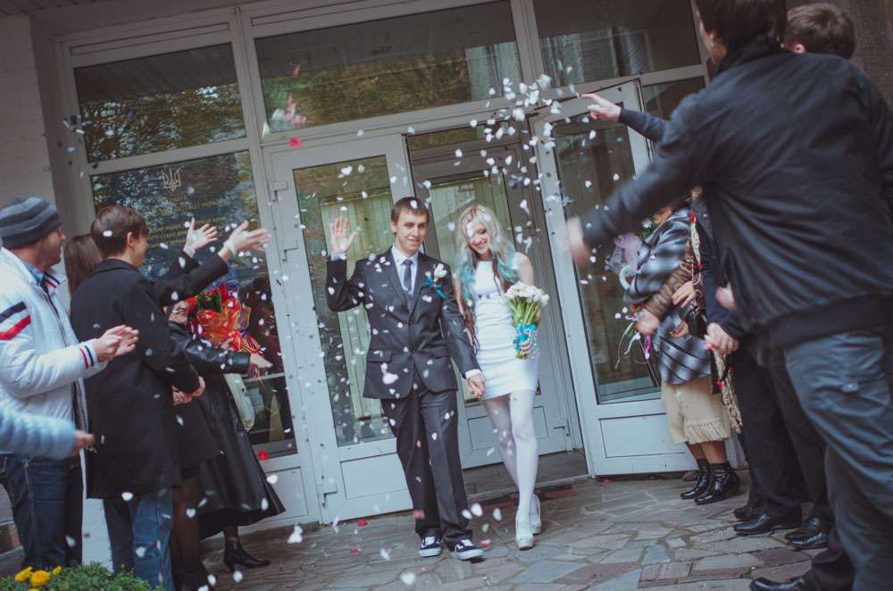 Annie wore an non-traditional wedding dress which she had made by Ekaterina Bondarenko. She wore blue Converse and white pumps and her hair was dip dye blue! “I’m so tired of all those long white puffy and frou frou princess dresses, and I didn’t want to waste money on a dress which I put on once, so my dress was quite inexpensive. It cost me only $100 and I love it! It was made by a girl who was recommended to me by one of our friends. She doesn’t even own a store. My shoes were $25 and Evgeniy’s suit was inexpensive too.”