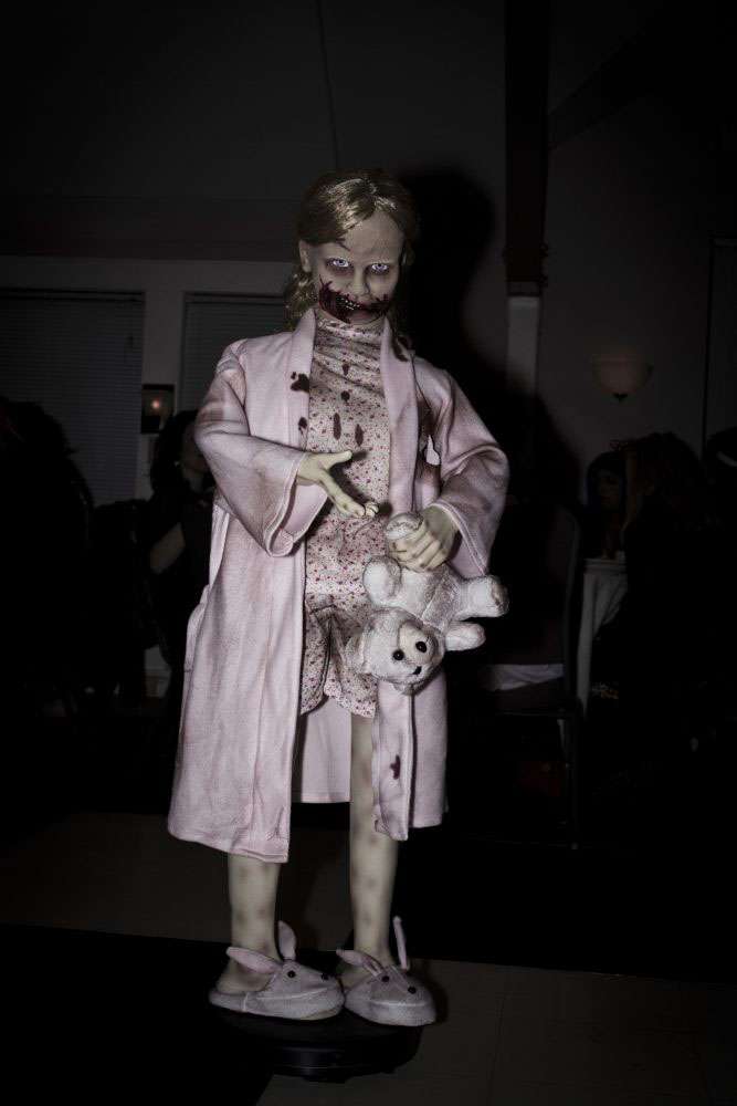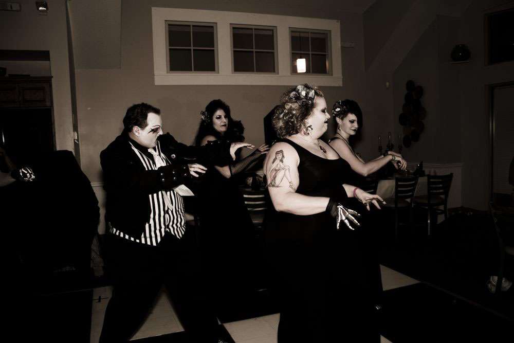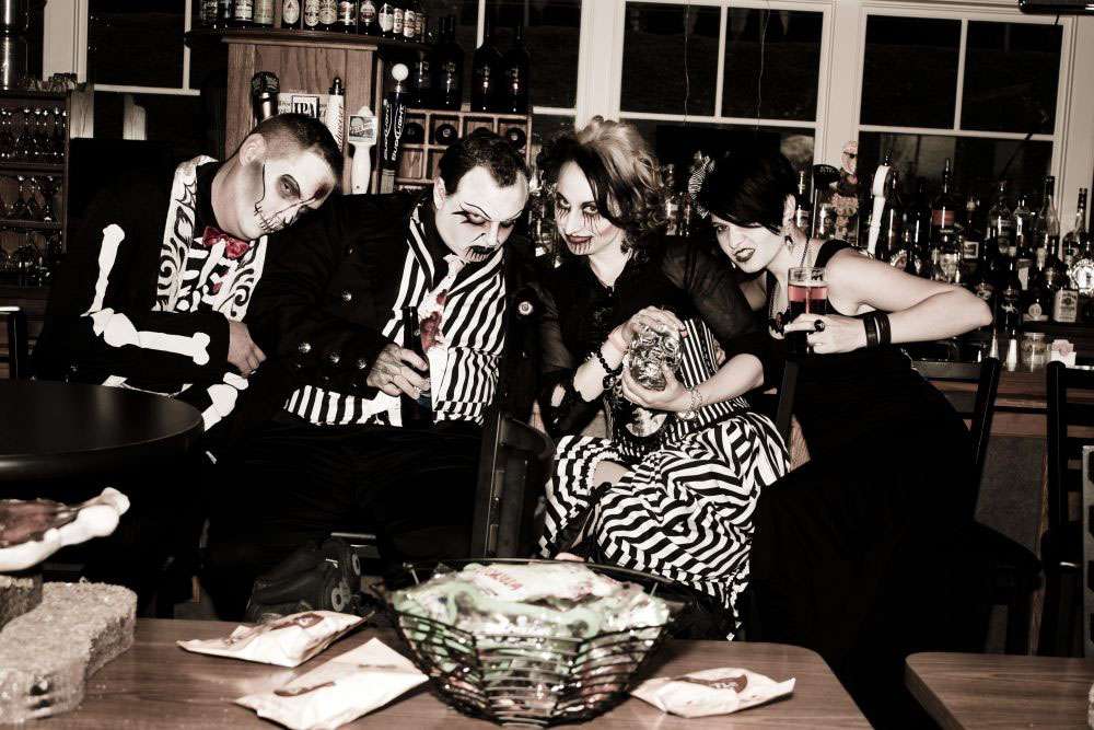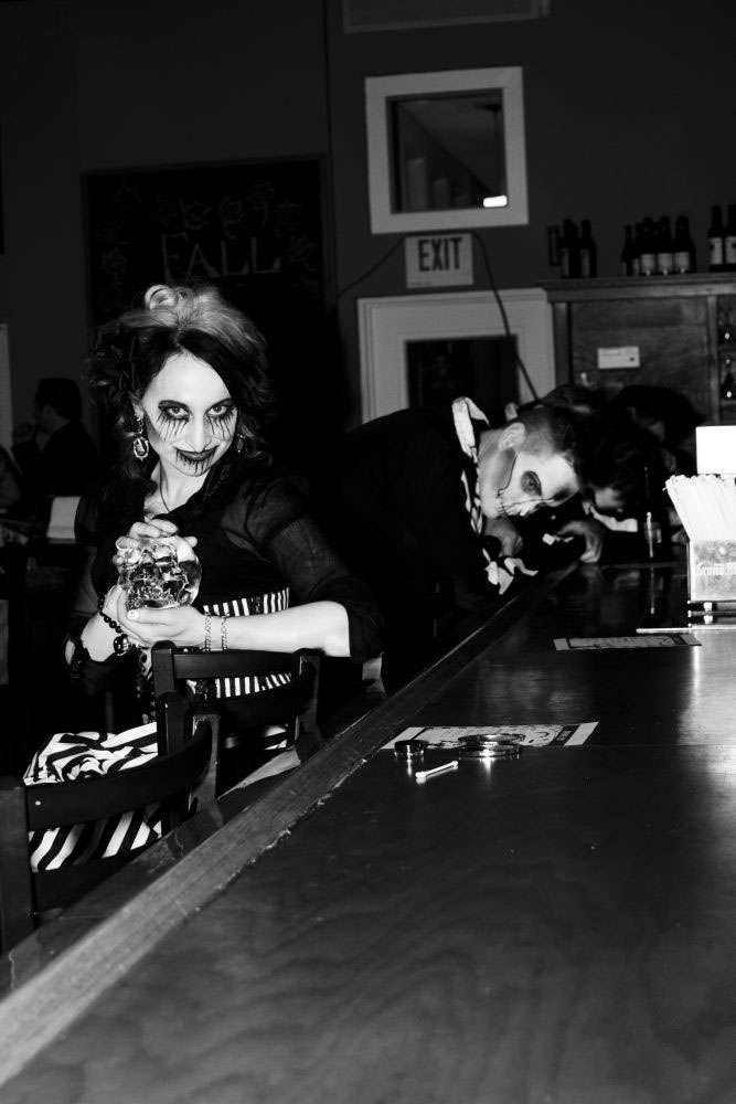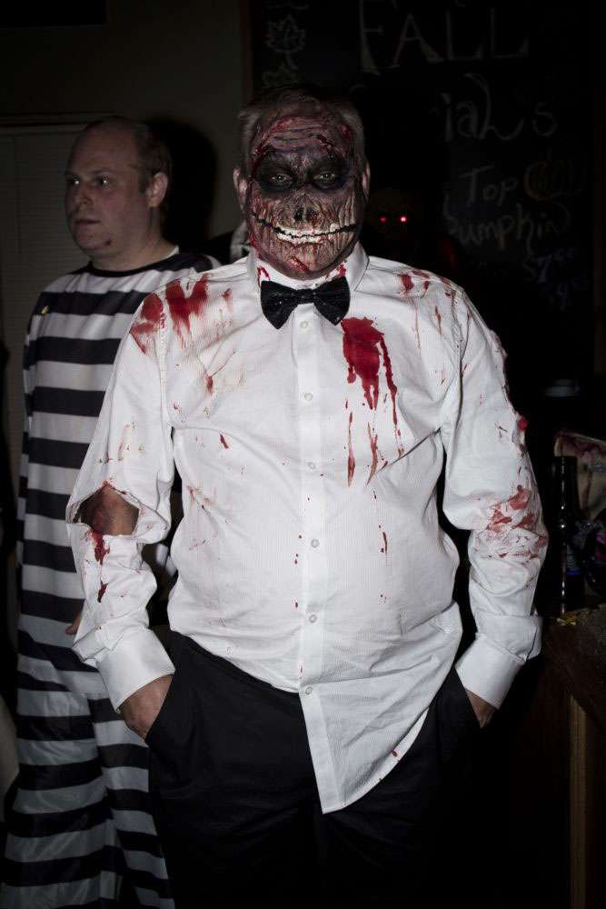 “We needed to have some bad ass decorations but we didn’t have a huge budget”, she continued. “One of the coolest things we had were two projectors set up, one inside the room and one outside. The one inside played blood dripping down the ceiling that also wrote out ‘murder’, ‘get out!’ and other fun things. The one outside was my favorite. It was set up to play on the windows and it looked like zombies were scratching at them in. The dvd’s were $40 each and we borrowed the projectors from friends. We also used toe tags to write down people’s names, table numbers and, of course, how they died. The table numbers were carved into pumpkins. They were a nice, inexpensive touch.”