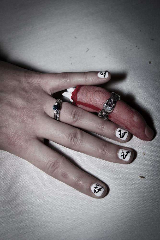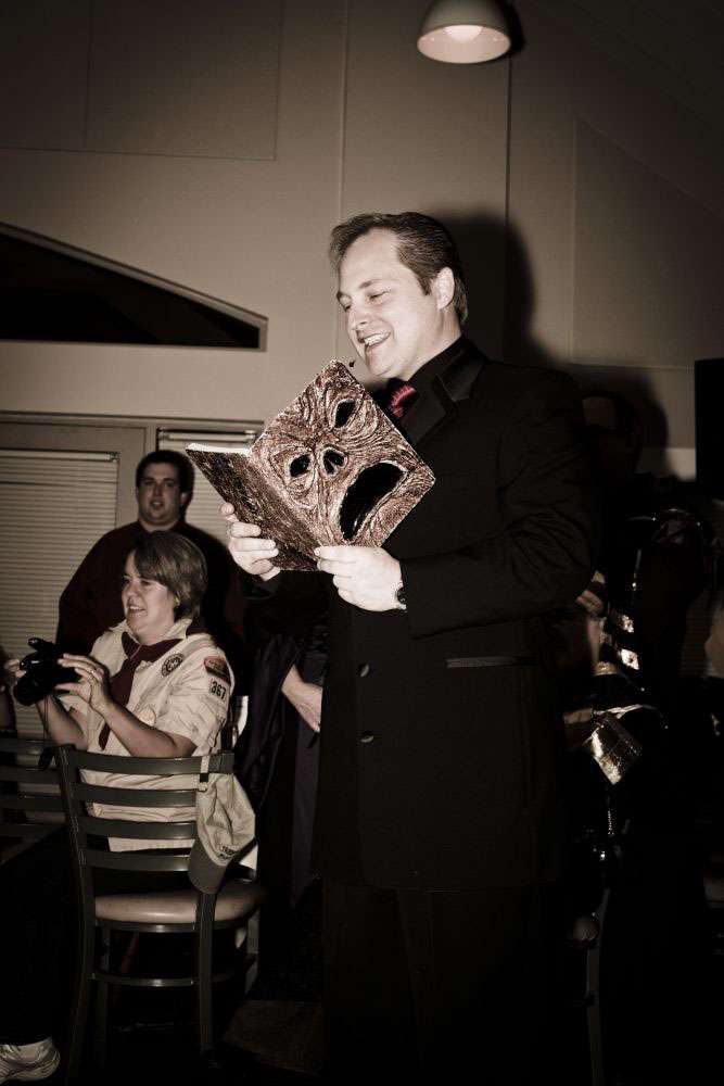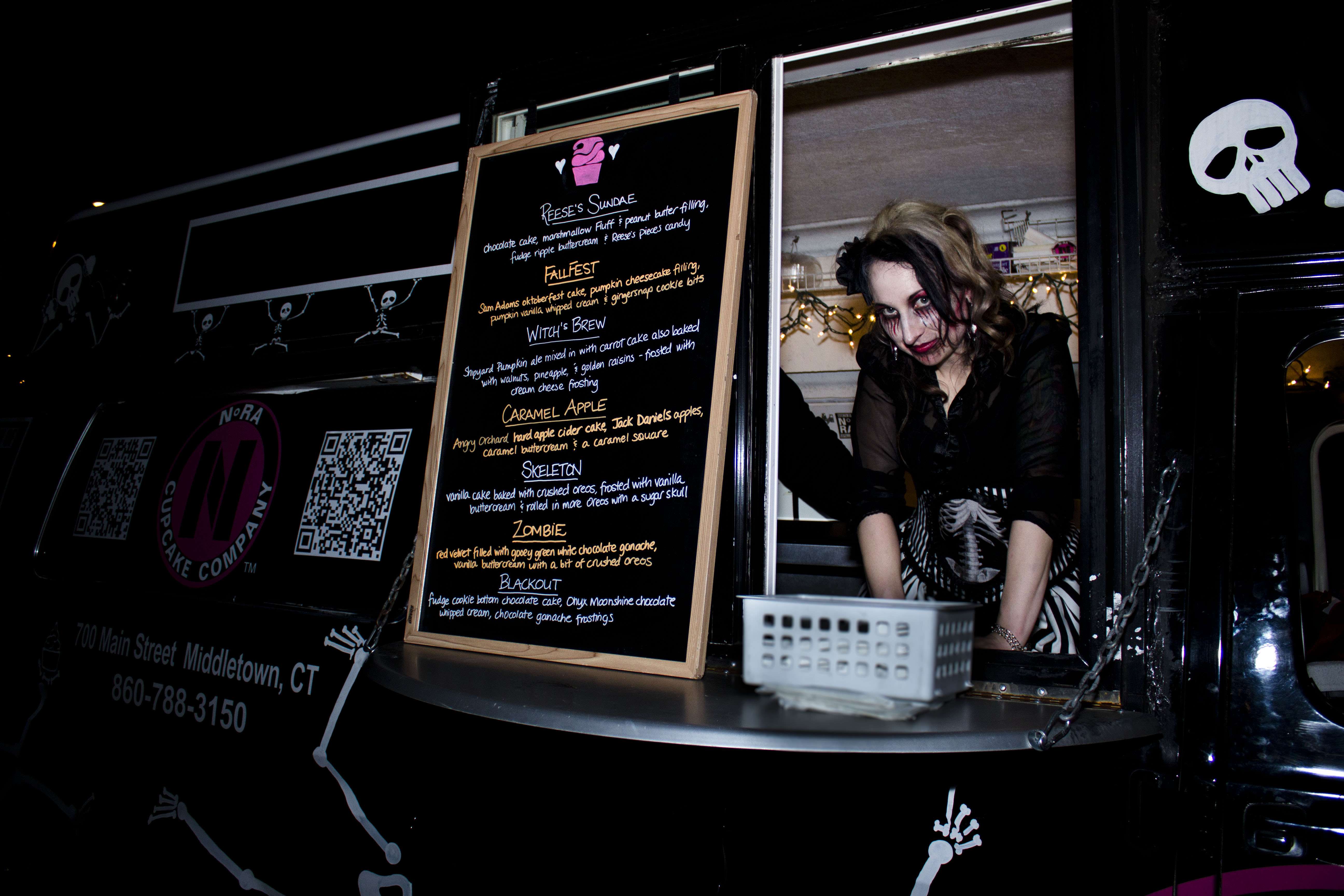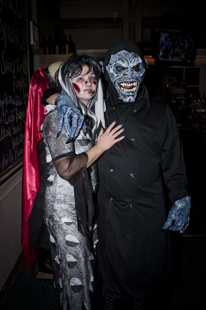 “We needed to have some bad ass decorations but we didn’t have a huge budget”, she continued. “One of the coolest things we had were two projectors set up, one inside the room and one outside. The one inside played blood dripping down the ceiling that also wrote out ‘murder’, ‘get out!’ and other fun things. The one outside was my favorite. It was set up to play on the windows and it looked like zombies were scratching at them in. The dvd’s were $40 each and we borrowed the projectors from friends. We also used toe tags to write down people’s names, table numbers and, of course, how they died. The table numbers were carved into pumpkins. They were a nice, inexpensive touch.”