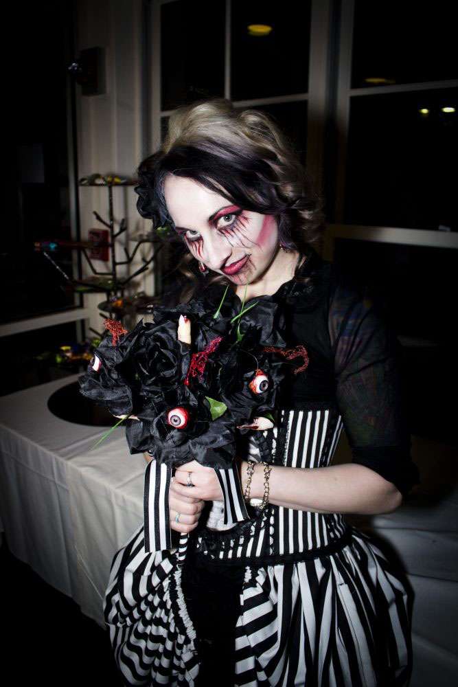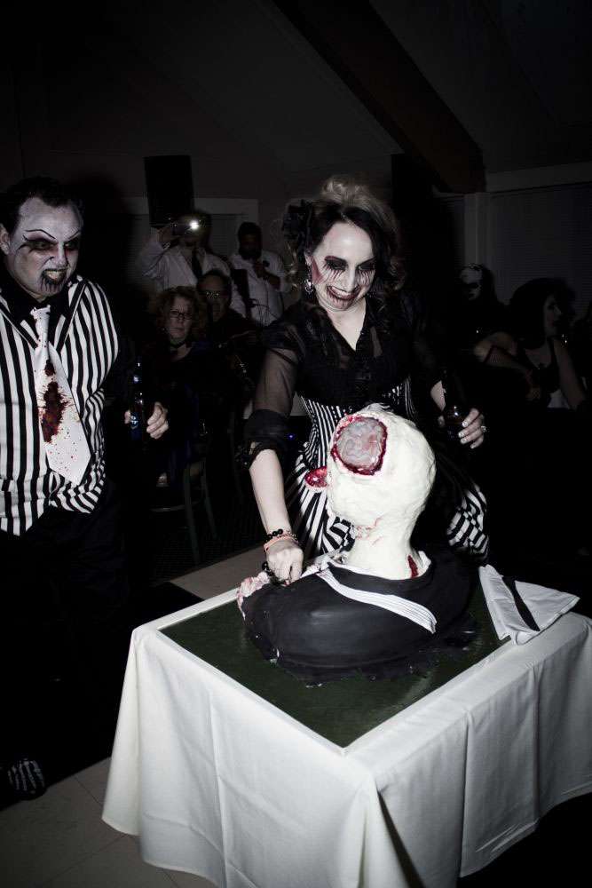 “There was absolutely nothing normal about this wedding. Walking down the aisle wasn’t interesting enough so the groom and bridal party danced into the room to Thriller. I was carried down the aisle in a coffin by the groomsmen I’m not sure if I would ever want to do that again but at least it was memorable! Also, I’m not too keen on speaking in public so we did magic shows instead of reciting vows. It was a lot easier being cut in half and then stabbing the groom instead of having to say more than a couple of words. The zombie cake was also a hit. It made some people a little uneasy (it was dyed red on the inside) but it was delicious.”