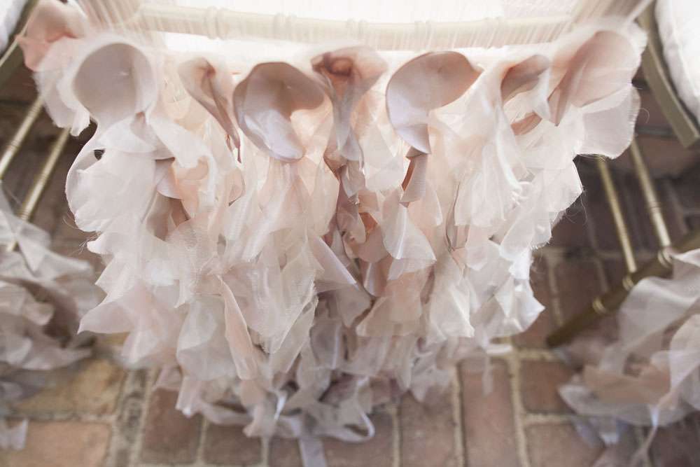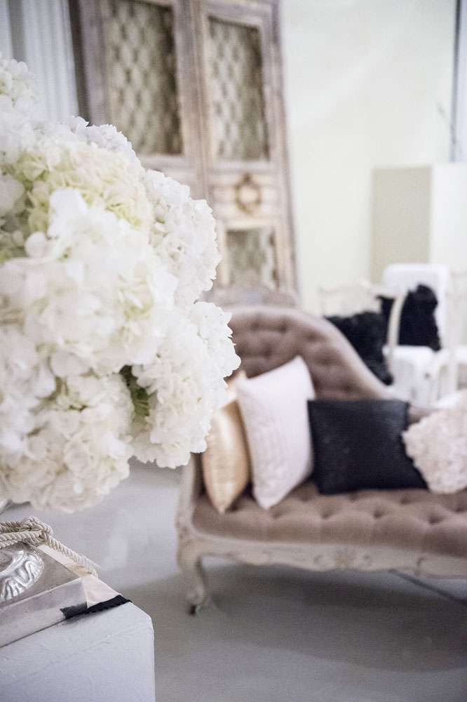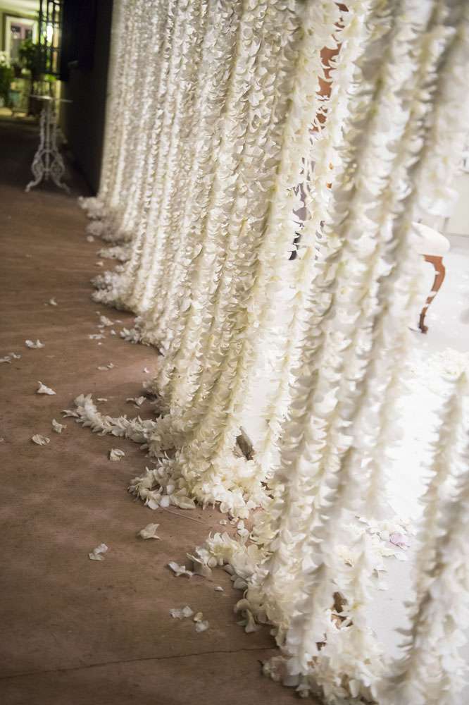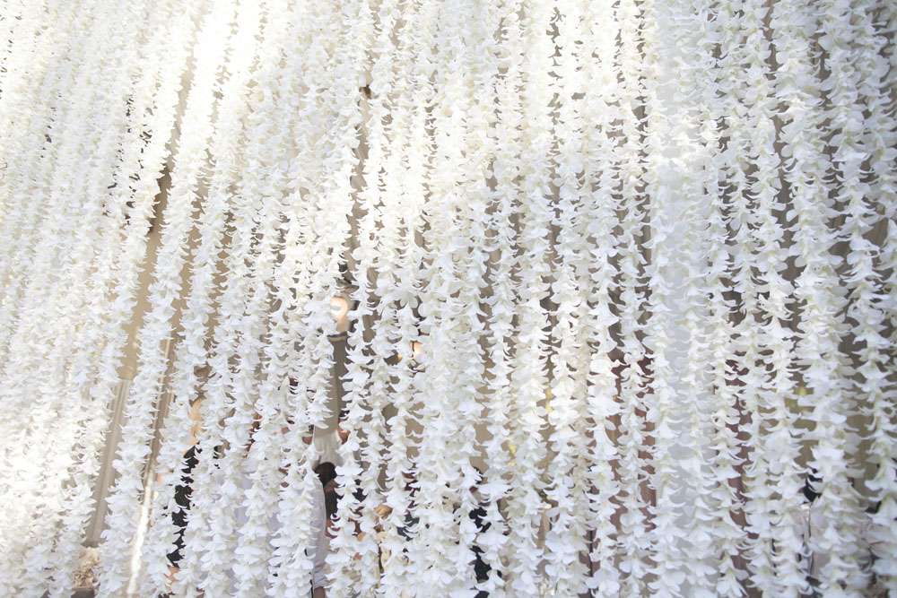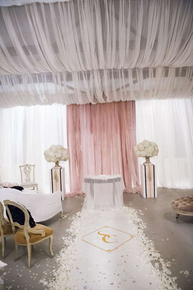 Despite the extravagance the renewal was intimate, personal and heartfelt as Liberty explained, “Upon arrival guests made their way through a 25ft white hanging flower wall entrance, where they were seated at stunning styled vignettes. A combination of vintage settees, ottomans, and armchairs accented with modern black and blush throw pillows, creating an opulent setting for the ceremony seating. Billows of flowing linen covered the walls and ceilings while blush and ivory ribbons posed as the perfect backdrop for the bride and groom to say I do… again.”