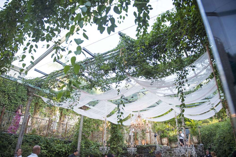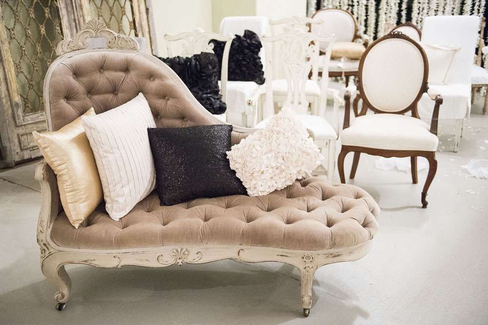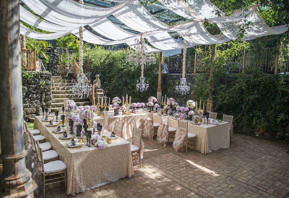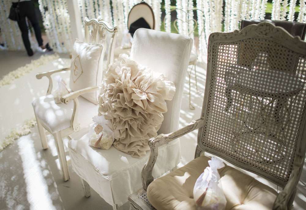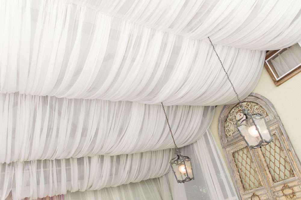 Despite the extravagance the renewal was intimate, personal and heartfelt as Liberty explained, “Upon arrival guests made their way through a 25ft white hanging flower wall entrance, where they were seated at stunning styled vignettes. A combination of vintage settees, ottomans, and armchairs accented with modern black and blush throw pillows, creating an opulent setting for the ceremony seating. Billows of flowing linen covered the walls and ceilings while blush and ivory ribbons posed as the perfect backdrop for the bride and groom to say I do… again.”