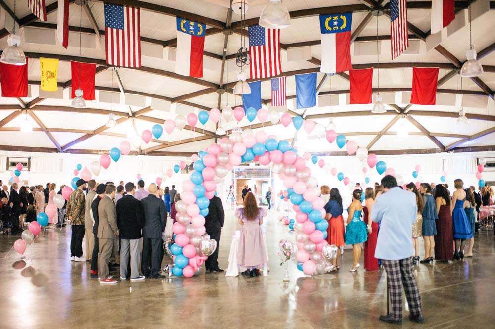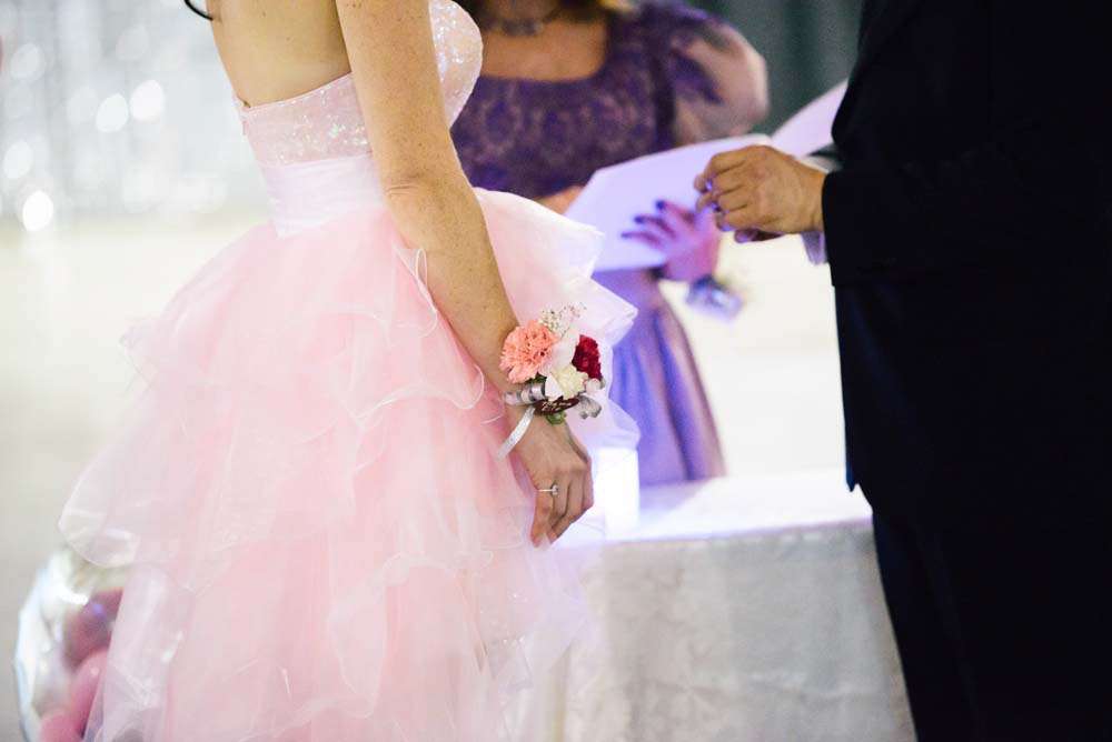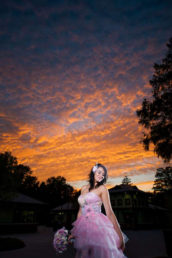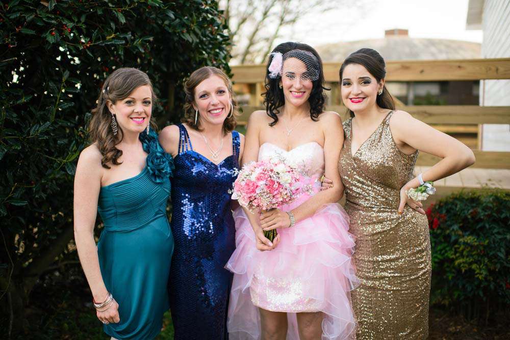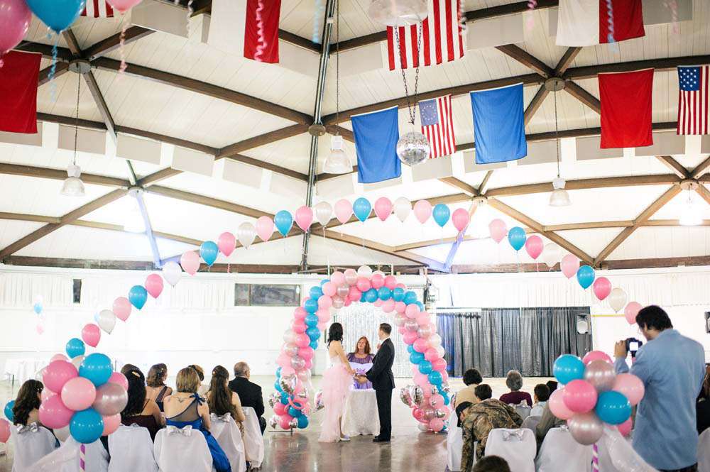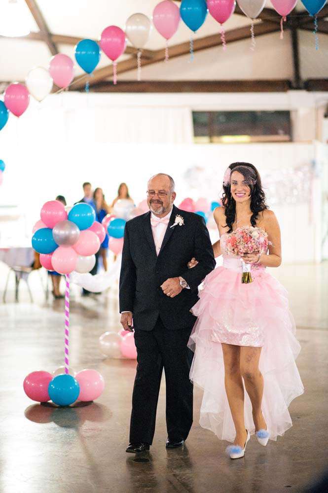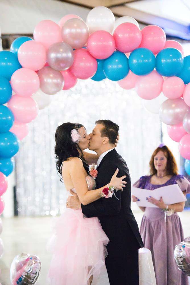Elizabeth and Juan wanted their December wedding to be just like a High School Prom. “Our wedding theme helped everyone get in to the Prom spirit, attendees dressed in prom attire, and we went absolutely crazy with balloons”, began the bride. “Our wedding party was such a mixed, motley crowd. We wanted everyone to have fun and use their own style for their outfits. We wanted to run screaming from the traditional thing and my’s dream came true with my perfect pink dress. Our officiant even wore a purple prom dress!”