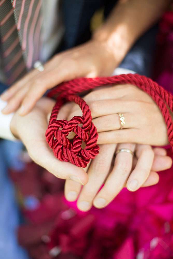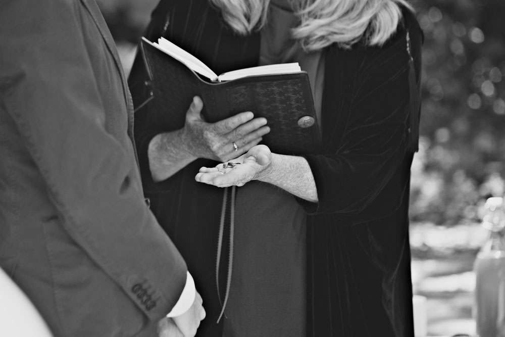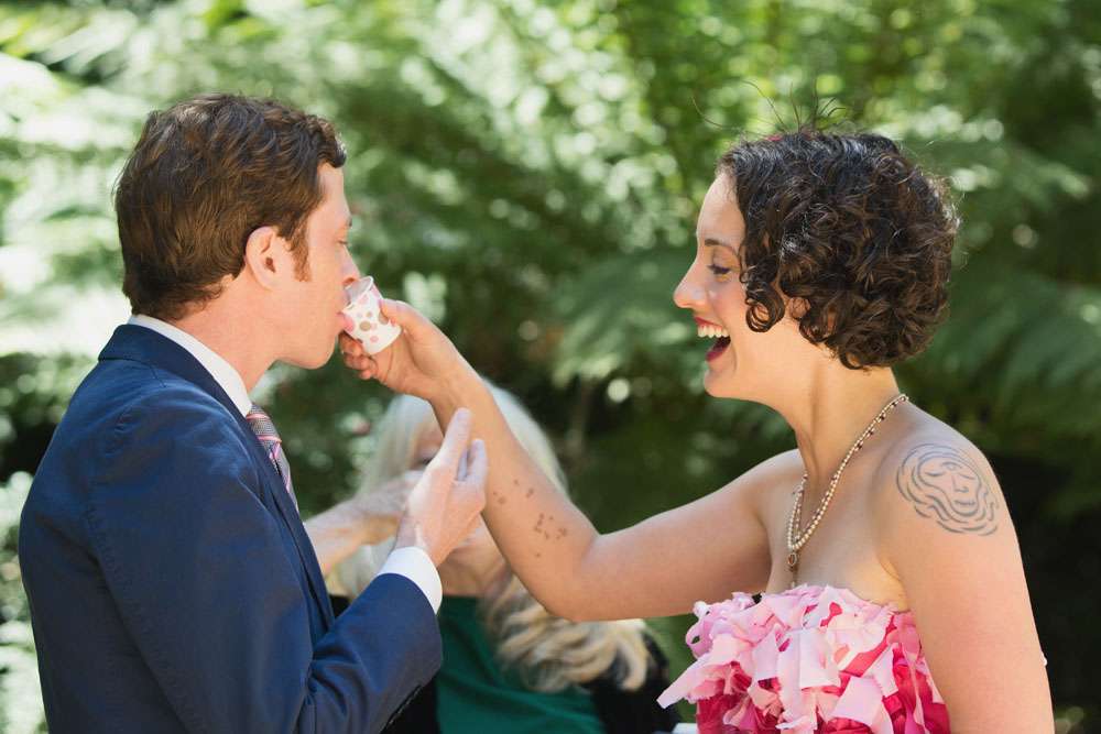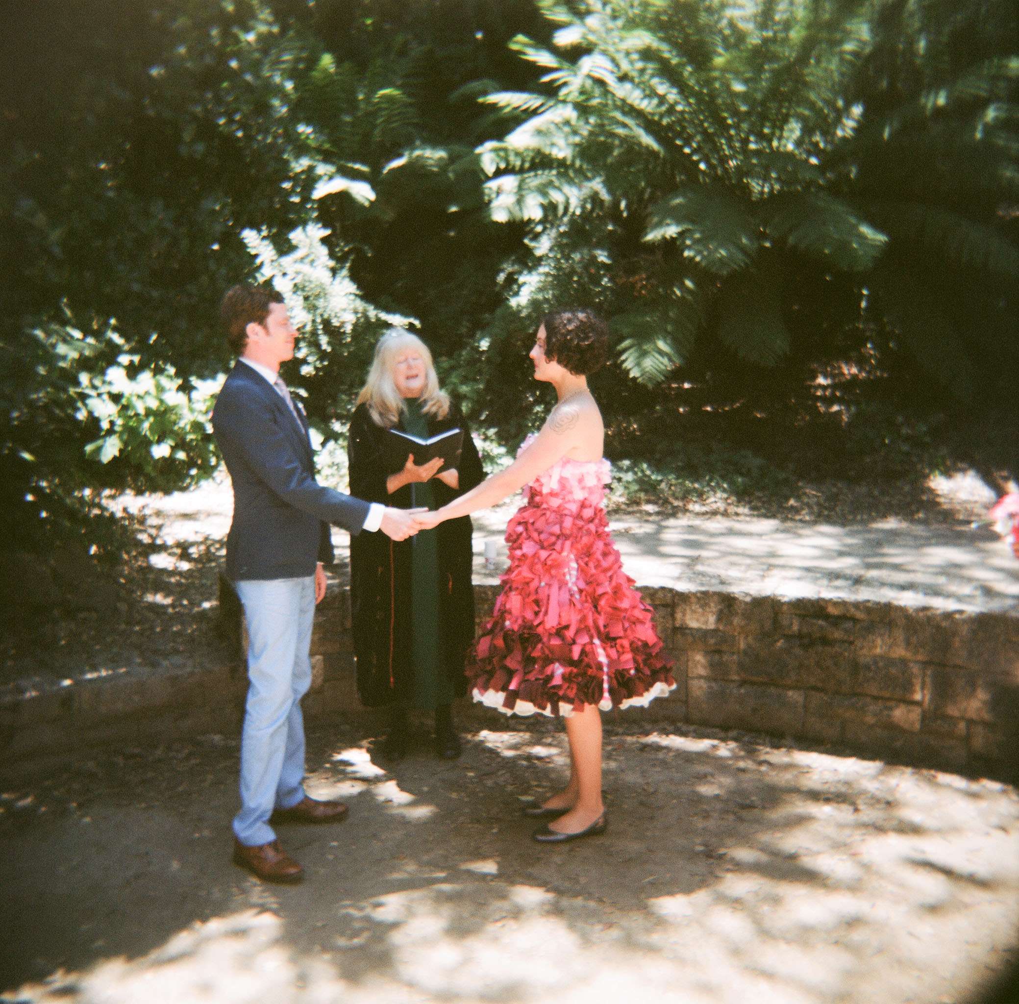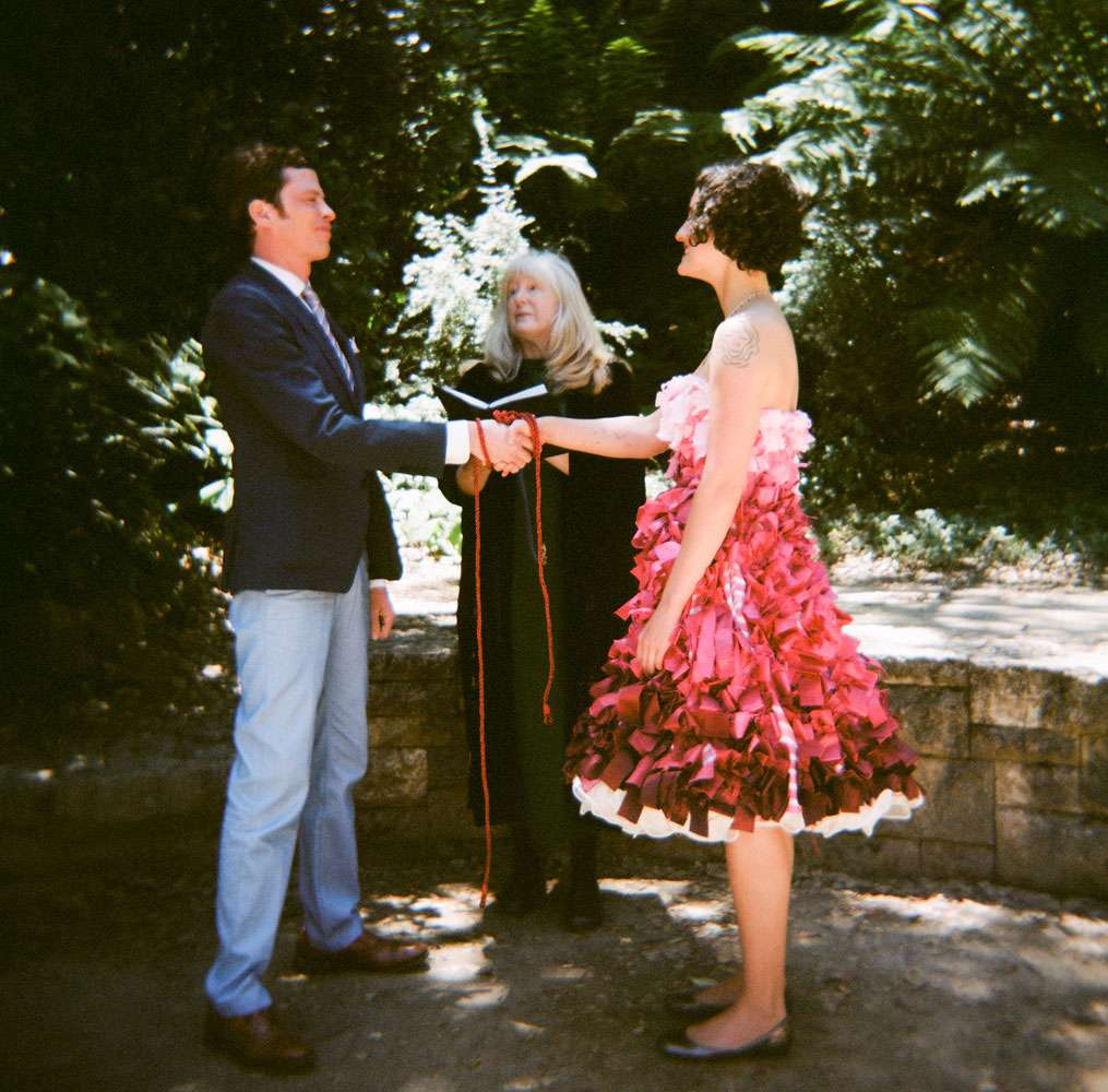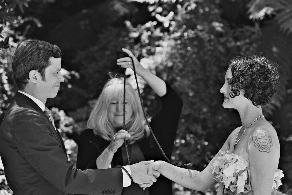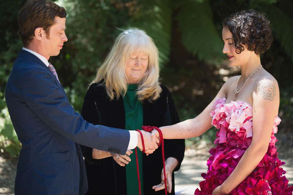 “We chose a handfasting ceremony because it was ceremonial but not religious. We found our officiant Cynthia by searching online for ‘non denominational wedding officiant’. We don’t consider ourselves to have any kind of religion but I have Pagan leanings (tea brewing, tree hugging, rose sniffing, nature lover) and Shannon thought it would be fun to see Cynthia in her Pagan robes!”
