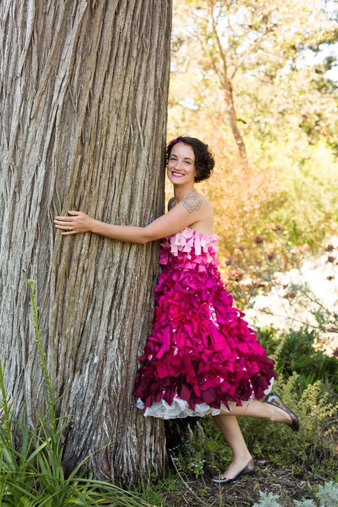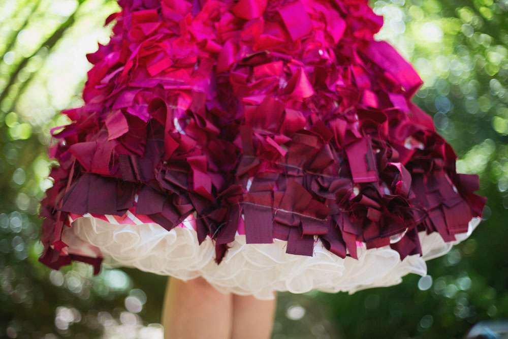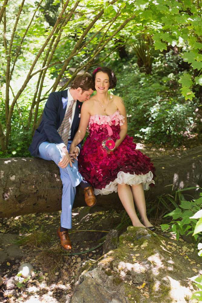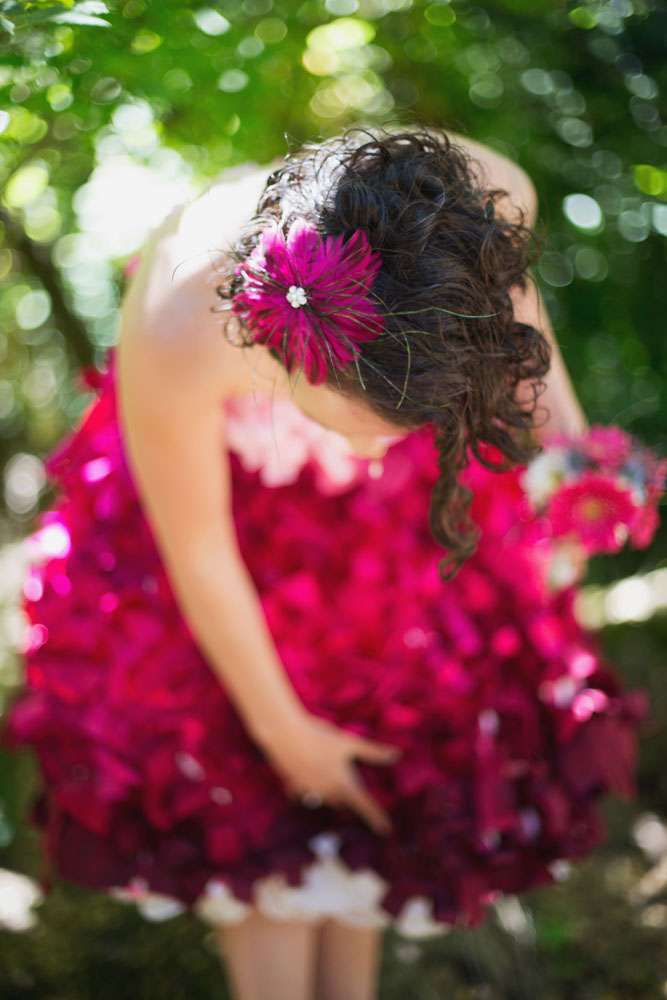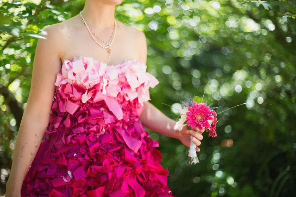 “I put two dresses together and then pinned the ‘petals’ of silk to the base dress in a gradient of colors from light pink to burgundy”, she explained. “I added a right pocket with a ring holding ribbon to keep my future husband’s new piece of jewelry secure and a left pocket for my iPhone! I knew I wanted to make my own dress because making costume-like clothing is my favorite way to express myself.”