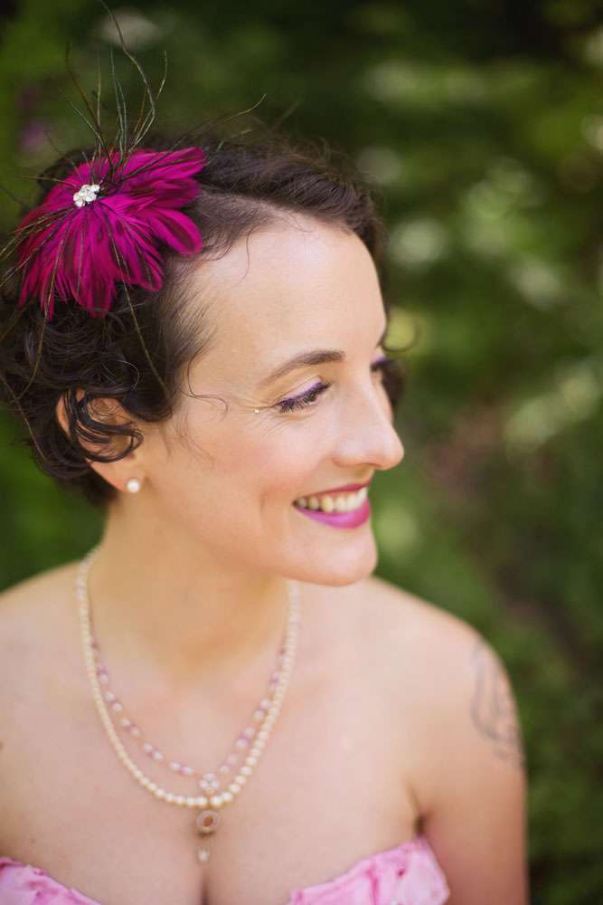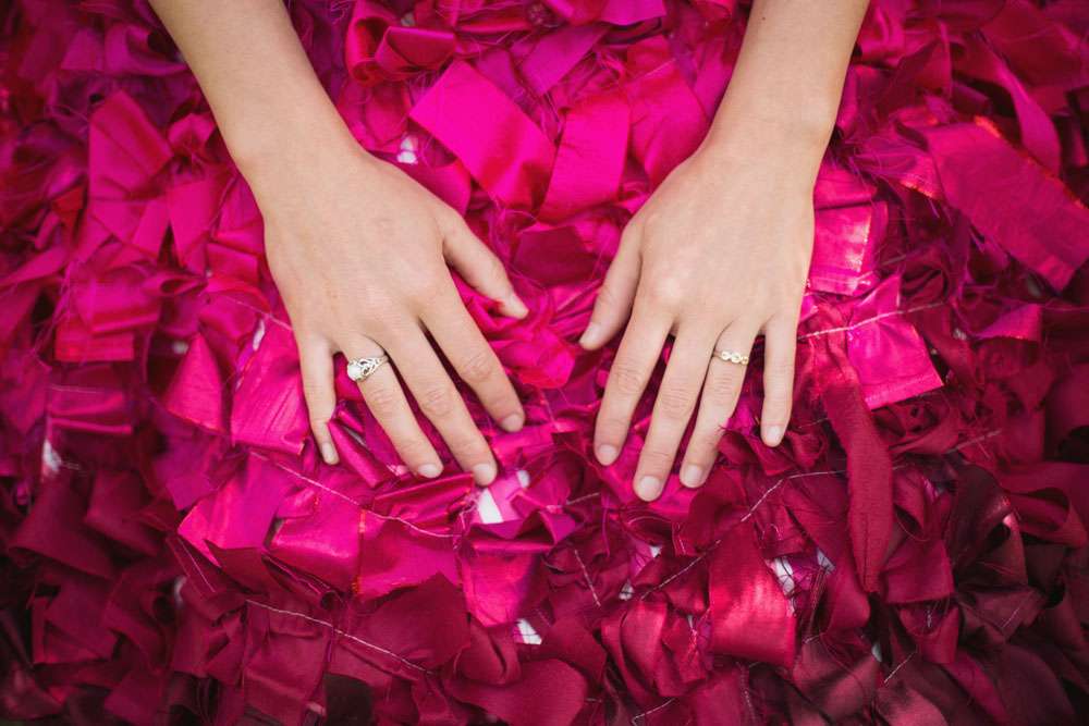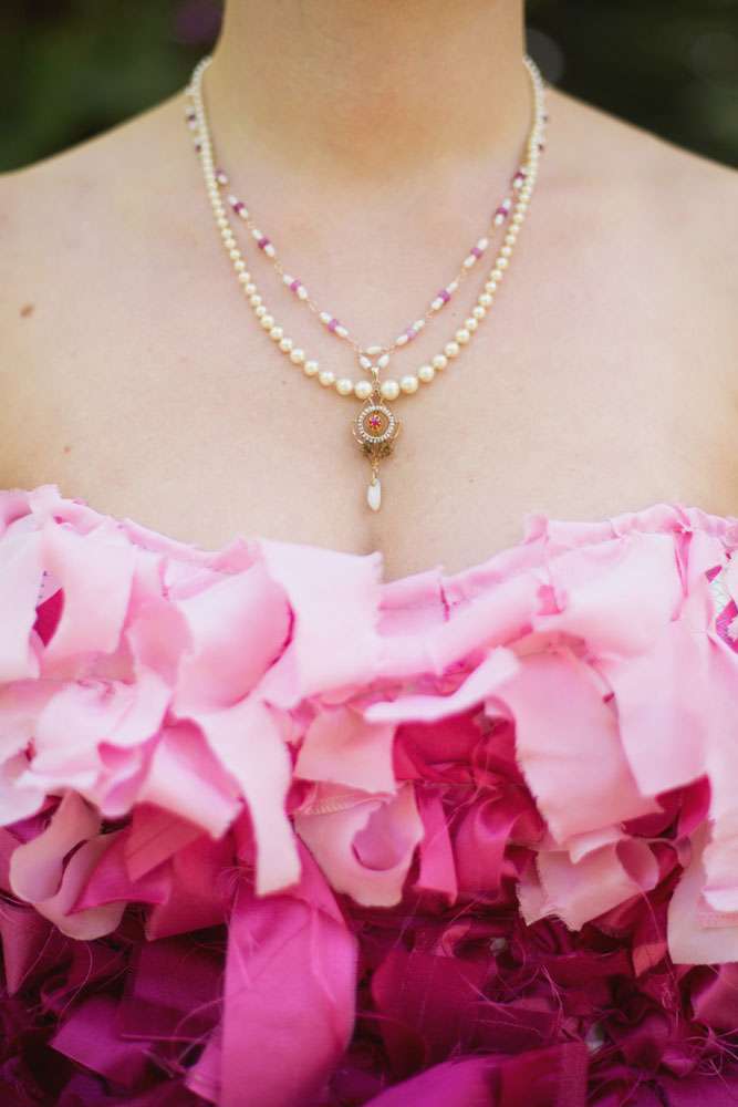 “I was never really excited about the color pink but when my artist friend, Nicole Sillapere, was selling off old event stock and I found the pink ombre silk panels, I knew I would do something wonderful with them someday. This was actually before we got engaged so as soon as Shannon proposed and I started thinking about what I would wear to our wedding and the dress just came to me.”