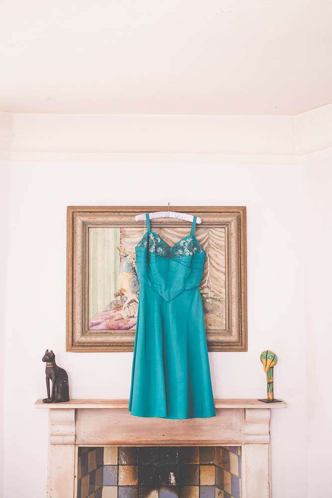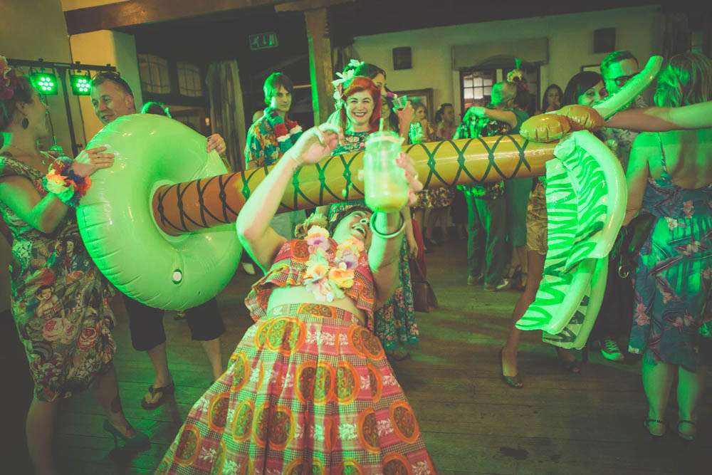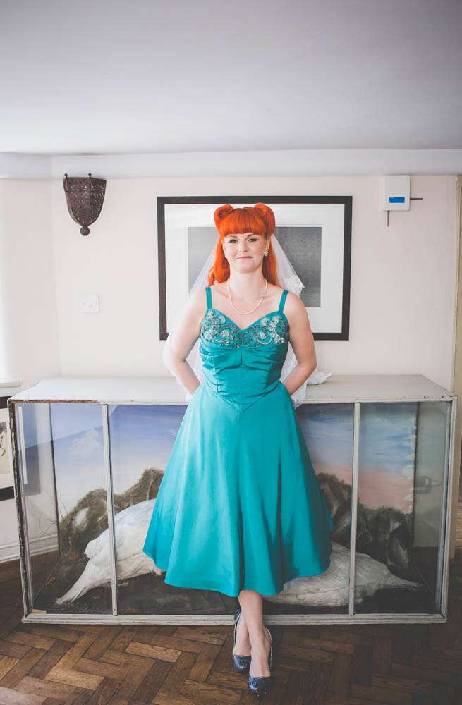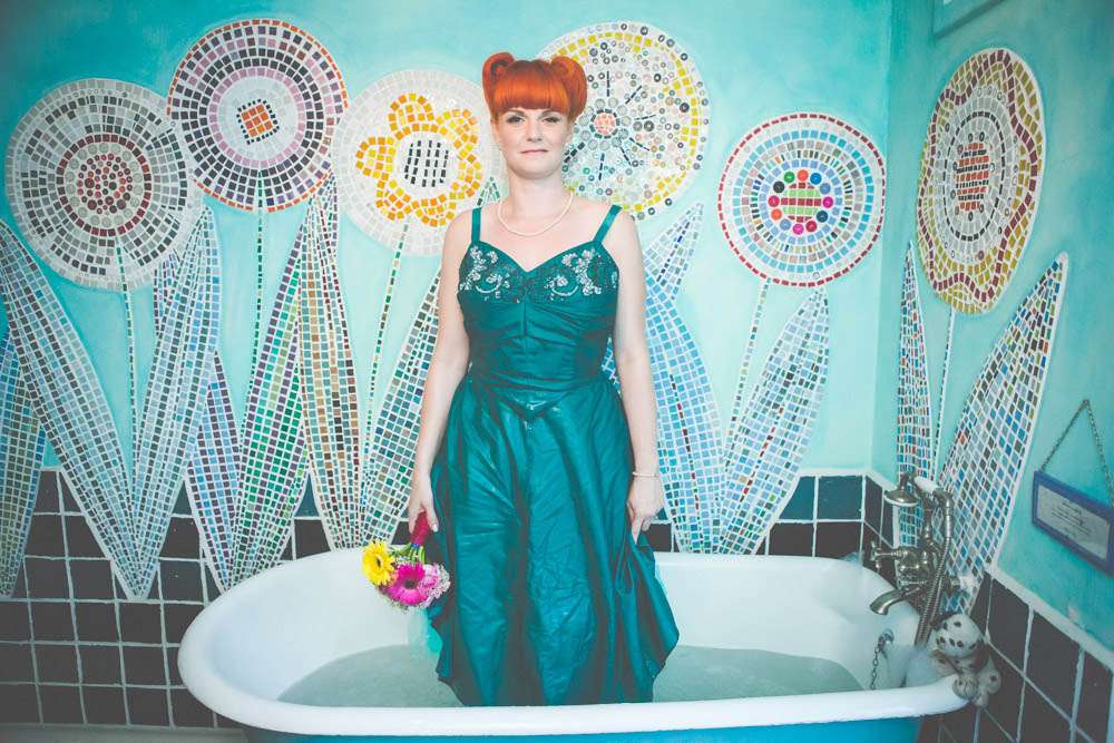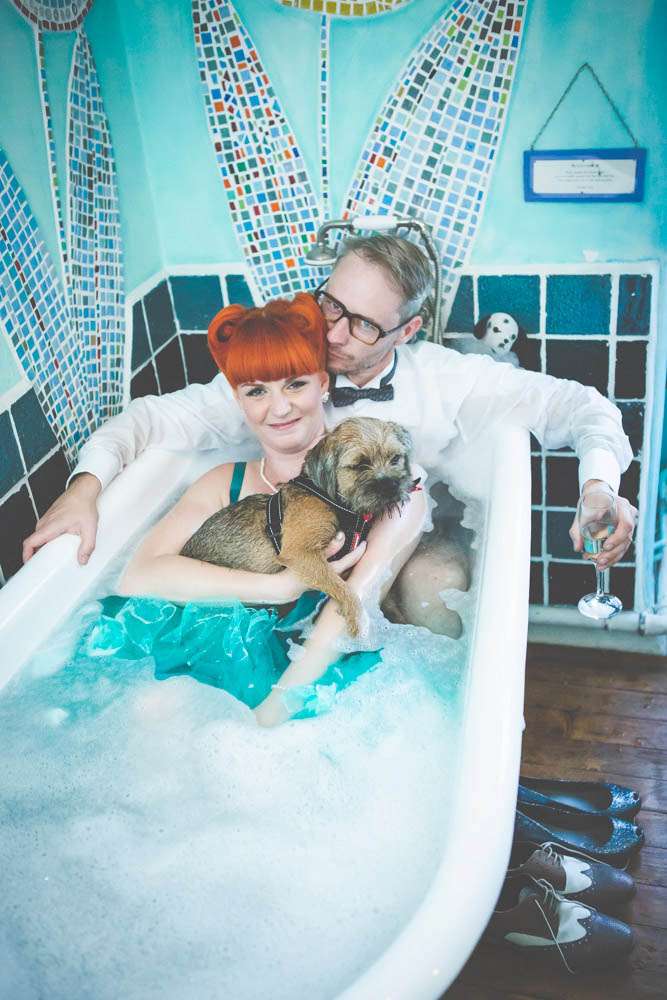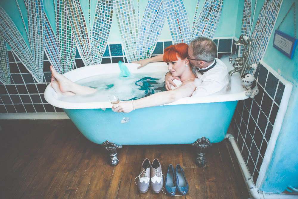 The bride wore two dresses (well she needed something to get changed into after the bath photos!) Her beautiful blue gown was vintage and her evening dress was from Vivien of Holloway. “We both love to dress up and a 50s theme was just perfect as it allowed people the flexibility to wear a style that suited them. We had people in Hawaiian shirts, others in formal attire, some in bikinis and loads in evening dresses! Although we had the guiding themes for the daytime and evening, we also stressed that people could turn up in Converse and shorts if that’s what they wanted.”