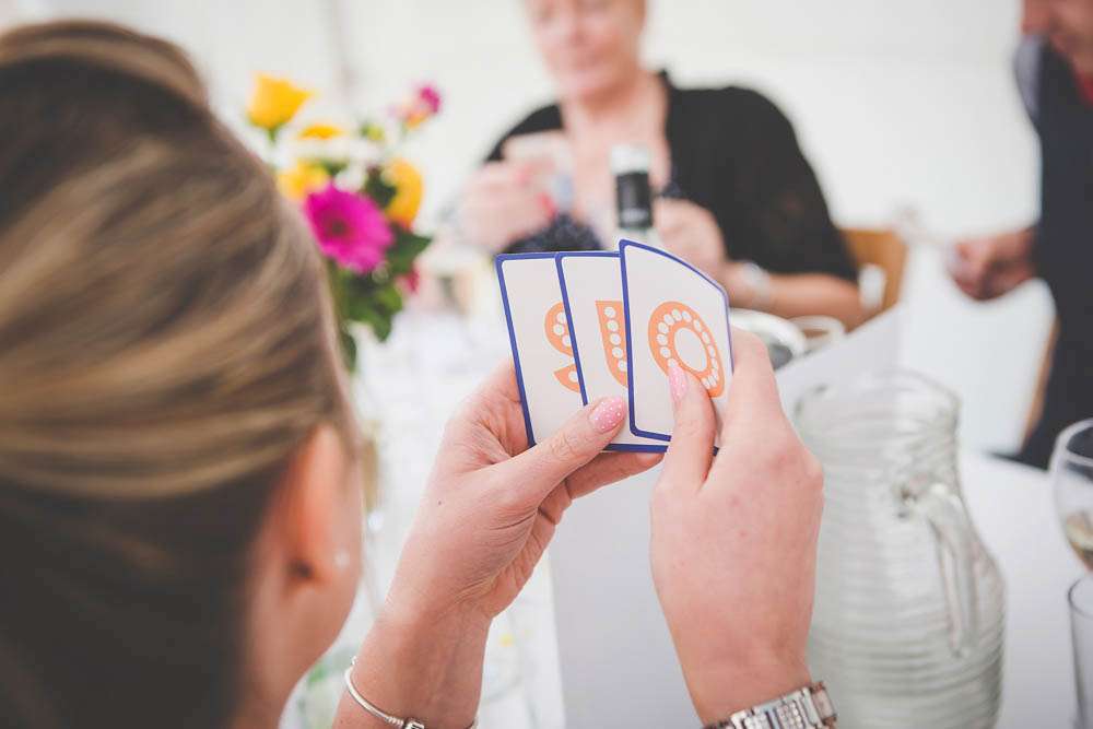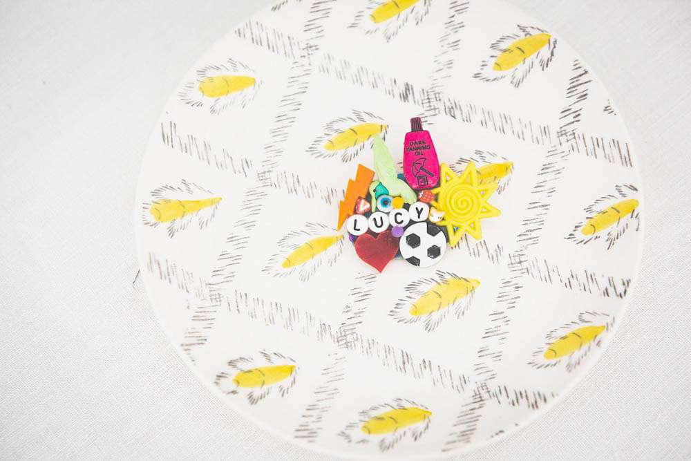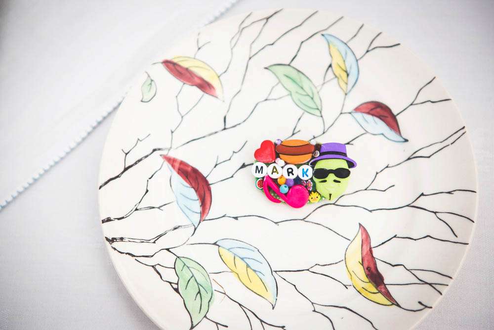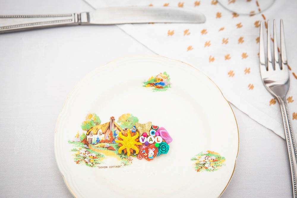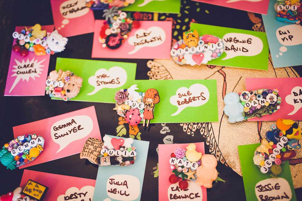 “We made individual name badges for our guests that featured some of their interests or a reference to something we’ve shared together. We cut up some colourful plastic cards as the badge base, added the guest’s name with necklace letter beads and items scoured from eBay and Etsy such as dolls house decorations, mini wine bottles and tiny sports equipment. Everyone loved them and they had the desired effect in encouraging people to interact with one another.”