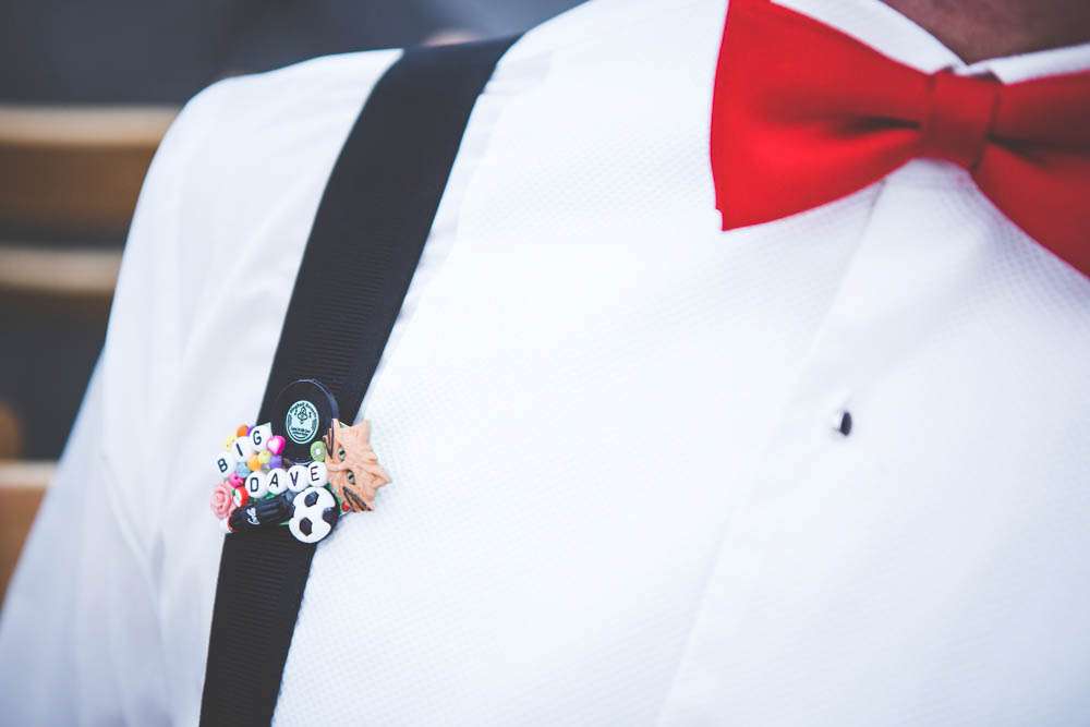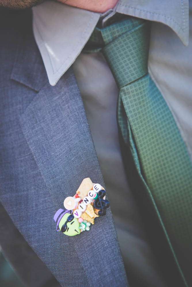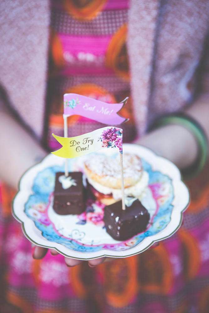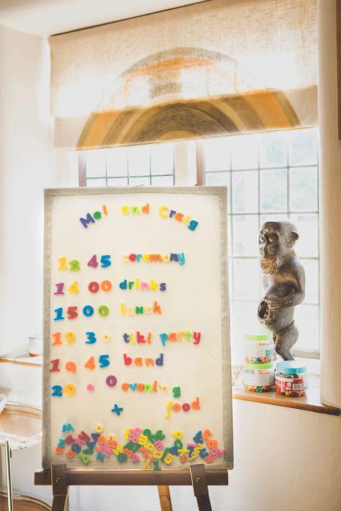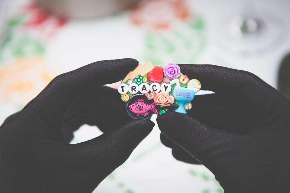 “We made individual name badges for our guests that featured some of their interests or a reference to something we’ve shared together. We cut up some colourful plastic cards as the badge base, added the guest’s name with necklace letter beads and items scoured from eBay and Etsy such as dolls house decorations, mini wine bottles and tiny sports equipment. Everyone loved them and they had the desired effect in encouraging people to interact with one another.”